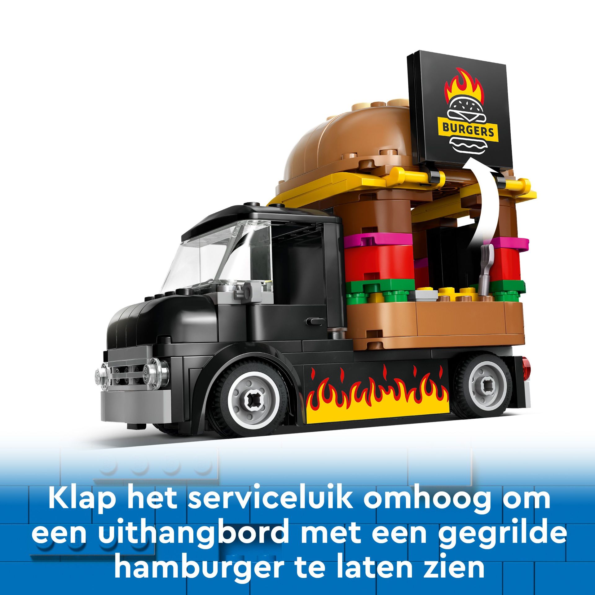 Deze LEGO City Hamburgertruck (60404) voor kinderen vanaf 5 jaar is een traktatie voor de jonge fantasie. Het mobiele fastfoodrestaurant ziet eruit als een gigantische burger en kan van de speelgoed vrachtwagen worden losgemaakt. Inclusief een keukengedeelte, sausflessen en een serviceluik dat open kan om een uithangbord te laten verschijnen. Deze keukenset bevat ook minifiguren van een verkoper en een klant met een gehoorapparaat, plus accessoires, zoals speelgoed eten.