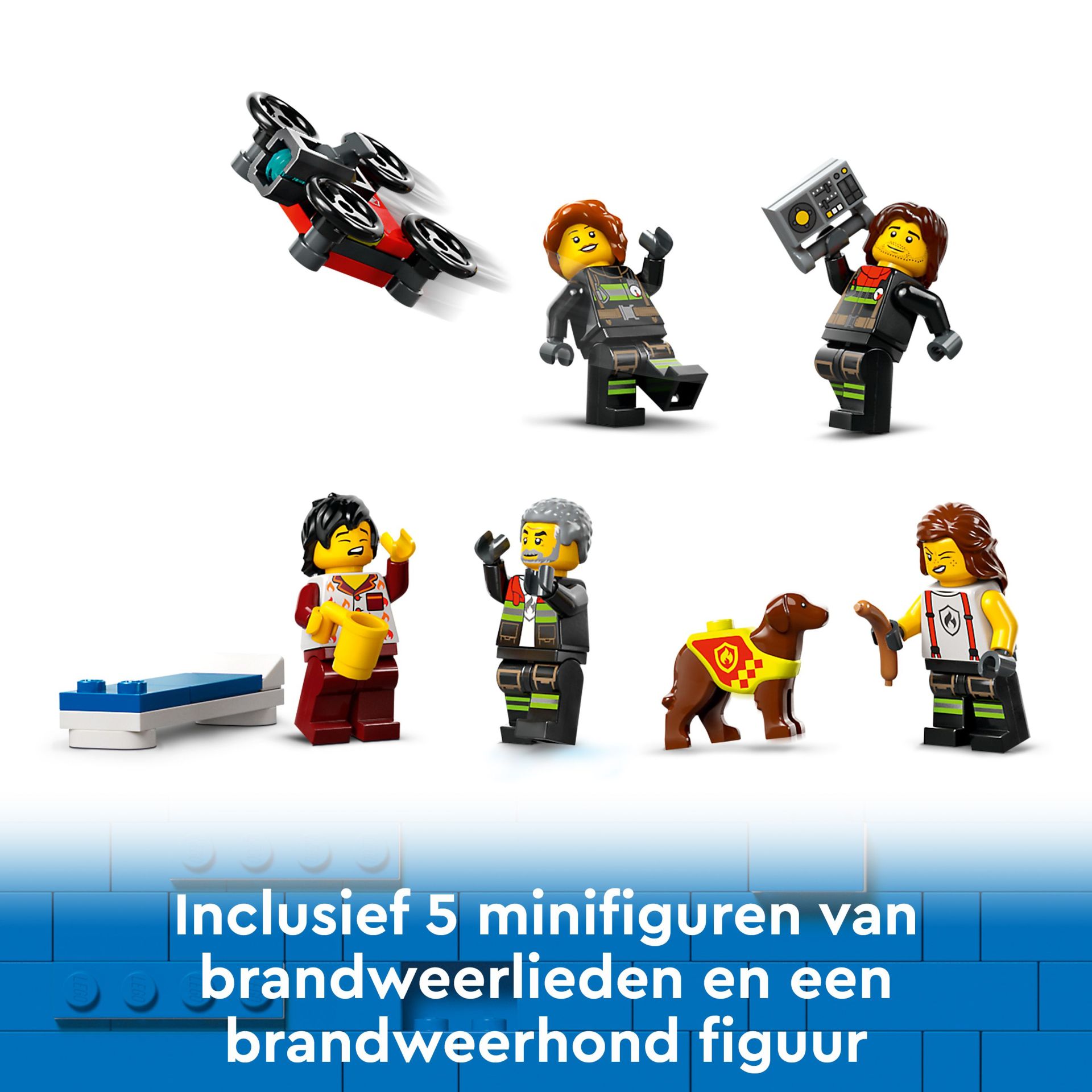 minifiguren van brandweerlieden en brandweerhond voor urenlange actie.