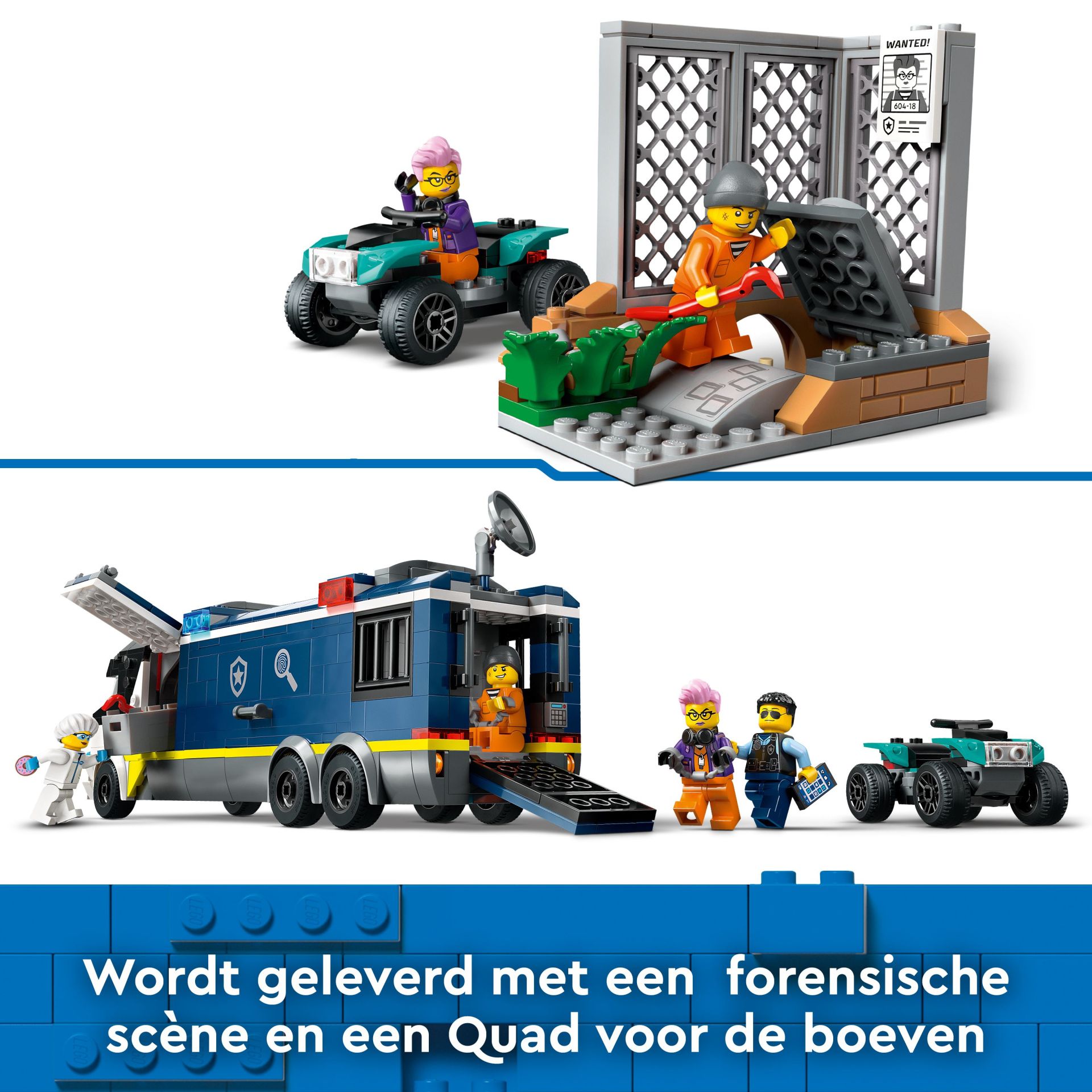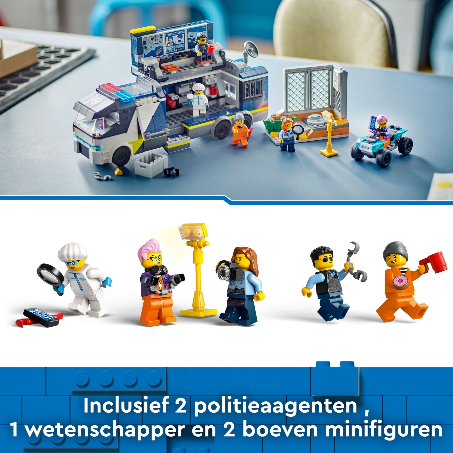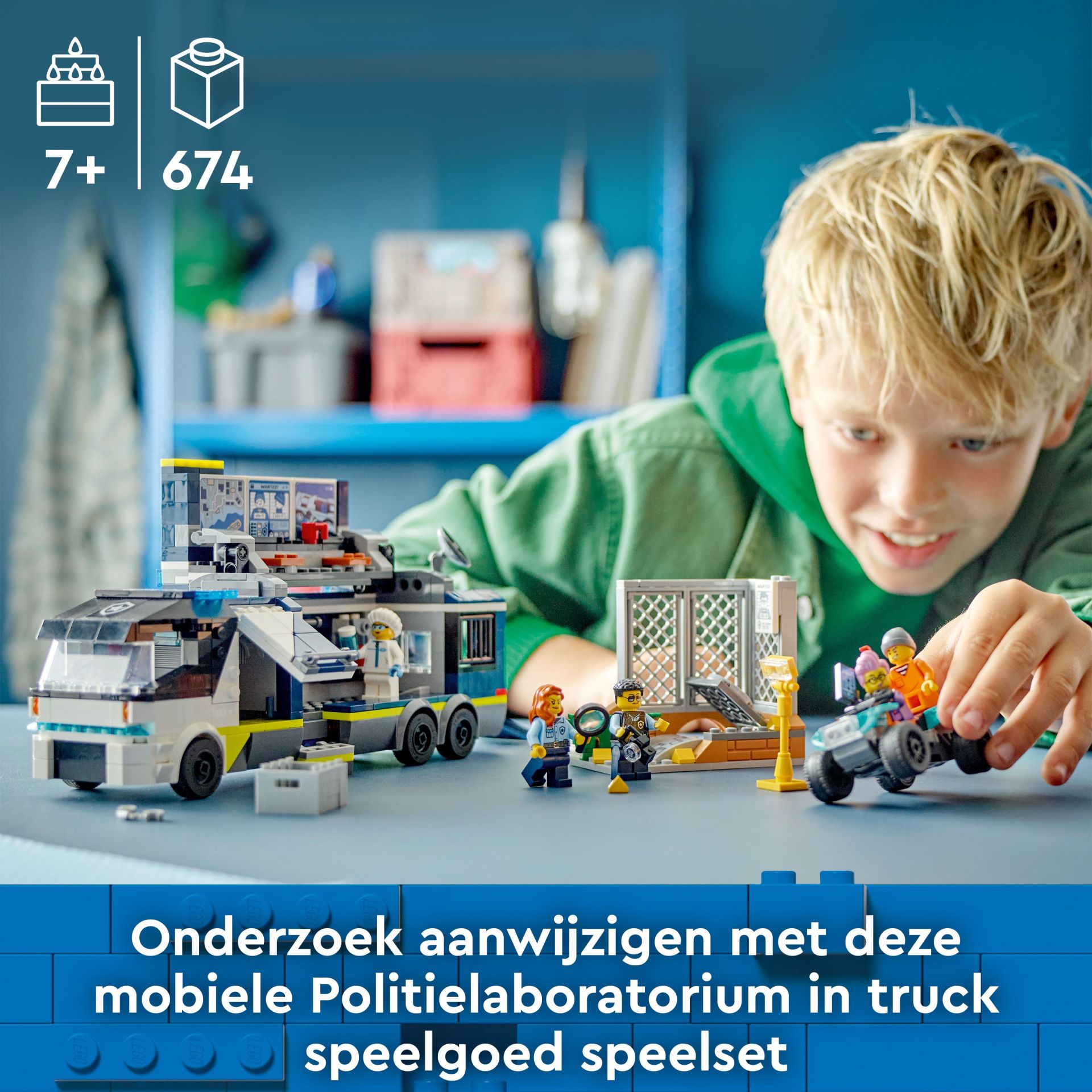 Sporenonderzoek naar voortvluchtige boeven? Dat is een klus voor de agenten in het LEGO City Politielaboratorium in truck (60418). Deze coole speelgoed truck voor kinderen vanaf 7 jaar bevat een laboratorium van 2 verdiepingen met werkplekken, een kaart, bewakingscamera's, een microscoop, een koffiezetapparaat en een cel. Er is ook een forensische scène en de quad van de boeven, plus LEGO minifiguren van 2 politieagenten, 1 wetenschapper en 2 boeven.