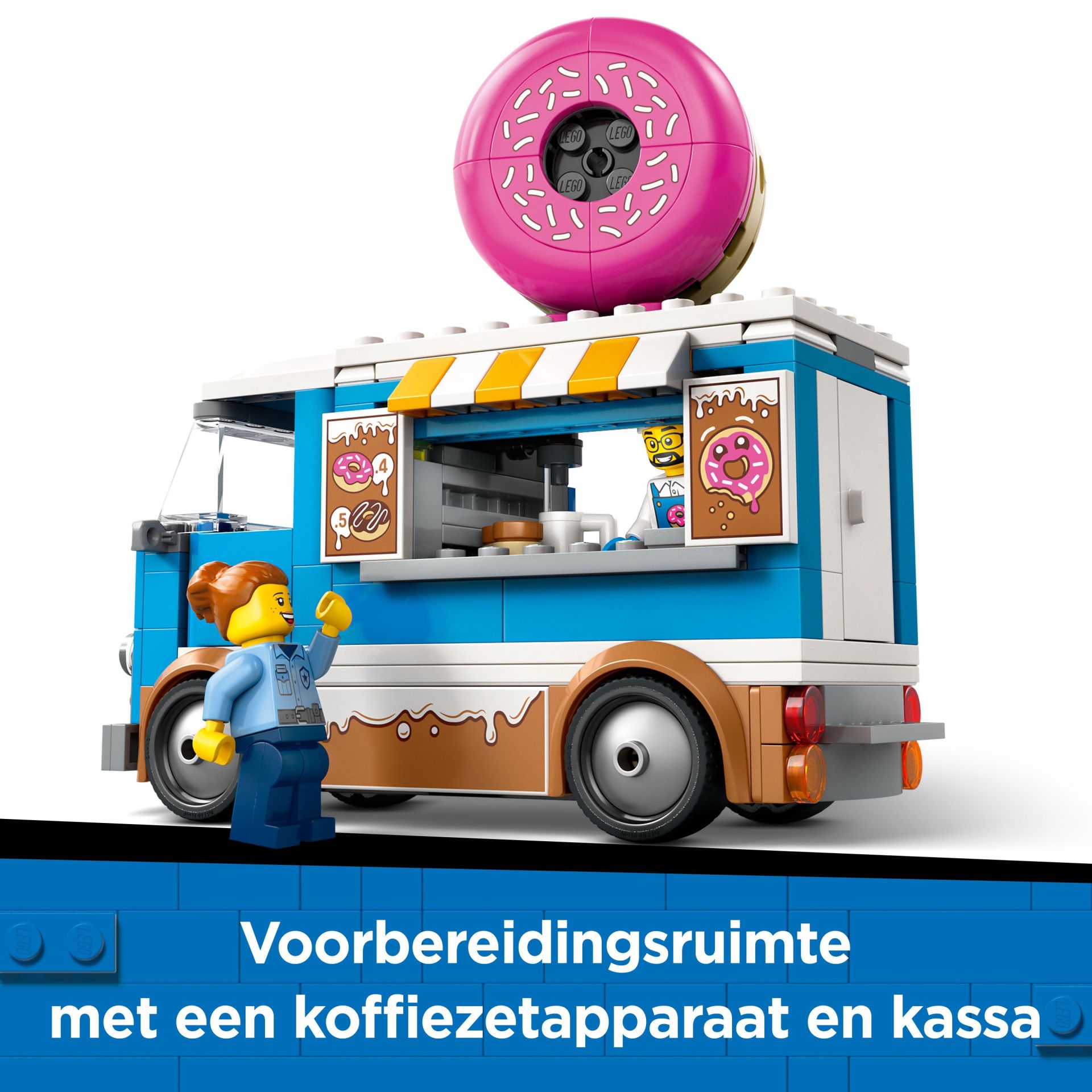 Wat zit er in de doos? – deze speelgoedset bevat alles wat kinderen nodig hebben om een donuttruck met afneembare kiosk te maken, plus minifiguren van een verkoper en klant en diverse accessoires
