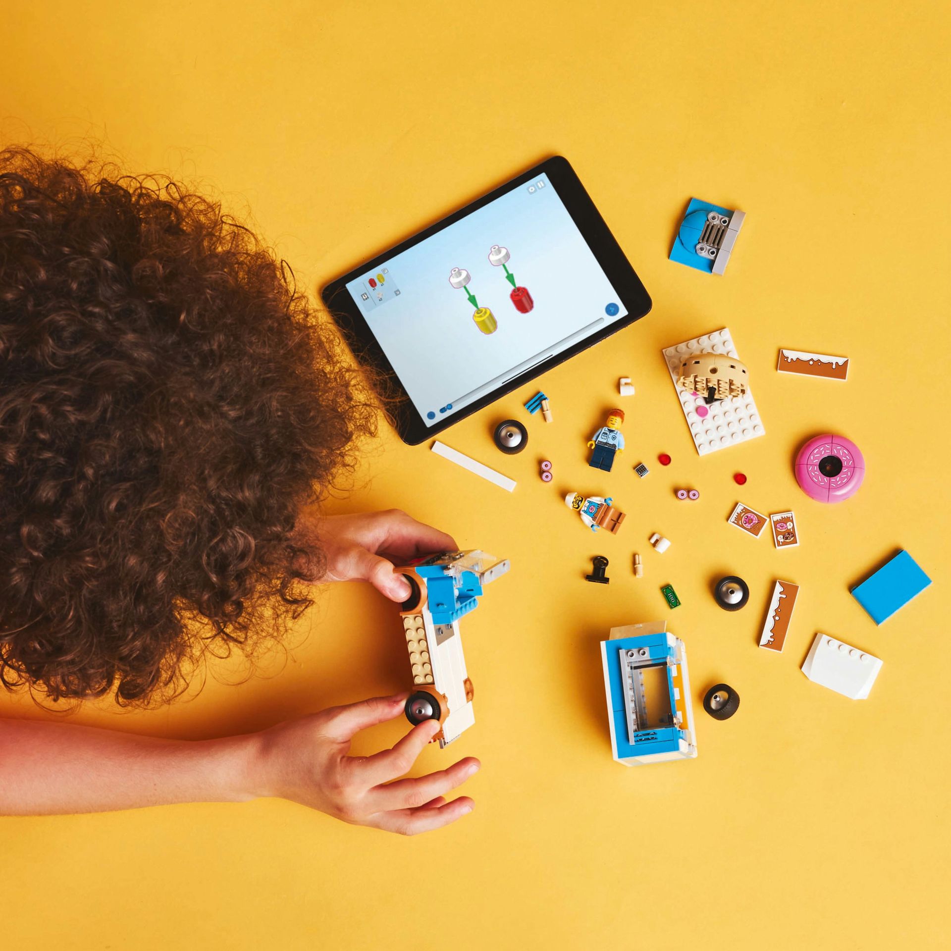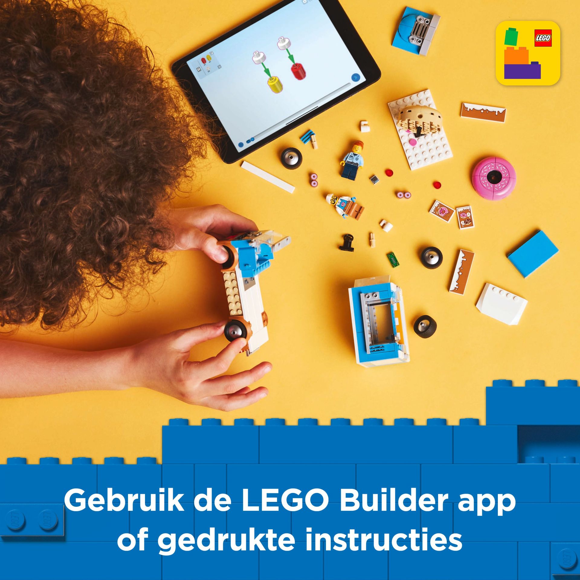 In de doos vind je bouwinstructies voor de mobiele LEGO donutwinkel. Of gebruik de LEGO Builder app waar kinderen sets kunnen ontdekken en opslaan, hun bouwvoortgang kunnen bijhouden en kunnen zoomen en draaien om modellen vanuit alle hoeken te bekijken terwijl ze bouwen.