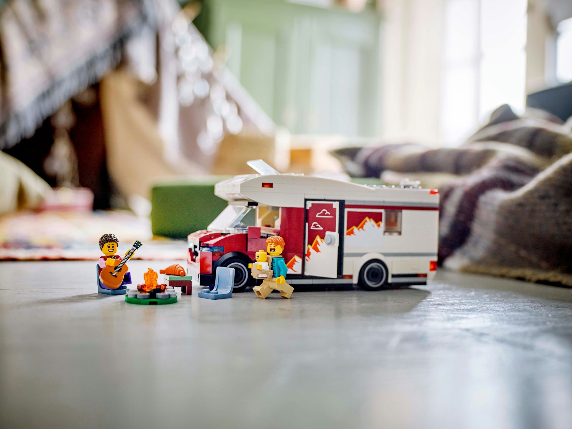 Wat zit er in de doos? – deze LEGO voertuig set bevat alles wat kinderen nodig hebben om een camper te bouwen met een gedetailleerde woonruimte, plus een kampvuur, 2 minifiguren en een baby