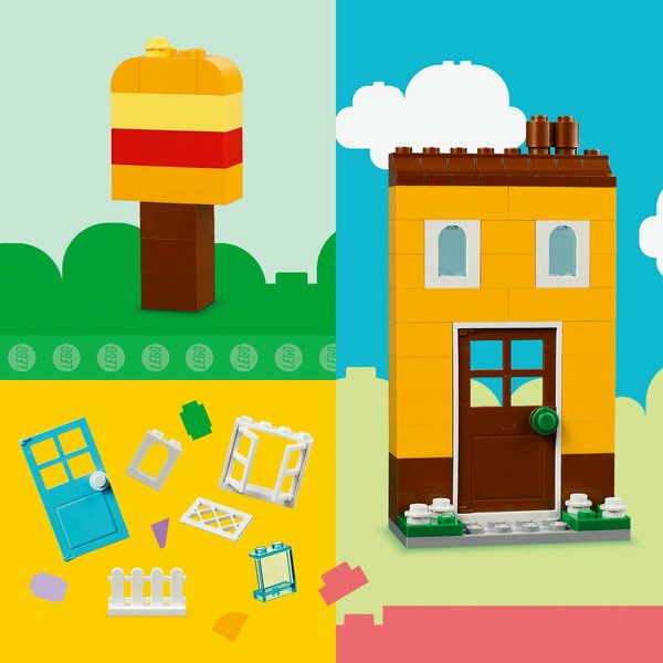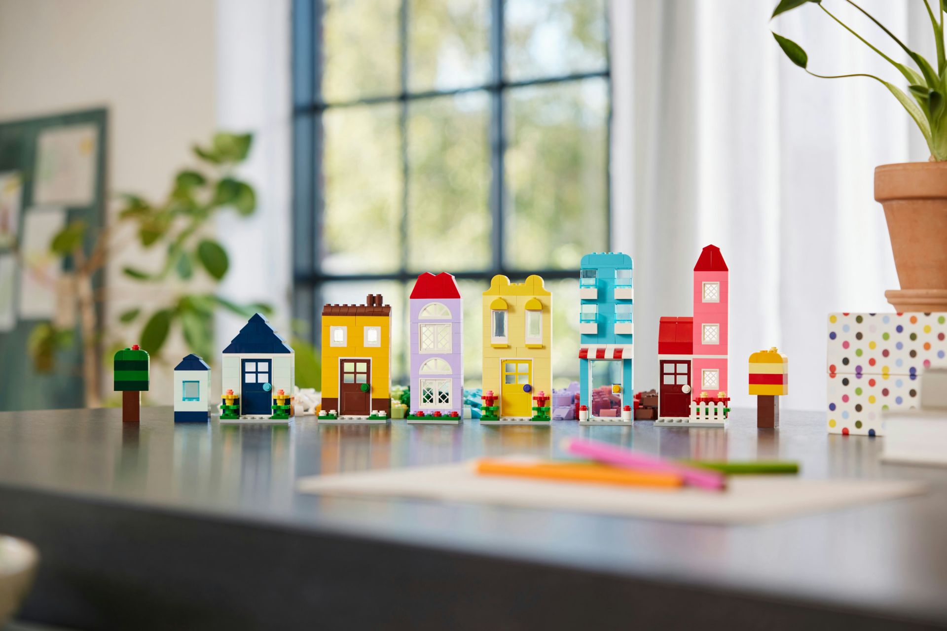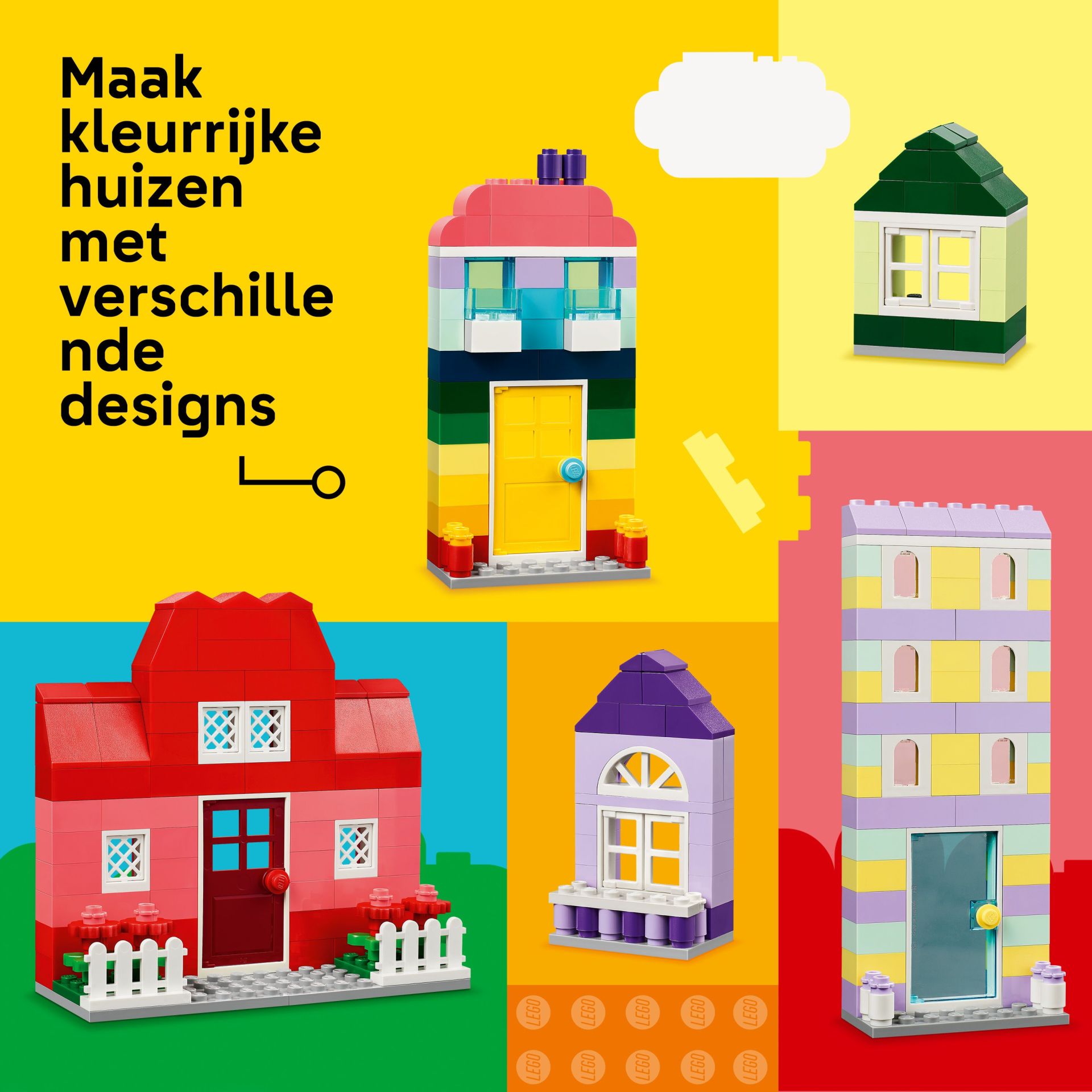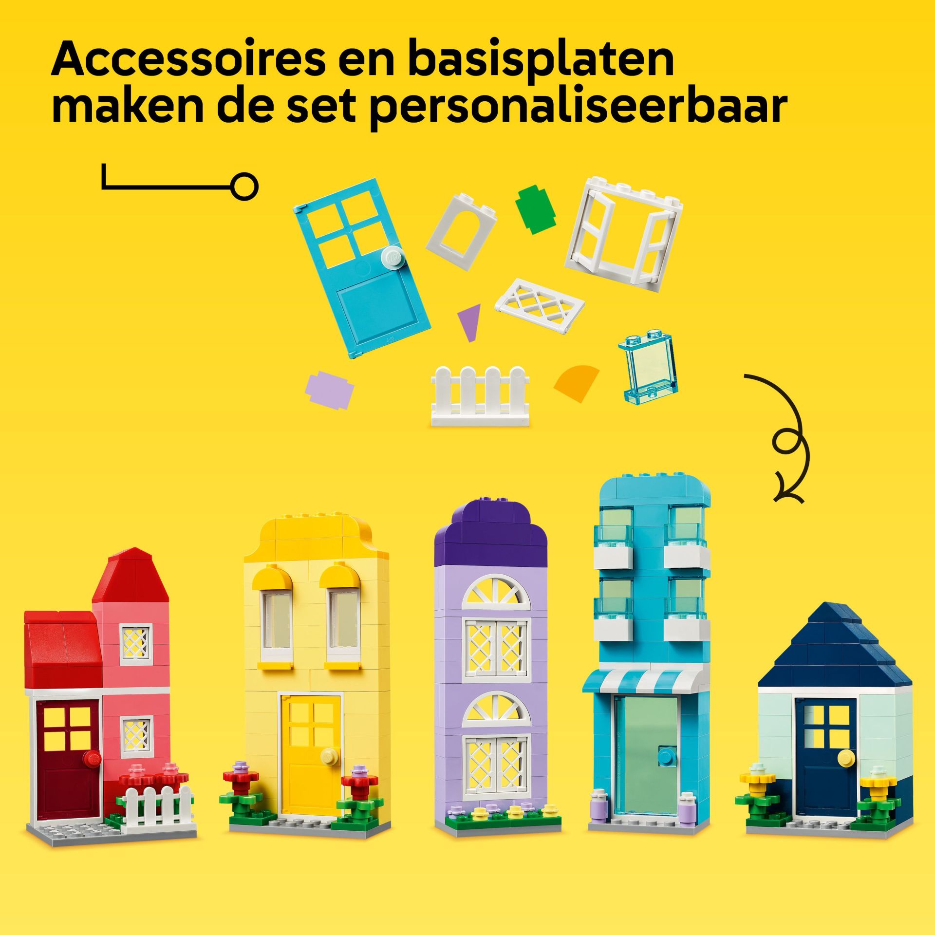 Er zijn eenvoudige instructies om 6 verschillende modellen van speelgoed huizen te bouwen. Daarna kunnen kinderen hun huizen hoger maken en deuren, ramen, daken, tuinen en meer verwisselen om het ontwerp van elk huis te veranderen. De set bevat 8 ideeën die kinderen inspireren hun modellen nog verder uit te breiden. Ook kunnen ze één extra groot LEGO huis bouwen met veel onderdelen uit de set. Instructies zijn ook te vinden in de LEGO Builder app, waarmee kinderen kunnen inzoomen, modellen kunnen draaien en hun voortgang kunnen bijhouden.