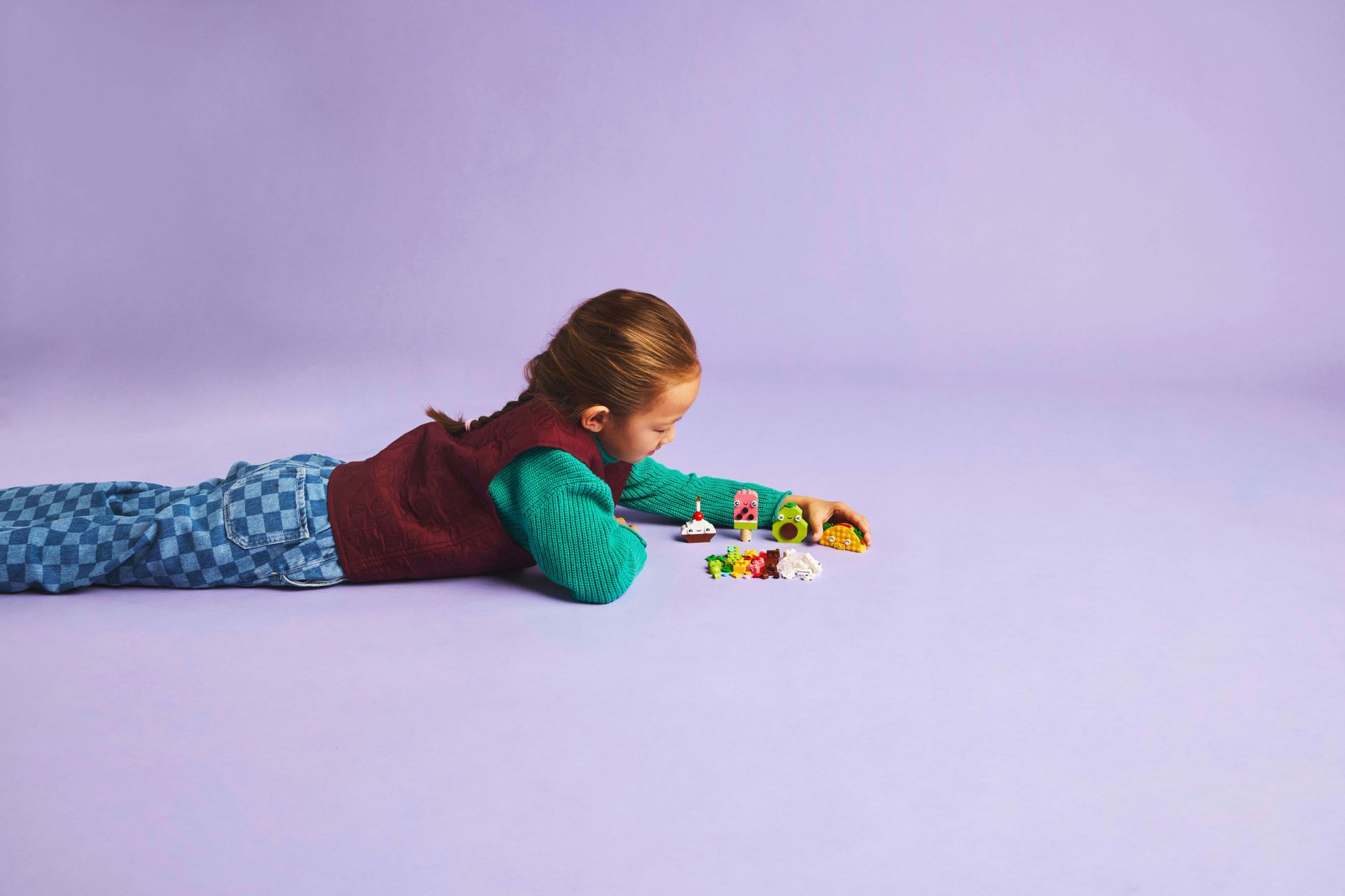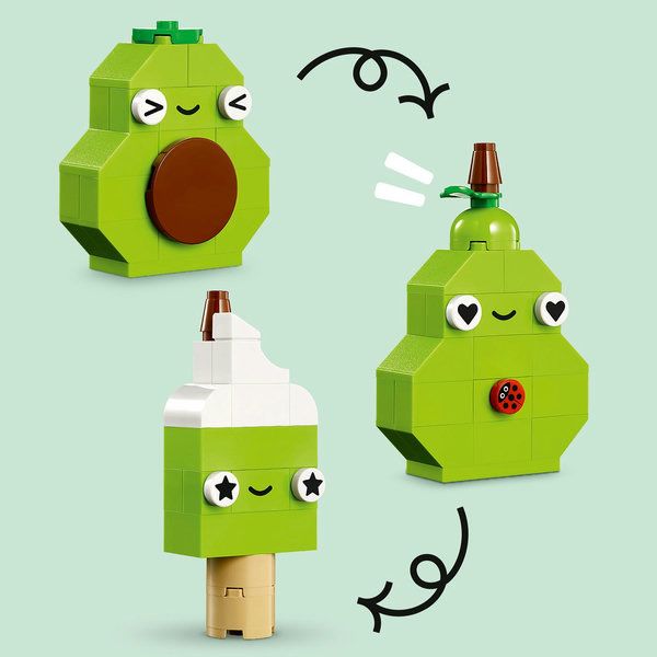Kinderen gebruiken de kleurrijke LEGO stenen en speciale onderdelen – zoals ogen, monden en decoratieve elementen – om 4 schattige etensvriendjes te bouwen: een cupcake, een ijsje, een avocado en een taco. Daarna kunnen ze de stenen combineren en de modellen ombouwen tot een taart met hagelslag, bubbelthee, een peer en een tosti.