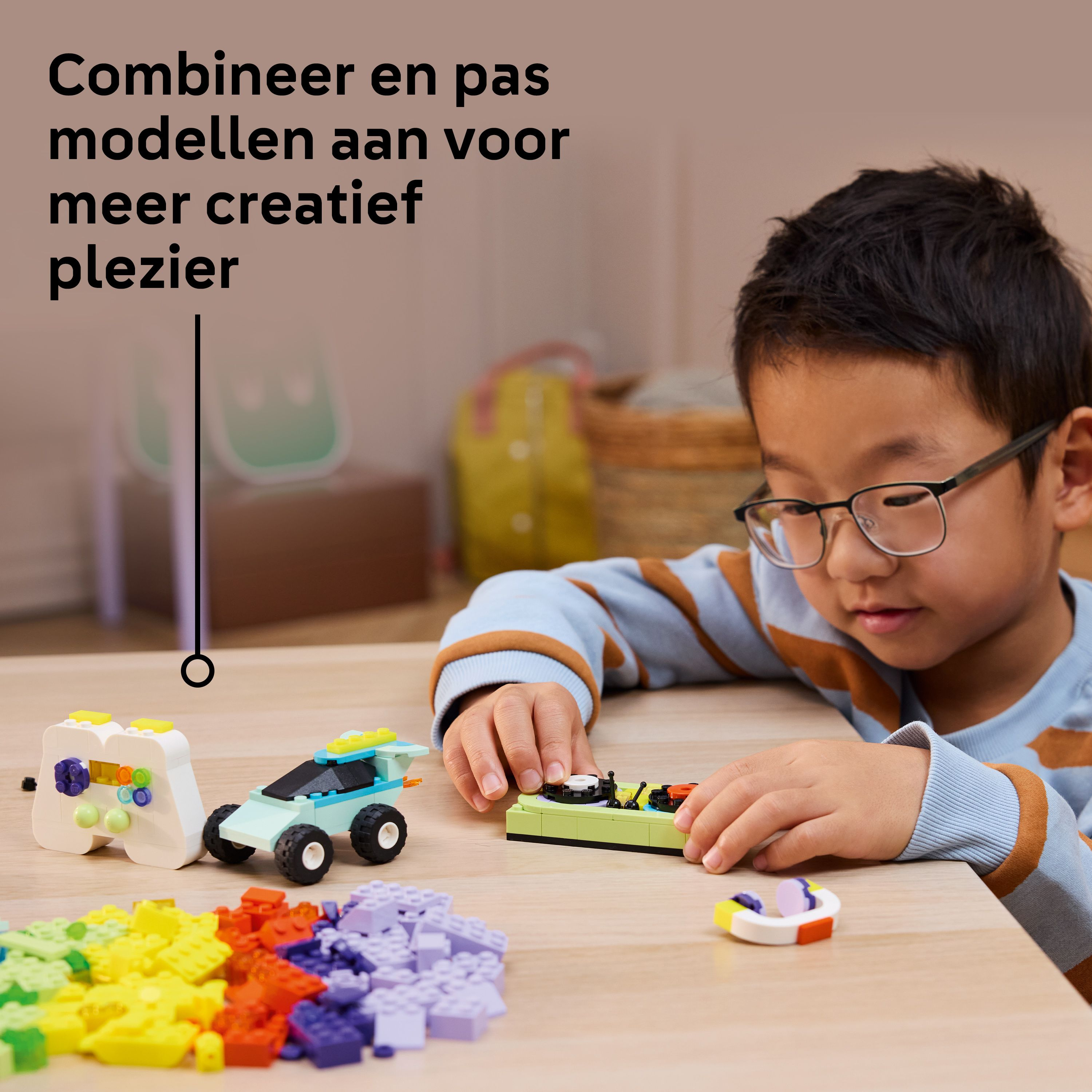 Met veel kleurrijke stenen, plus ogen, wielen en scharnieren is dit een heel veelzijdige set. De bouwbare speelgoedmodellen zijn een gamecontroller, een dinosaurus met een bril, een mobiele telefoon die je kunt openen en sluiten, een skateboard, een monstertruck en een dj-set met een koptelefoon.