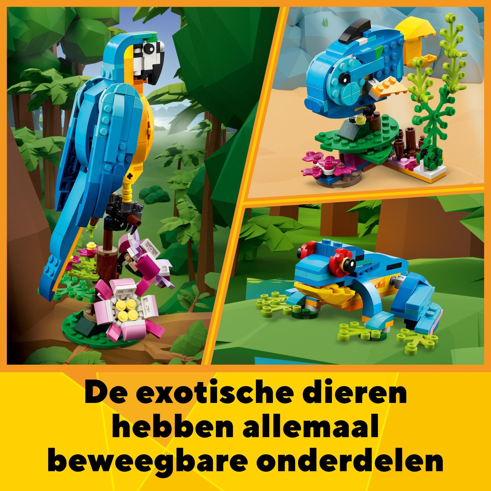 Deze LEGO Creator 3in1 jungle dieren speelgoed set voor kinderen vanaf 7 jaar bestaat uit een papegaai op een boomtak, een kikker en een vis