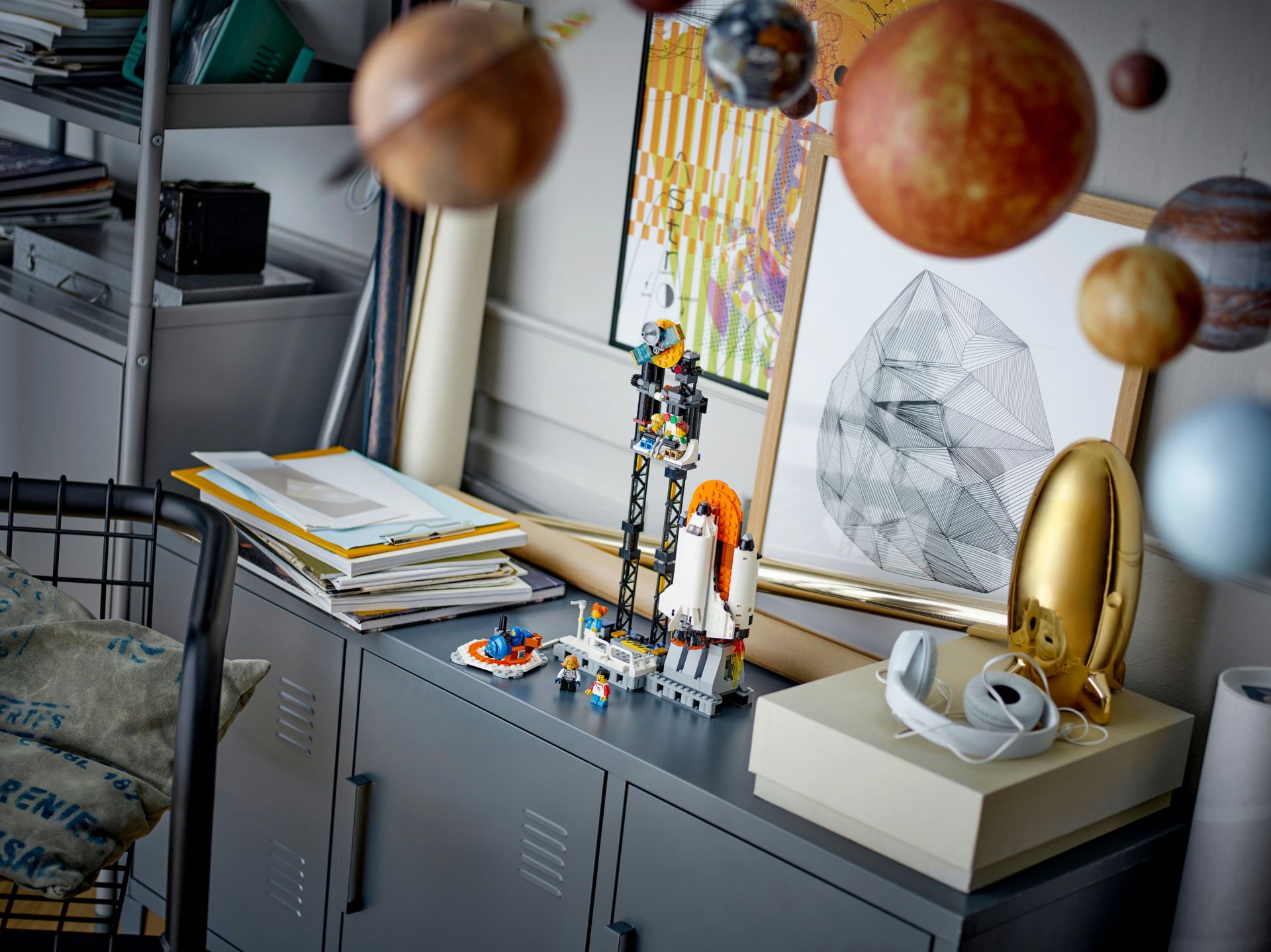 ruimteraket, modellen van Saturnus en de aarde, een maanbasis en een