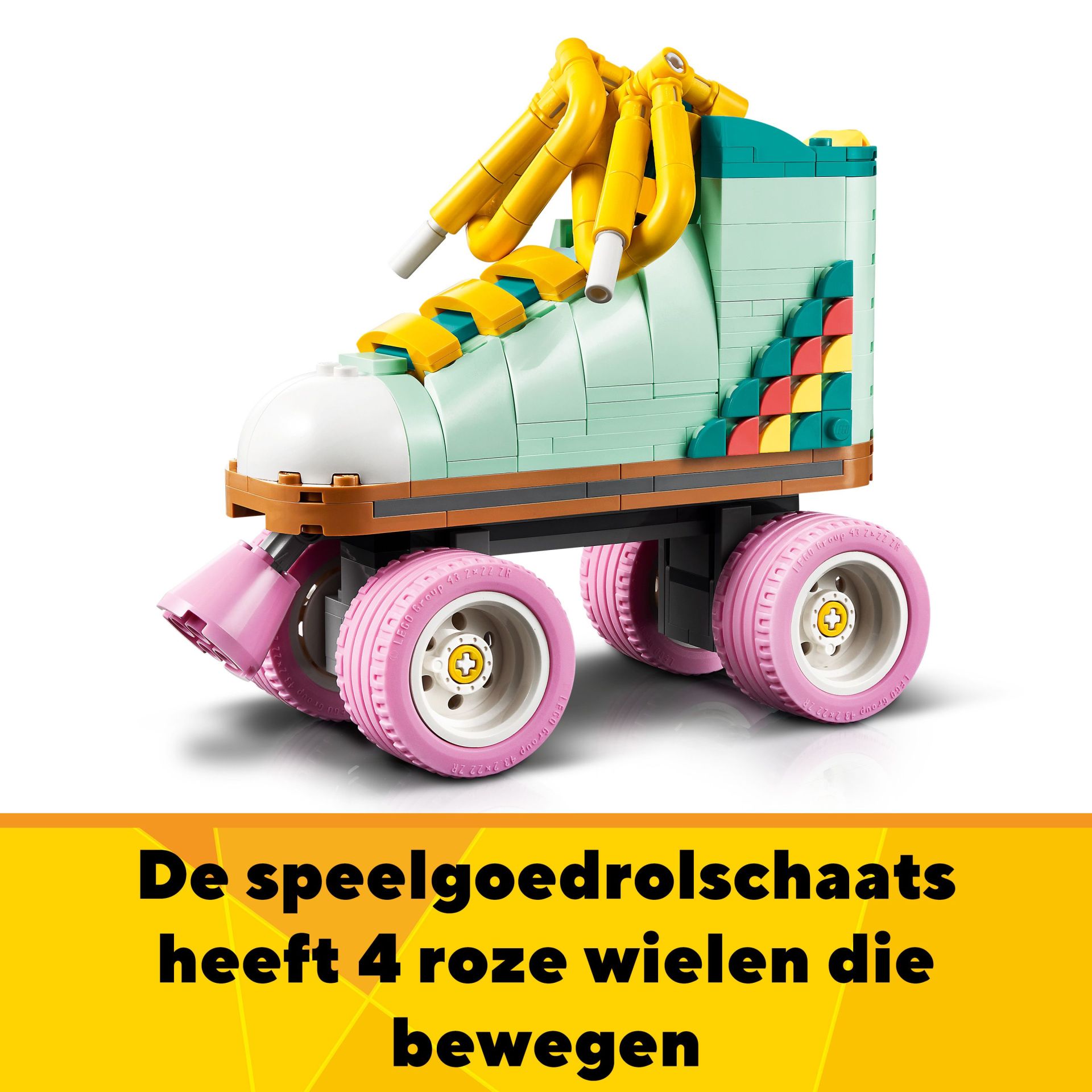 een LEGO rolschaats met 4 beweegbare roze wielen, een roze stop, brede