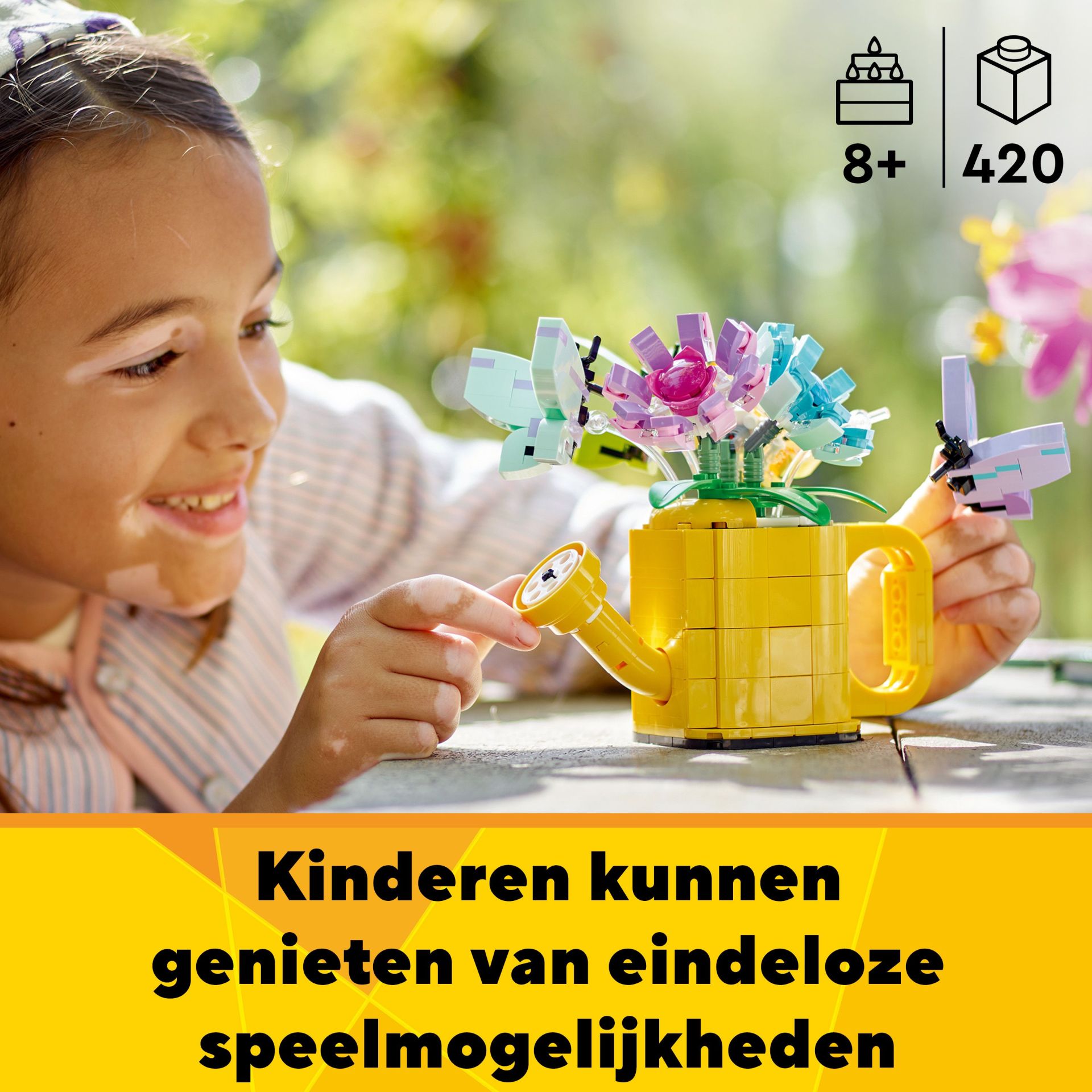 Bouwen en herbouwen, spelen en neerzetten: het kan allemaal met deze LEGO Creator 3in1 Bloemen in gieter (31149) set met 3 kleurrijke modellen geïnspireerd op de natuur. De 3in1 set bestaat uit een bouwbare gele speelgoed gieter met een handvat en een tuit, gevuld met 3 LEGO bloemen met beweegbare bloemblaadjes en 3 speelgoed vlinders op transparante stokjes zodat het lijkt alsof ze vliegen.