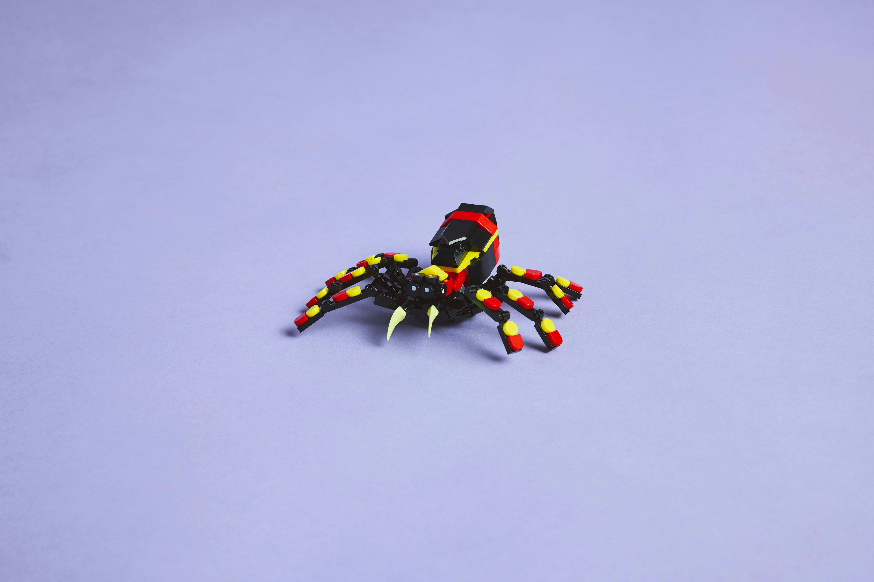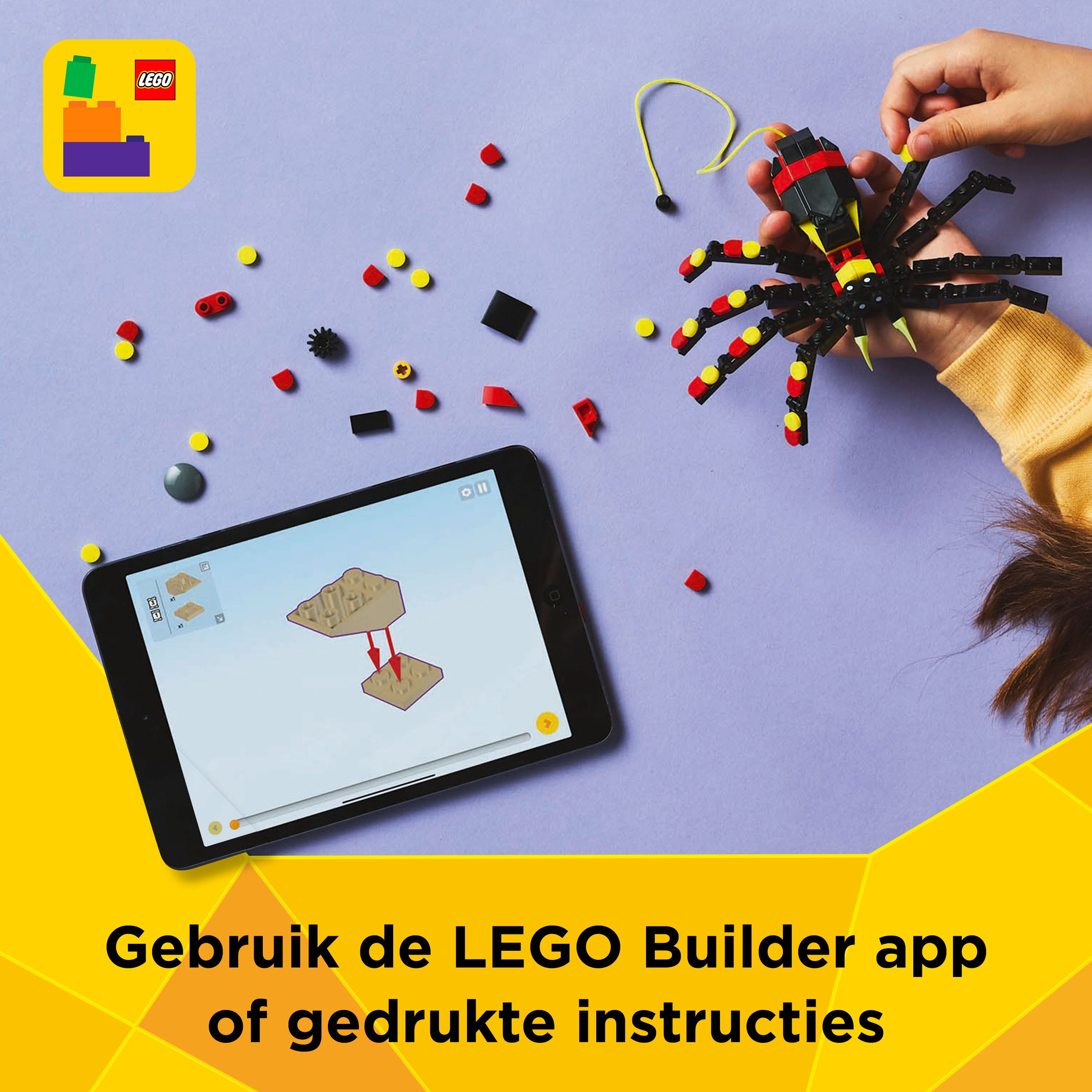 LEGO spinnenset om mee te spelen en neer te zetten – na het spelen kunnen dierenfiguren worden neergezet en kinderen kunnen een neongeel web uit de rug van de spin trekken om het aan een LEGO steen te hangen