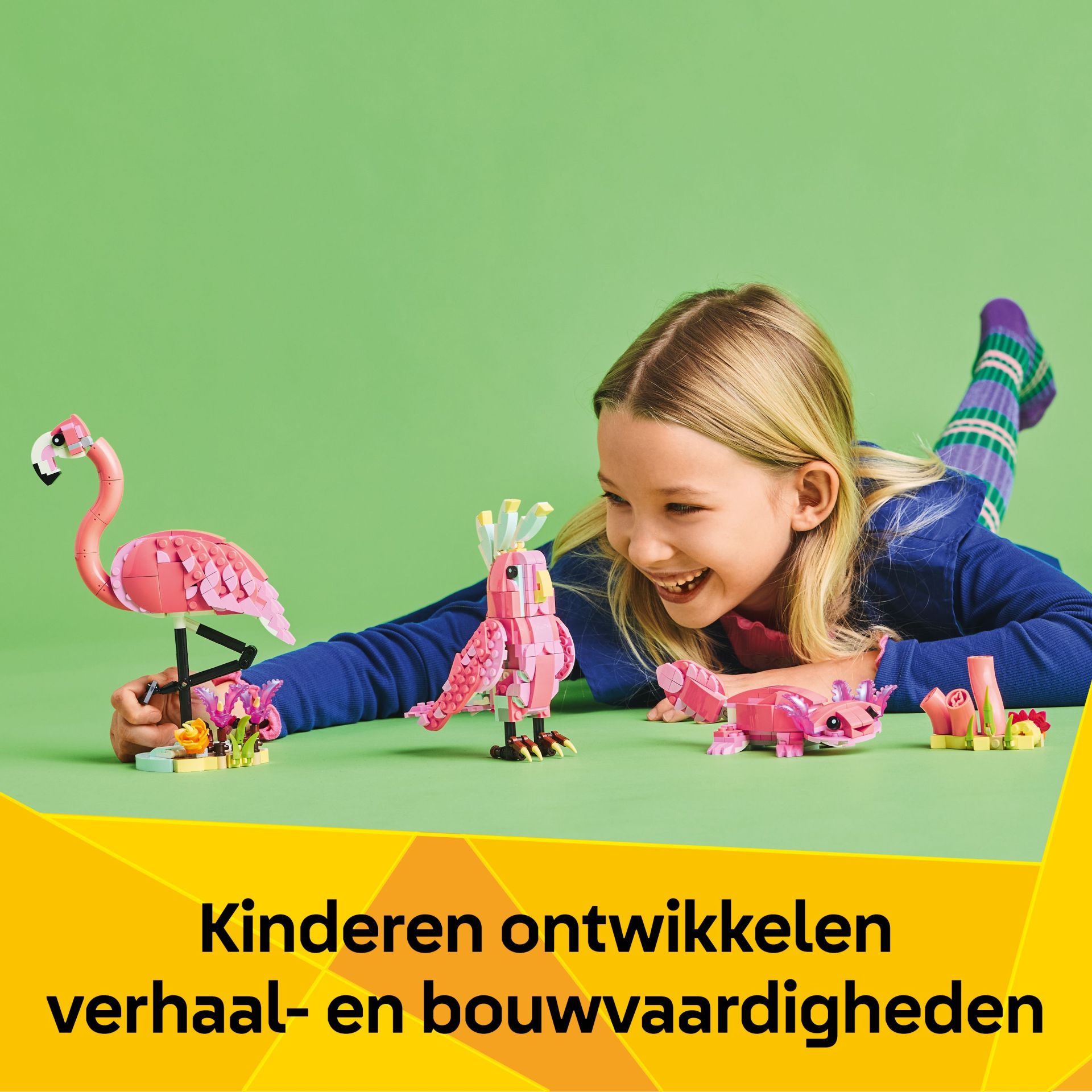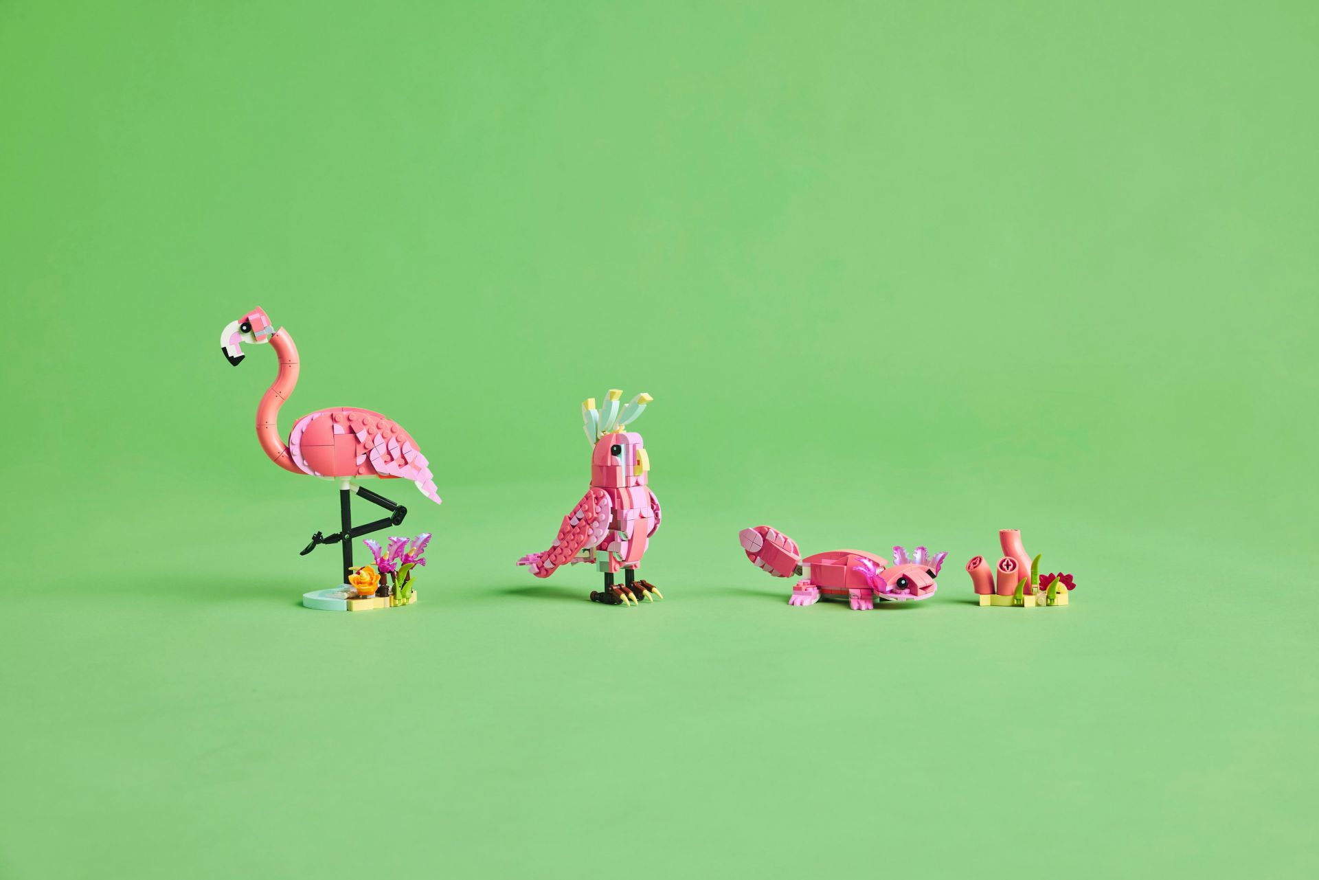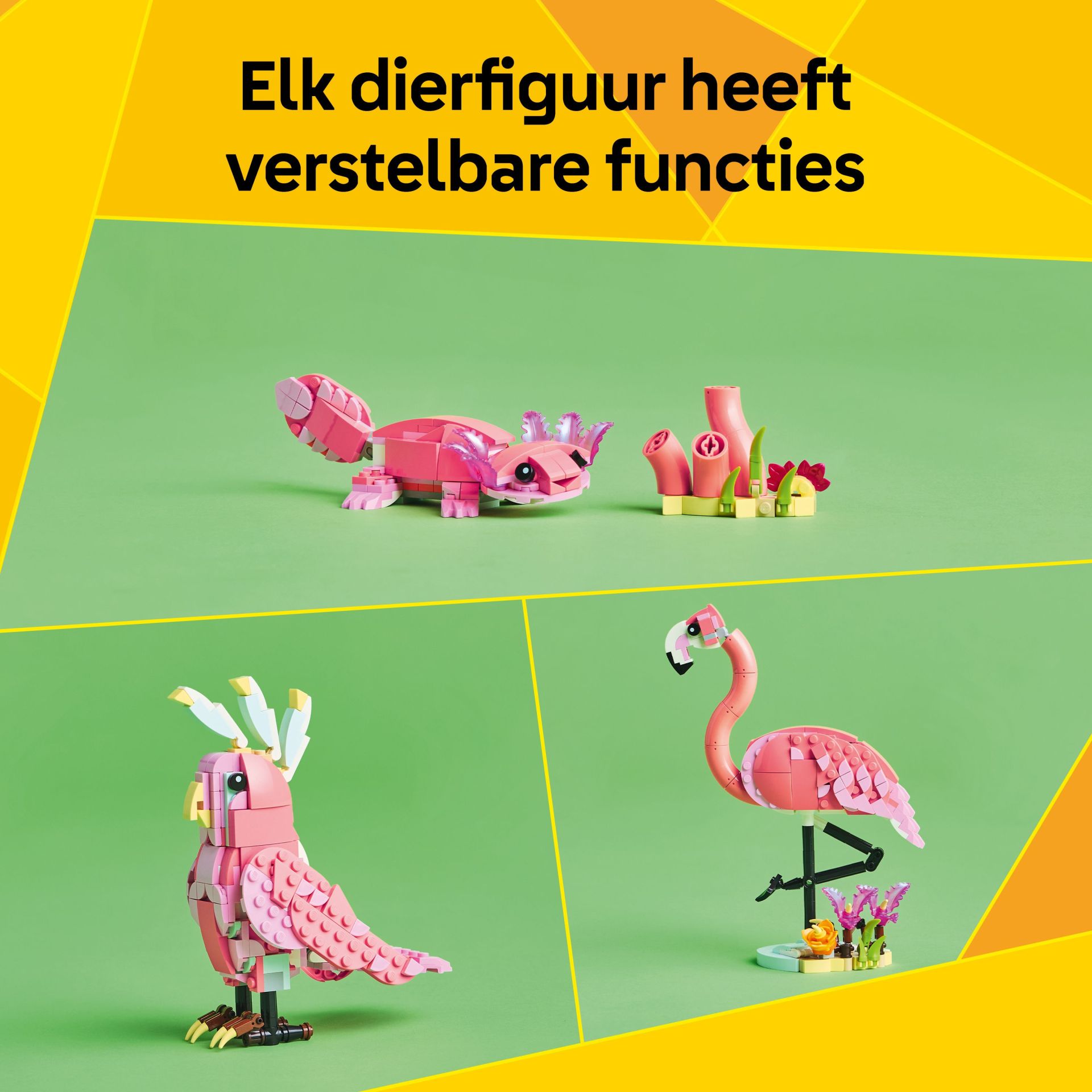 Met deze LEGO set krijgen kinderen 3 verschillende bouwmogelijkheden met dezelfde set stenen: een roze flamingo met een beweegbare kop op een met planten bedekte standaard, een verstelbare roze kaketoe die zijn kop 360 graden kan draaien of een schattige verstelbare roze axolotl met onderwaterplanten.