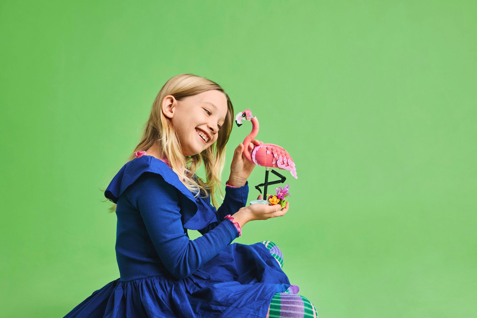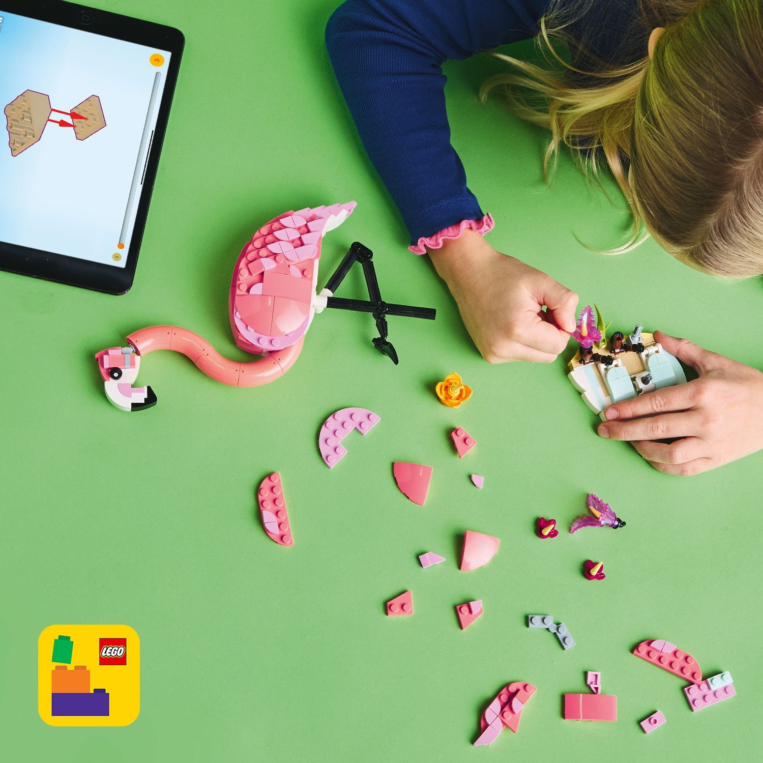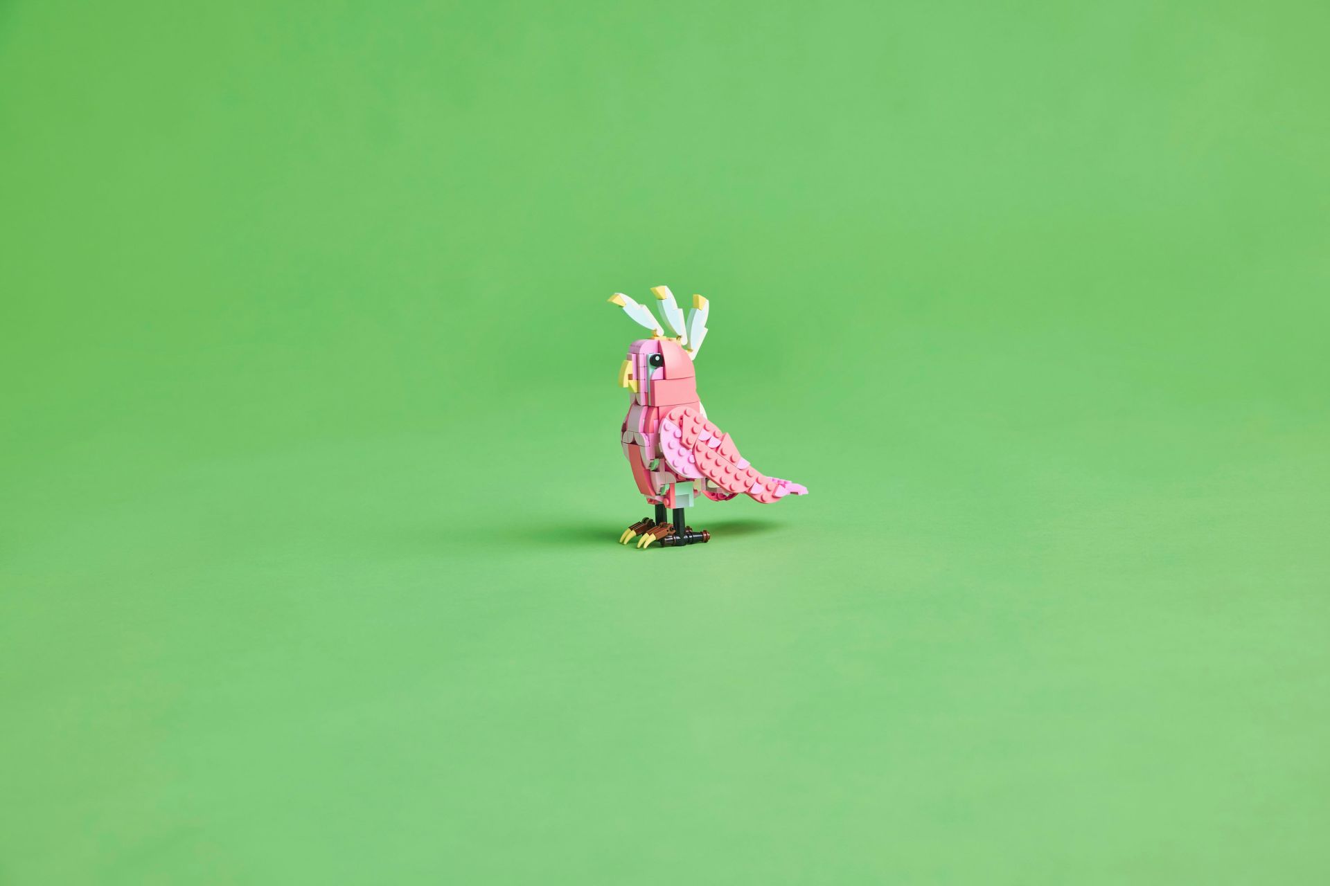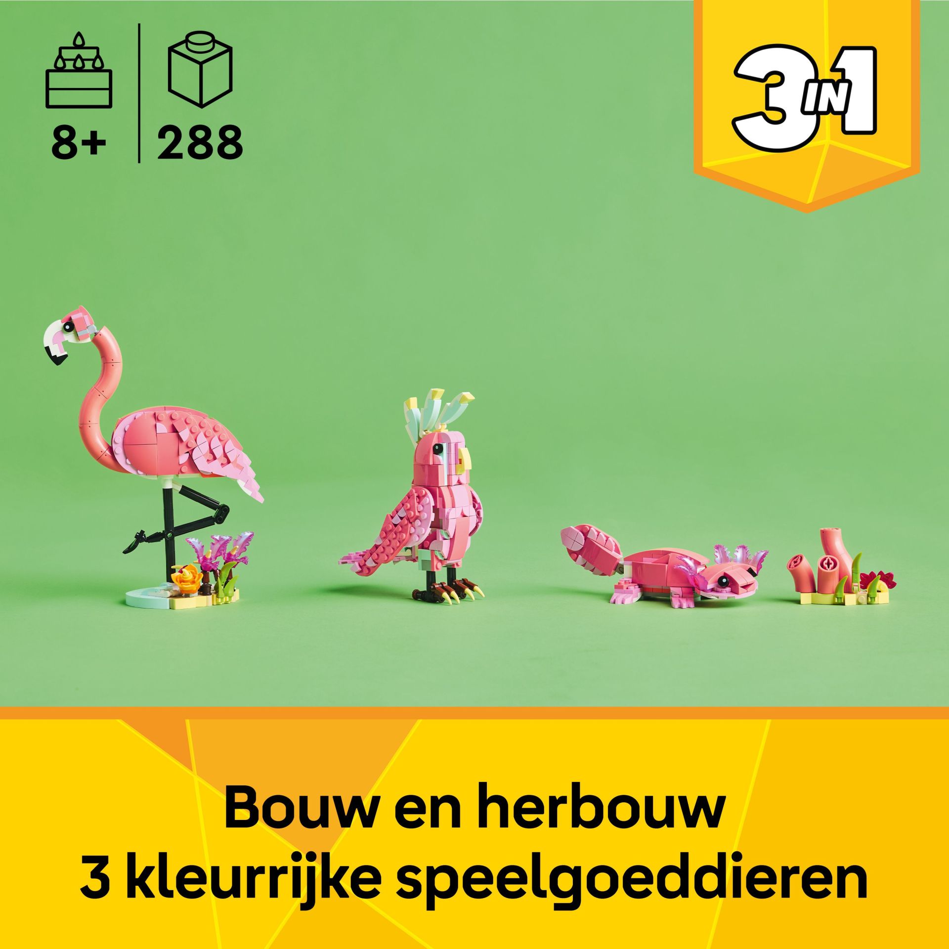 Met deze LEGO set krijgen kinderen 3 verschillende bouwmogelijkheden met dezelfde set stenen: een roze flamingo met een beweegbare kop op een met planten bedekte standaard, een verstelbare roze kaketoe die zijn kop 360 graden kan draaien of een schattige verstelbare roze axolotl met onderwaterplanten.