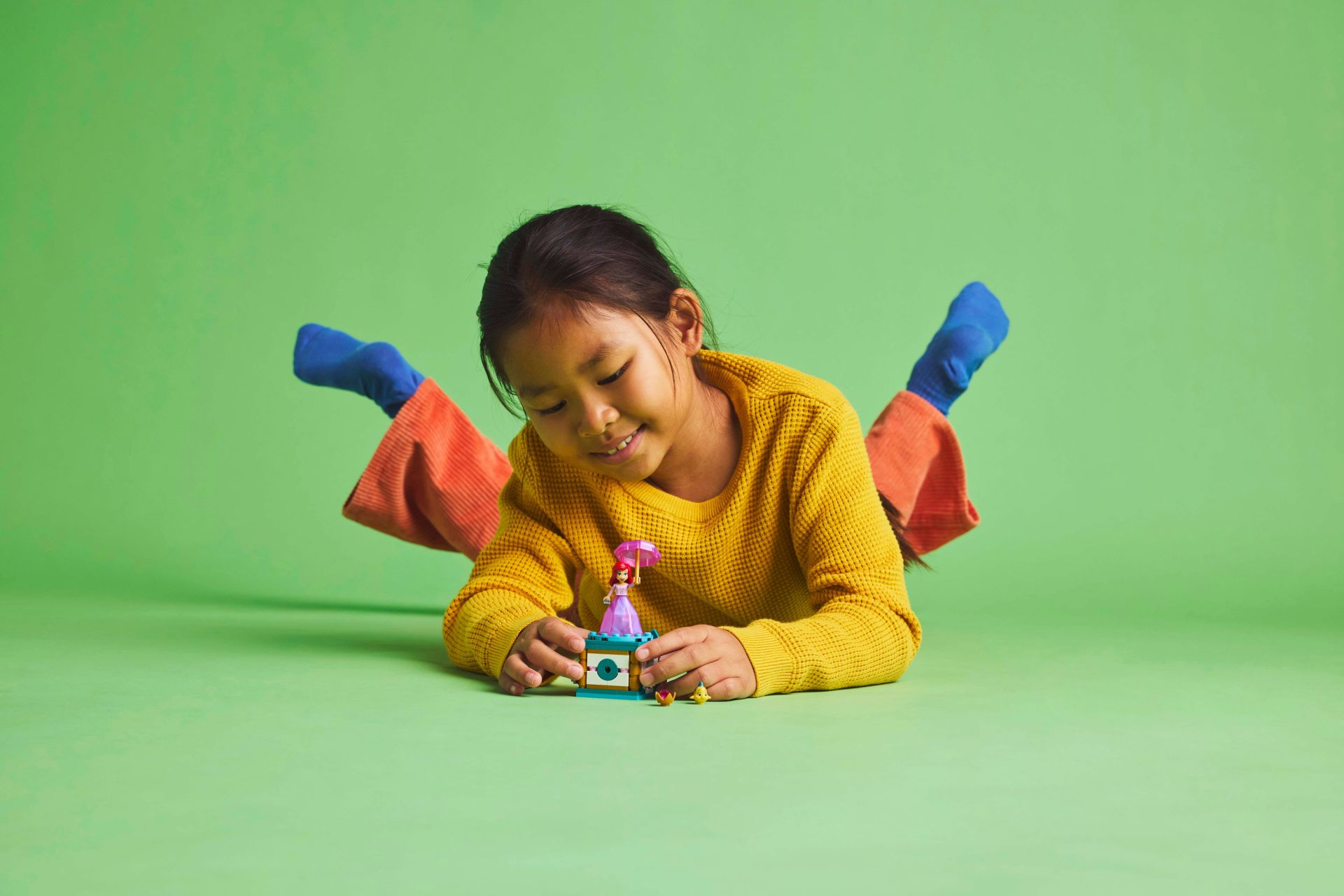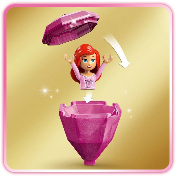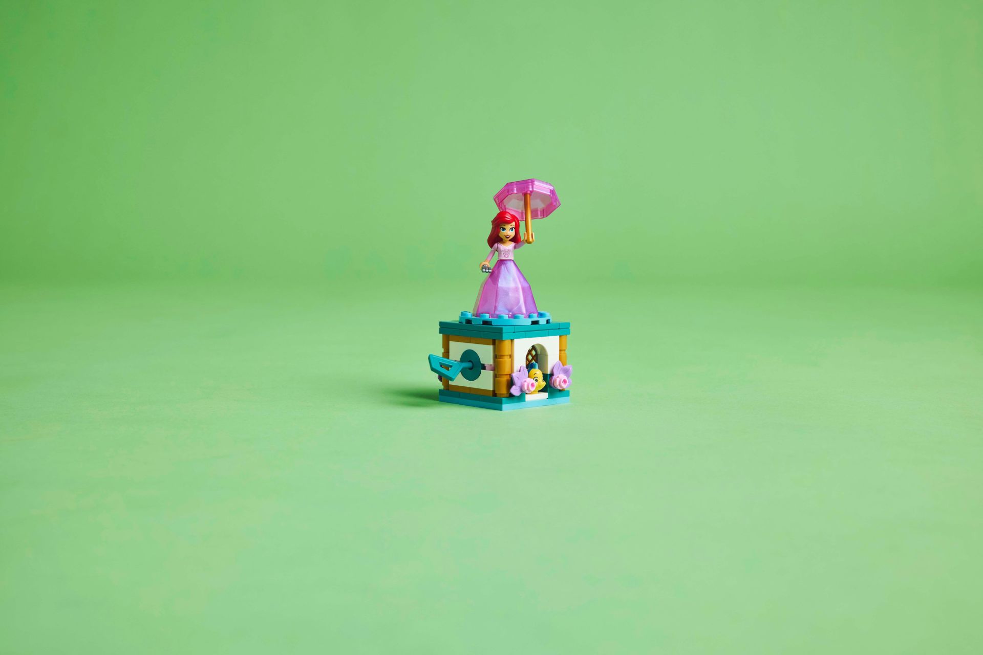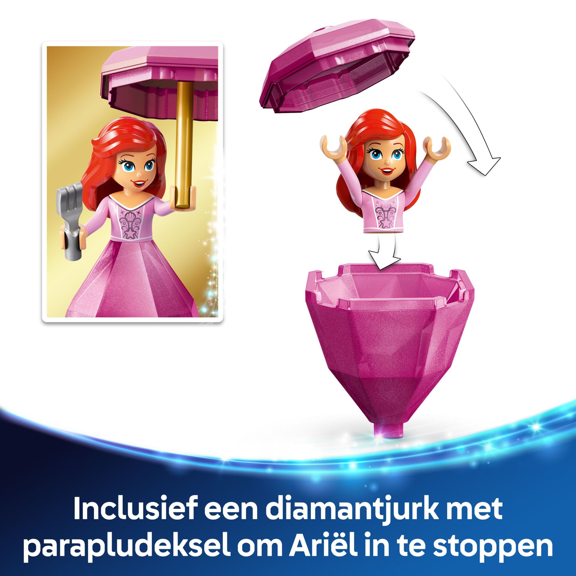- Boeiend speelgoed voor 5 jaar en ouder – draai de sleutel aan de standaard om het plateau met Ariël erop te laten draaien en berg daarna het LEGO ǀ Disney poppetje op in de 'diamanten' jurk met de paraplu als deksel