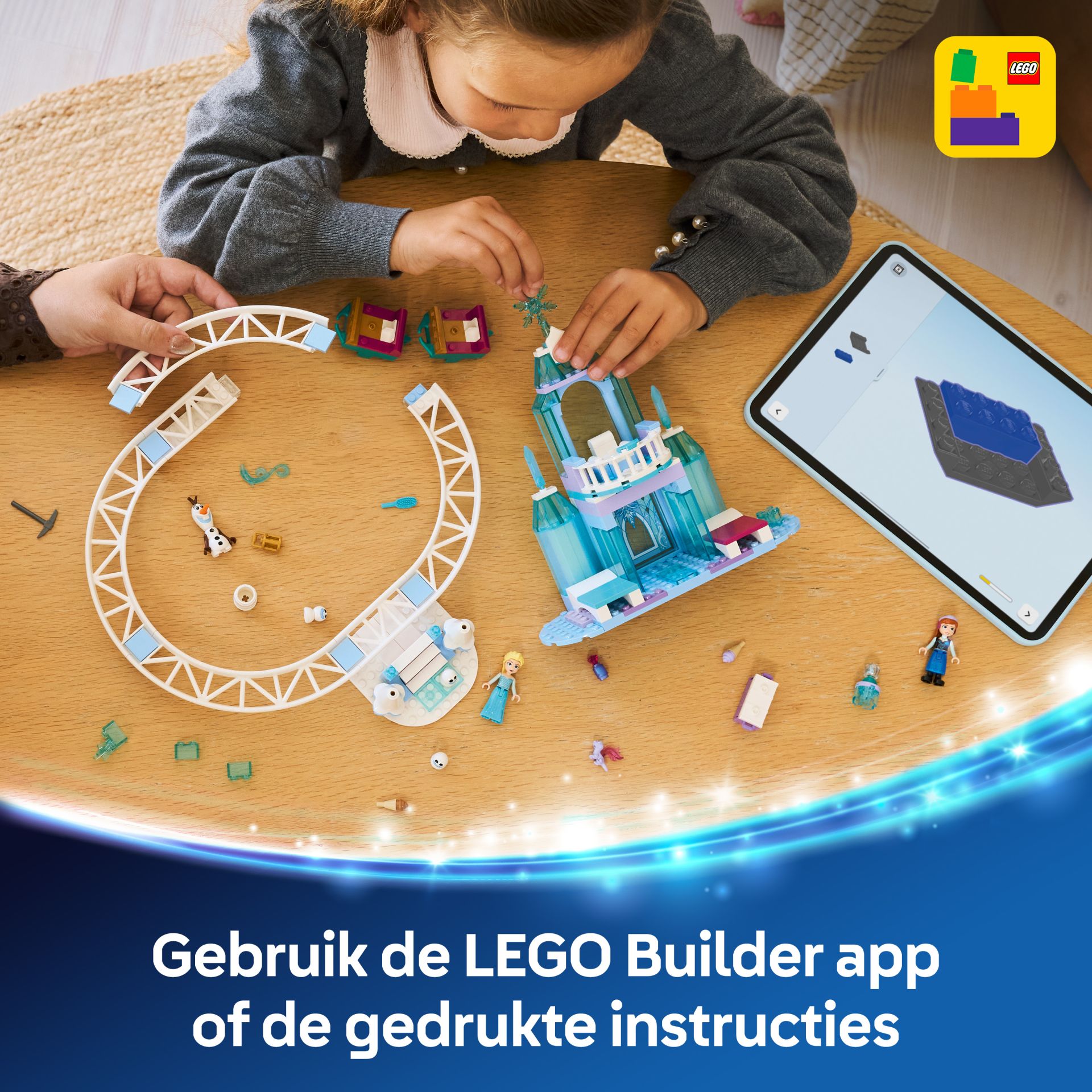 KASTEEL MET SPOOR EN SLEE – deze Elsa's ijskasteel en sneeuwrit (43281) bouwset bevat 7 LEGO® ǀ Disney Frozen figuren, een kasteel van 2 verdiepingen, een spoorbaan met 3 sleekarretjes, een trap en nog veel meer