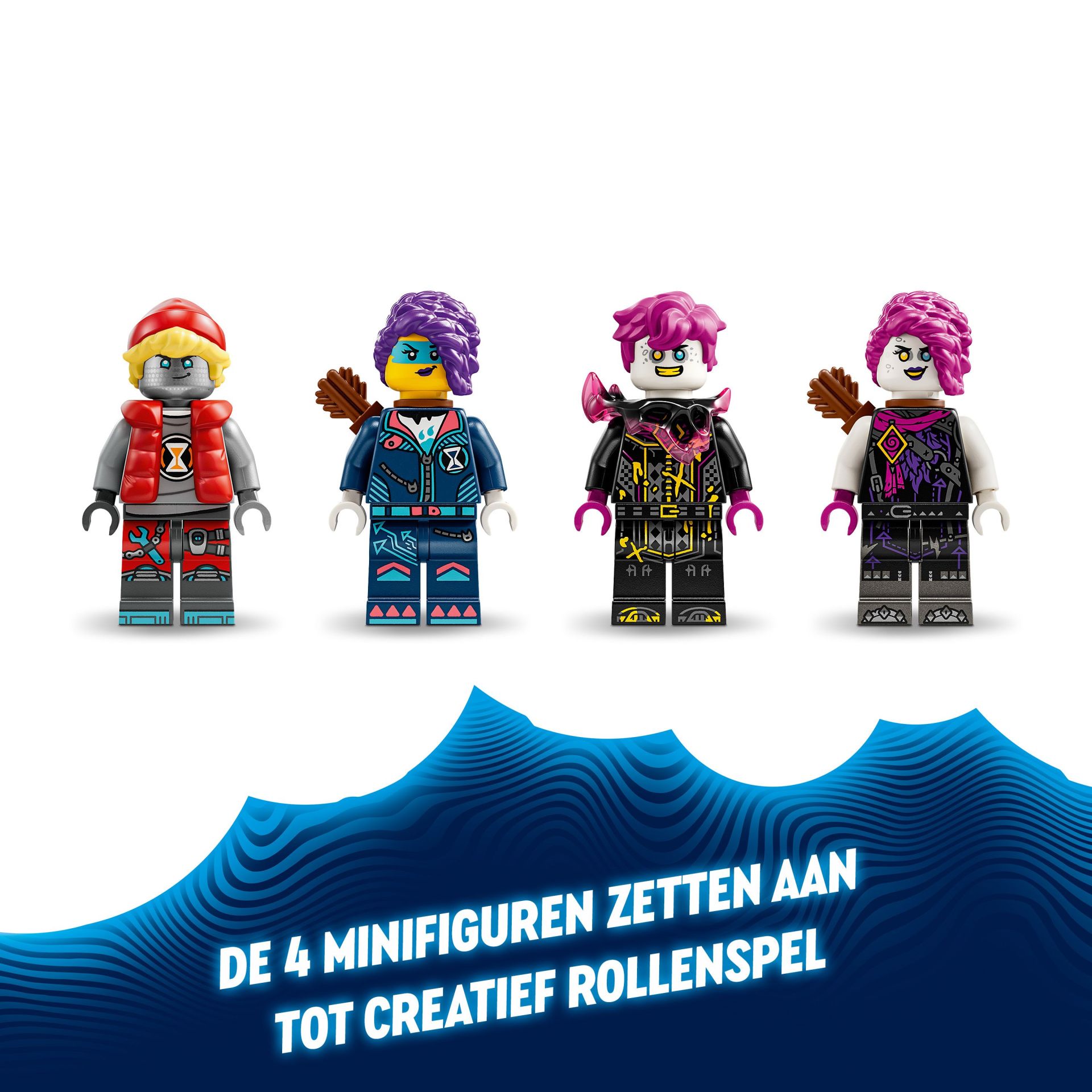 4 LEGO DREAMZzz minifiguren – de set wordt tot leven gebracht door de helden LEGO DREAMZzz Zoey en Cooper, hun duistere dubbelgangers Doey en Dooper en een figuur van Sneak