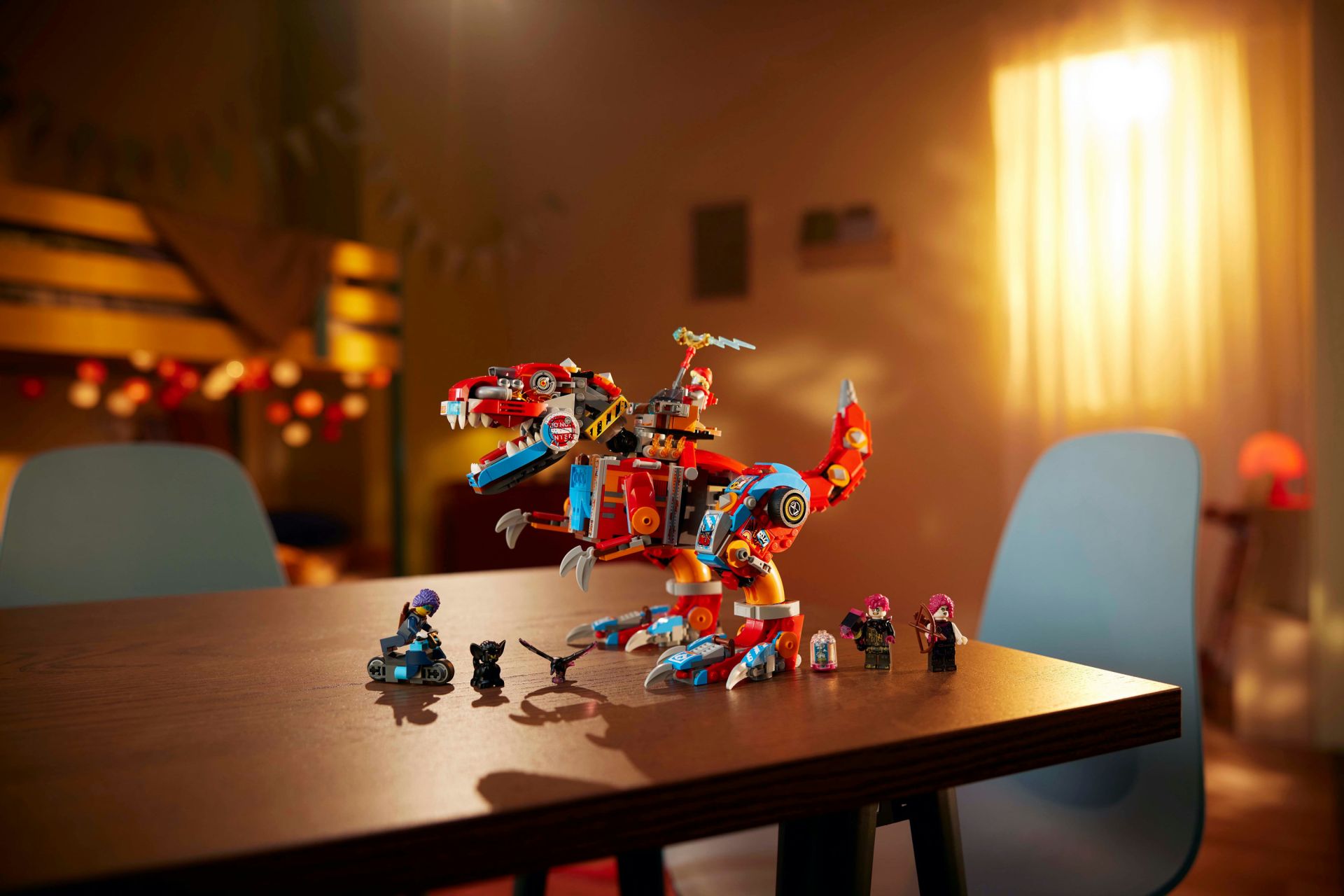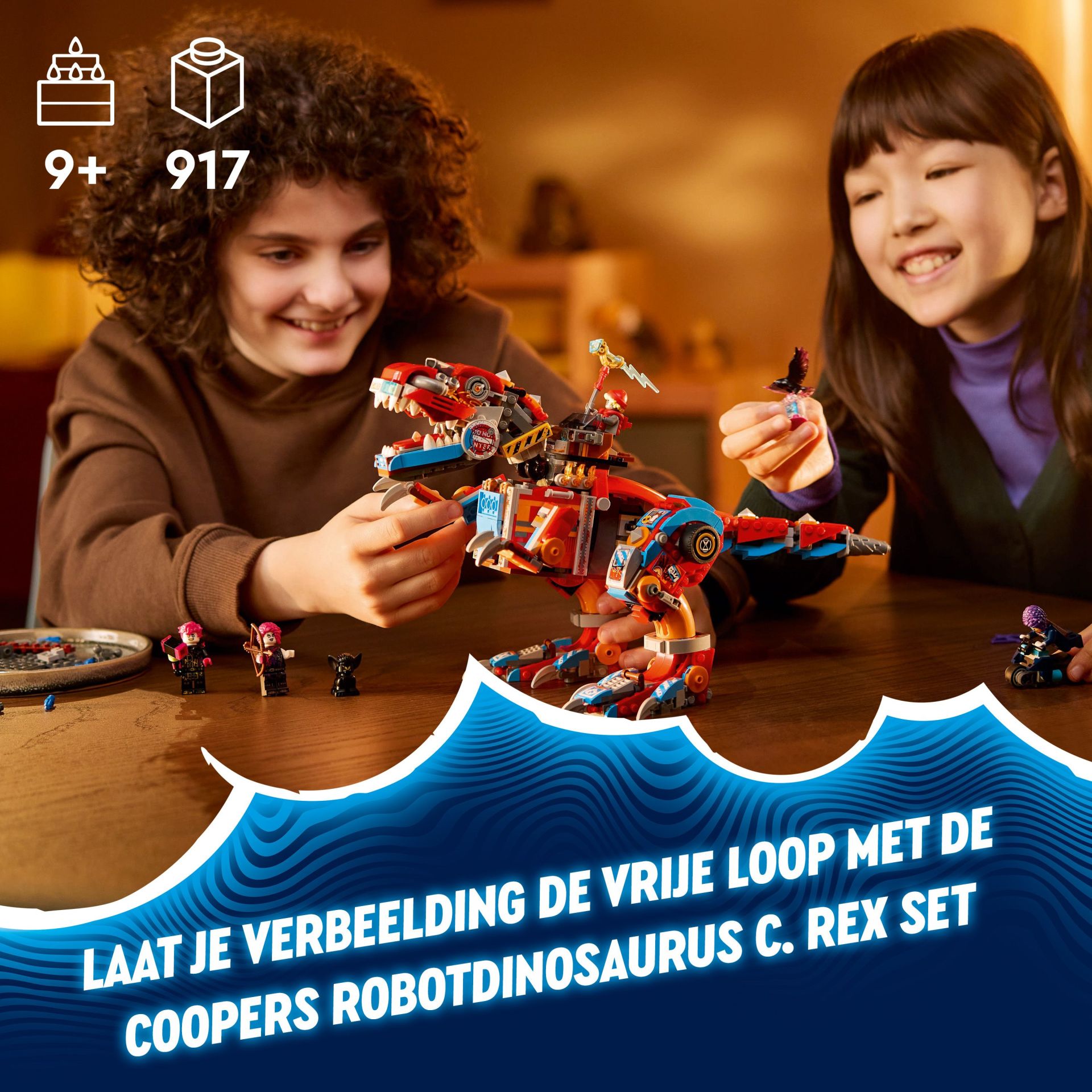 Zoey en Cooper, hun duistere dubbelgangers Doey en Dooper en een figuur van Sneak brengen de set tot leven. Zoey heeft een boog en Cooper een hamer. Beide helden kunnen in een auto op de rug van het dinosaurusmodel zitten. Het creatieve speelgoed bevat bouwinstructies op basis van verhalen, die de fantasie van kinderen stimuleren en hen aanmoedigen om helemaal op te gaan in de actie.