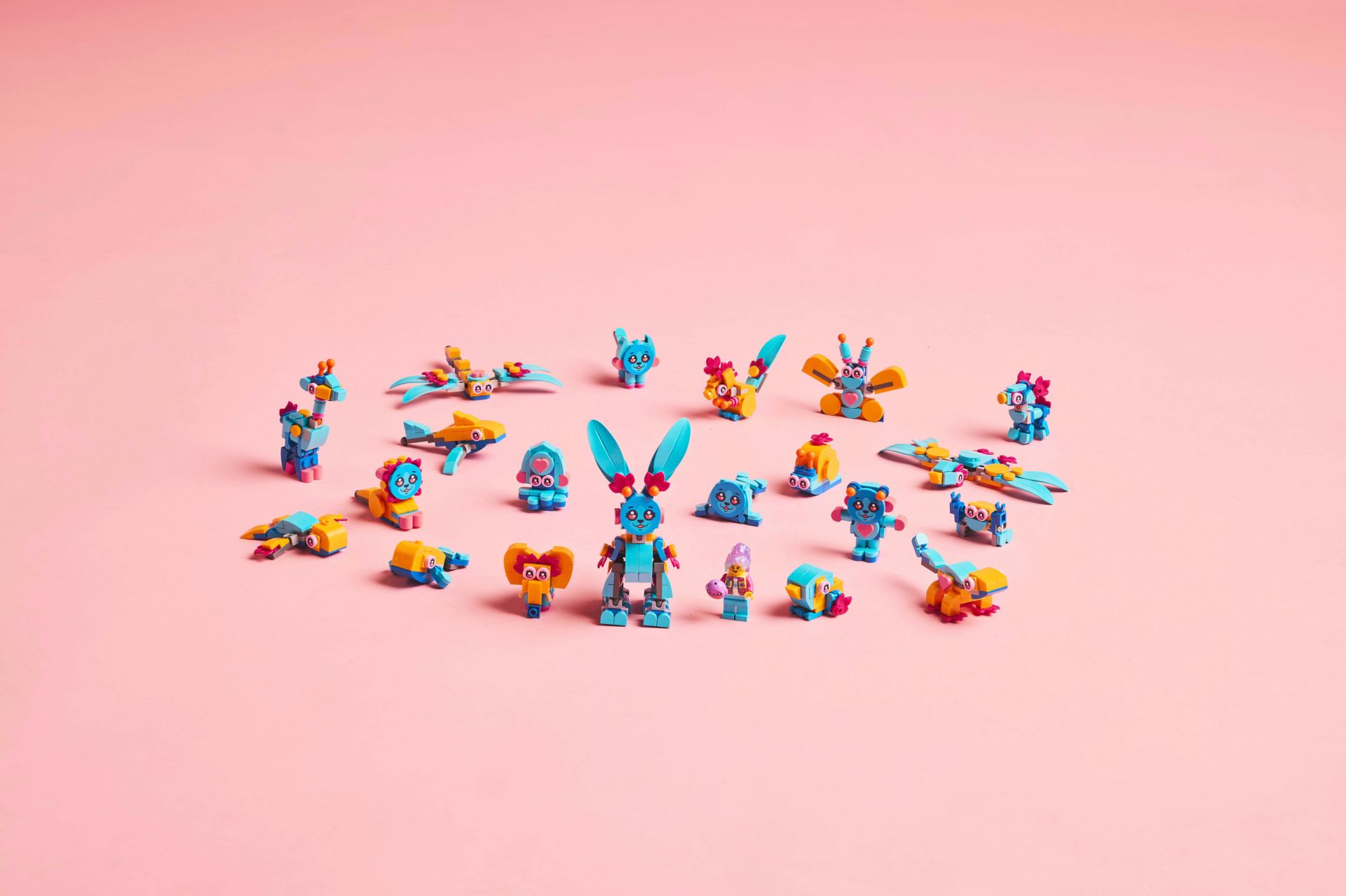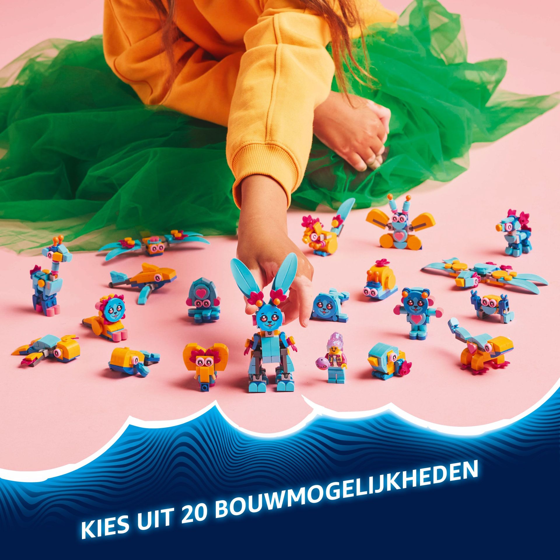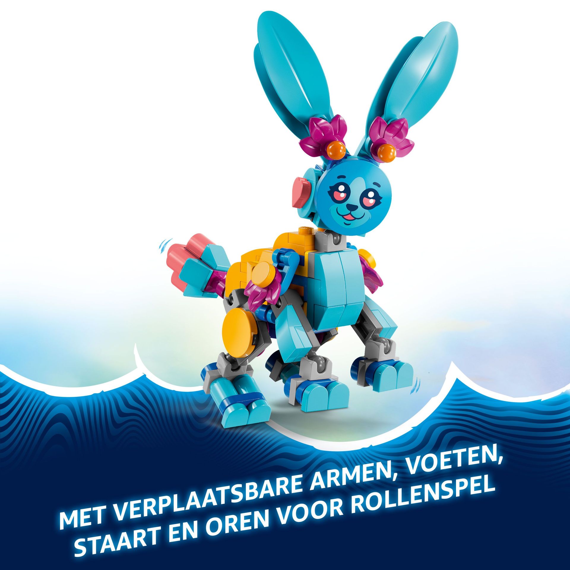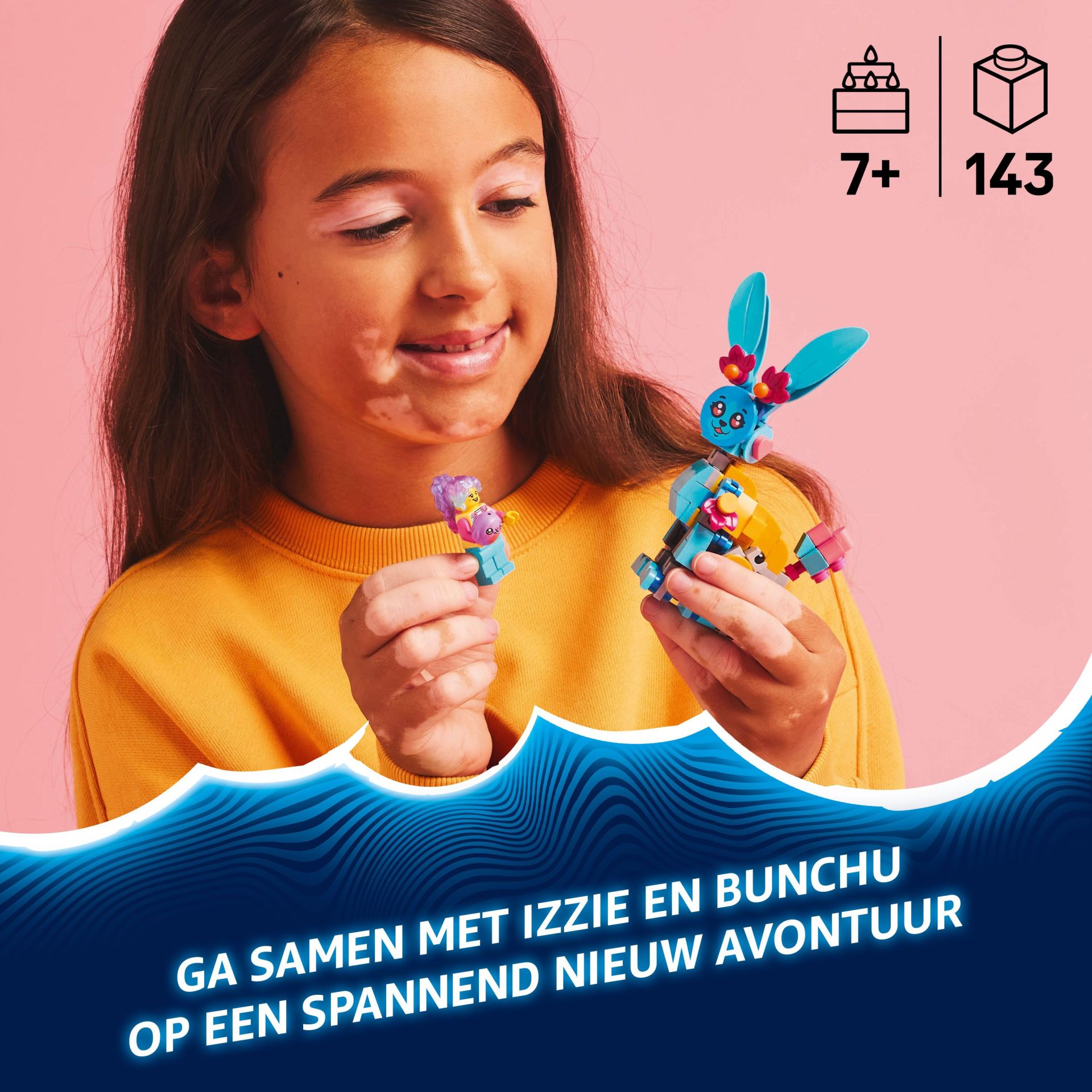 De creativiteit krijgt een boost als kinderen een schattige LEGO dieren figuur van Bunchu bouwen met verstelbare benen, armen, voeten, staart en oren, voordat ze hem ombouwen tot een van de 19 andere speelgoed dieren: een leeuw, schildpad, hert, vlinder, libel en meer! De set wordt tot leven gebracht door een minifiguur van Izzie in een nieuwe outfit met een knuffelaccessoire. De set stimuleert creatieve rollenspellen waarin kinderen nieuwe avonturen bedenken voor de LEGO DREAMZzz heldin en haar trouwe konijn.