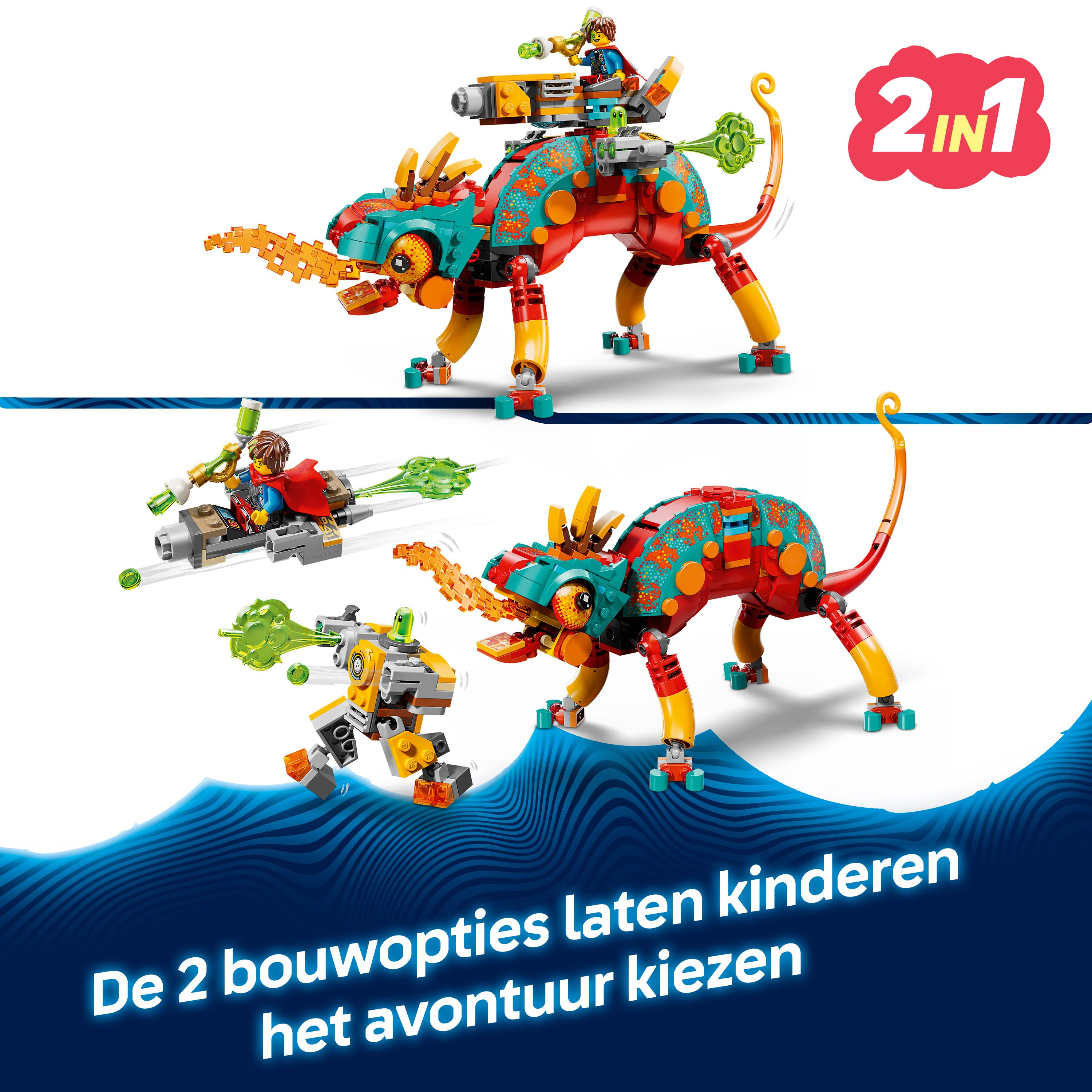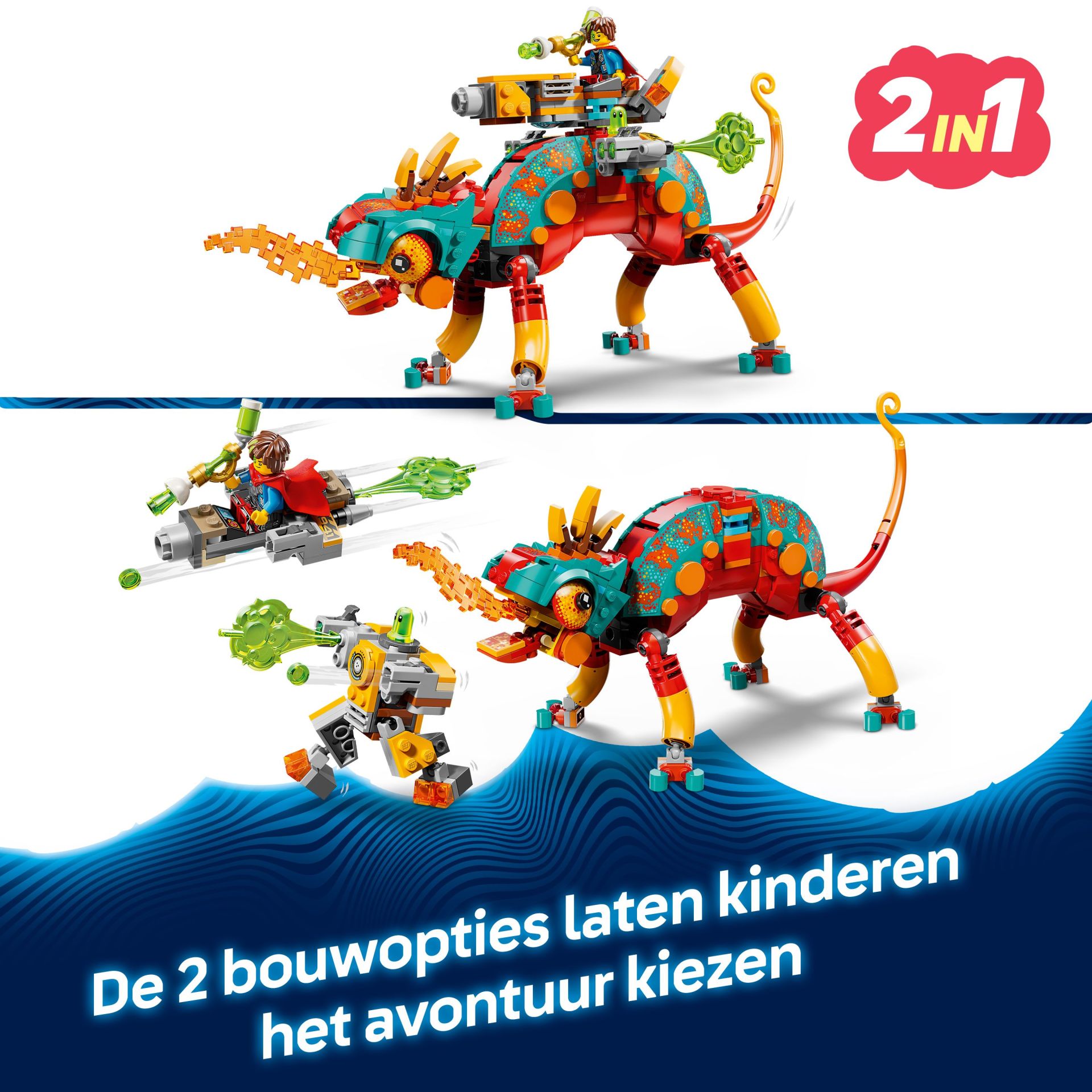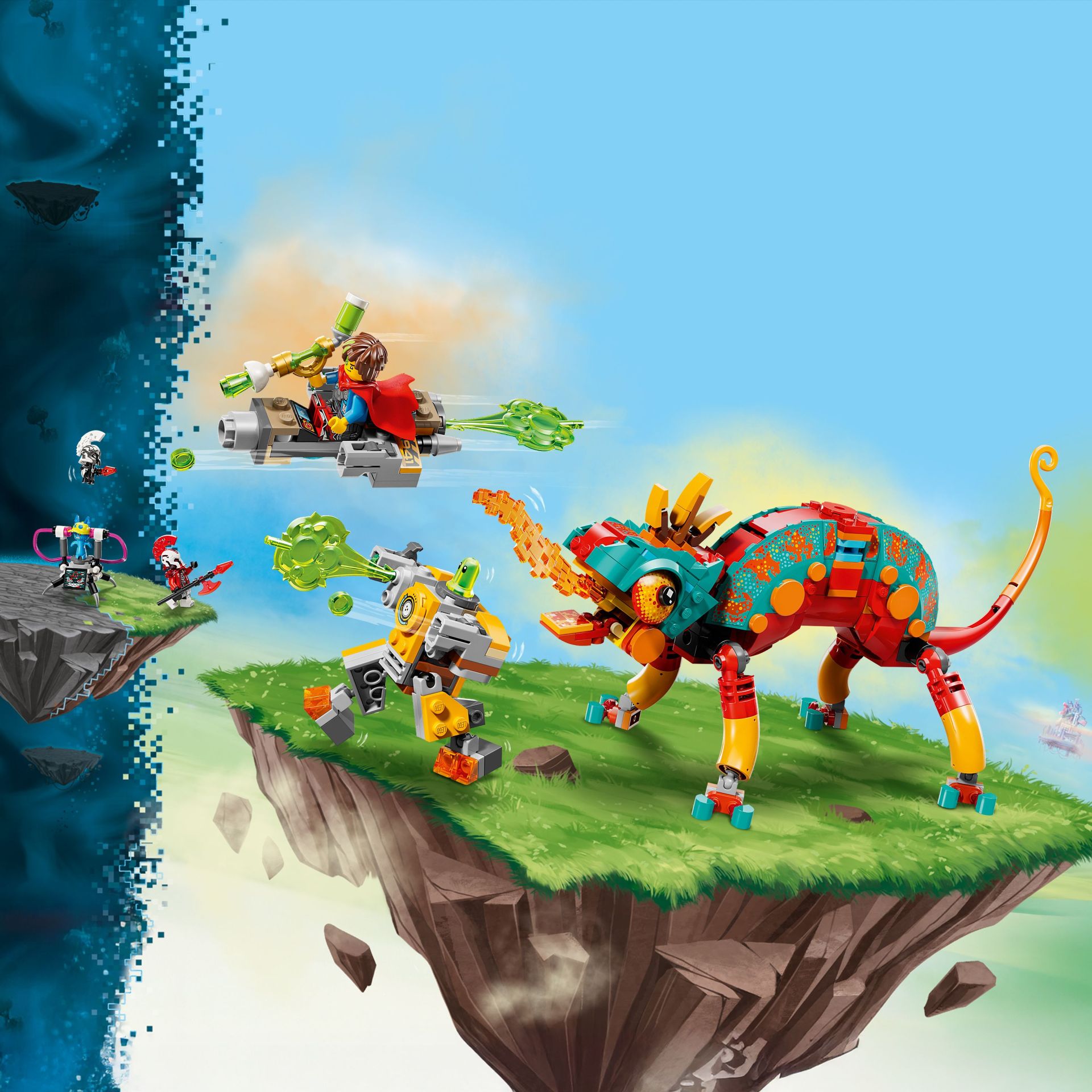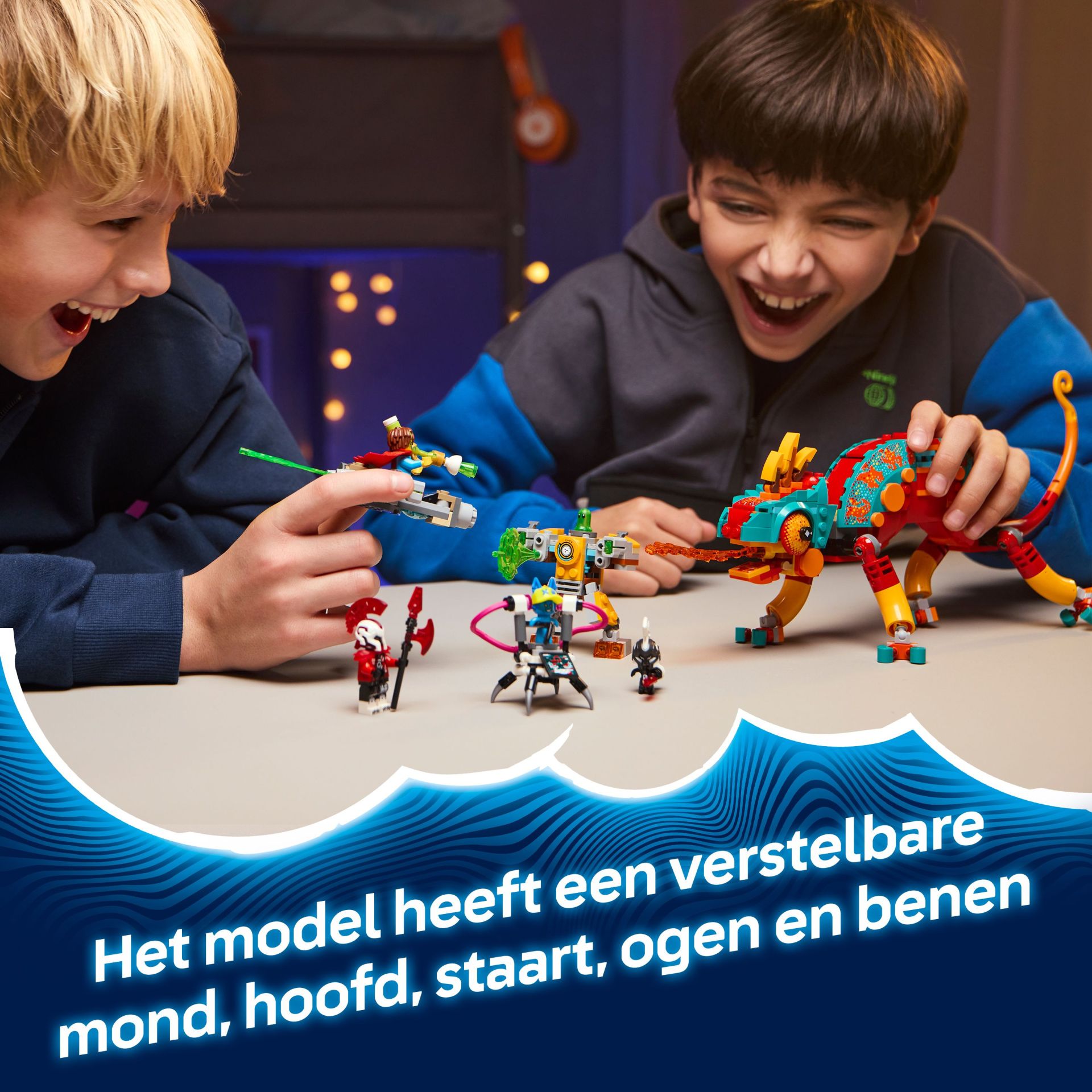 Jonge dromers bouwen een kameleon voordat ze 2 manieren ontdekken om hem te transformeren. Ze kunnen hem veranderen in een vuurkameleon met een blasterkoepel en 4 noppenschieters of een vliegtuigje met een minimechafiguur. De kameleon heeft een verstelbare bek, kop, staart, ogen en poten en beide bouwvarianten zitten boordevol coole details, waaronder modulaire boosters die compatibel zijn met andere bouwsets uit de LEGO® DREAMZzz™ 2025 reeks (apart verkrijgbaar). De minifiguren van Mateo en Zero en de figuren van Logan, Z-Blob en een Cyberwezen brengen het verhaal tot leven en stimuleren fantasierijk spel.