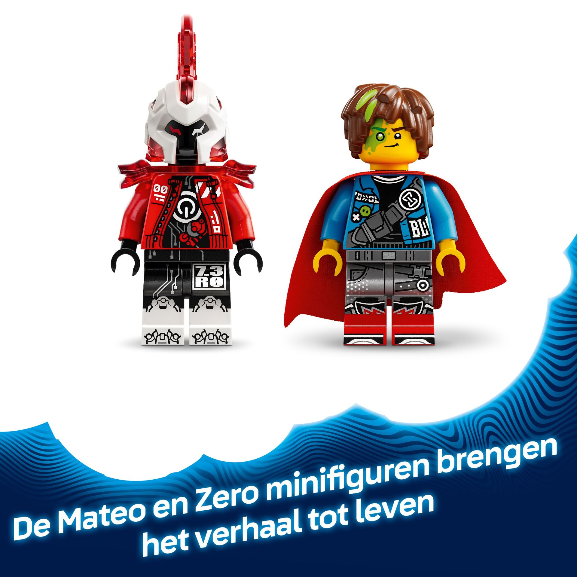 Minifiguren – held Mateo en schurk Zero, plus figuren van Logan, een Cyberwezen en Z-Blob, brengen het verhaal tot leven en stimuleren creatief rollenspel