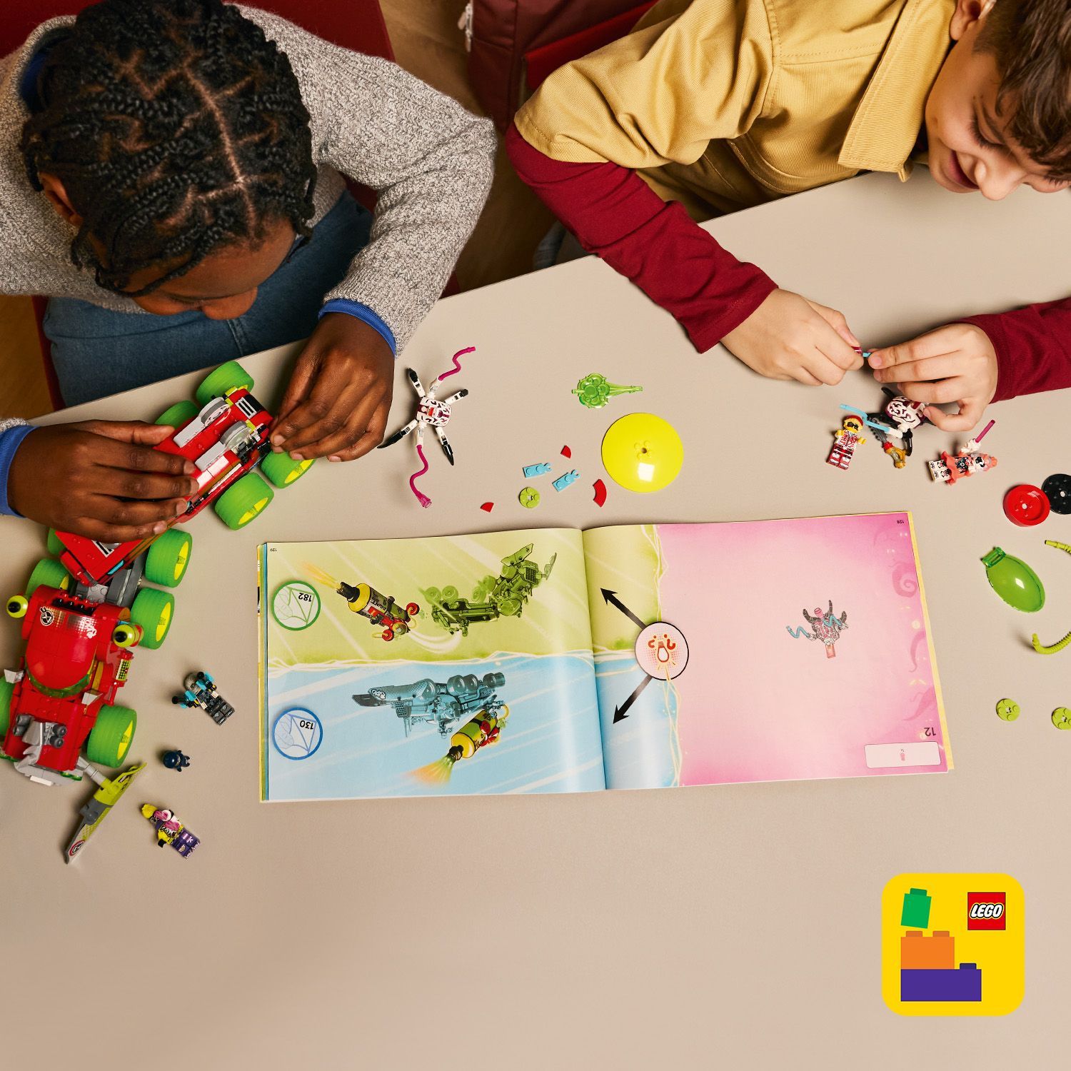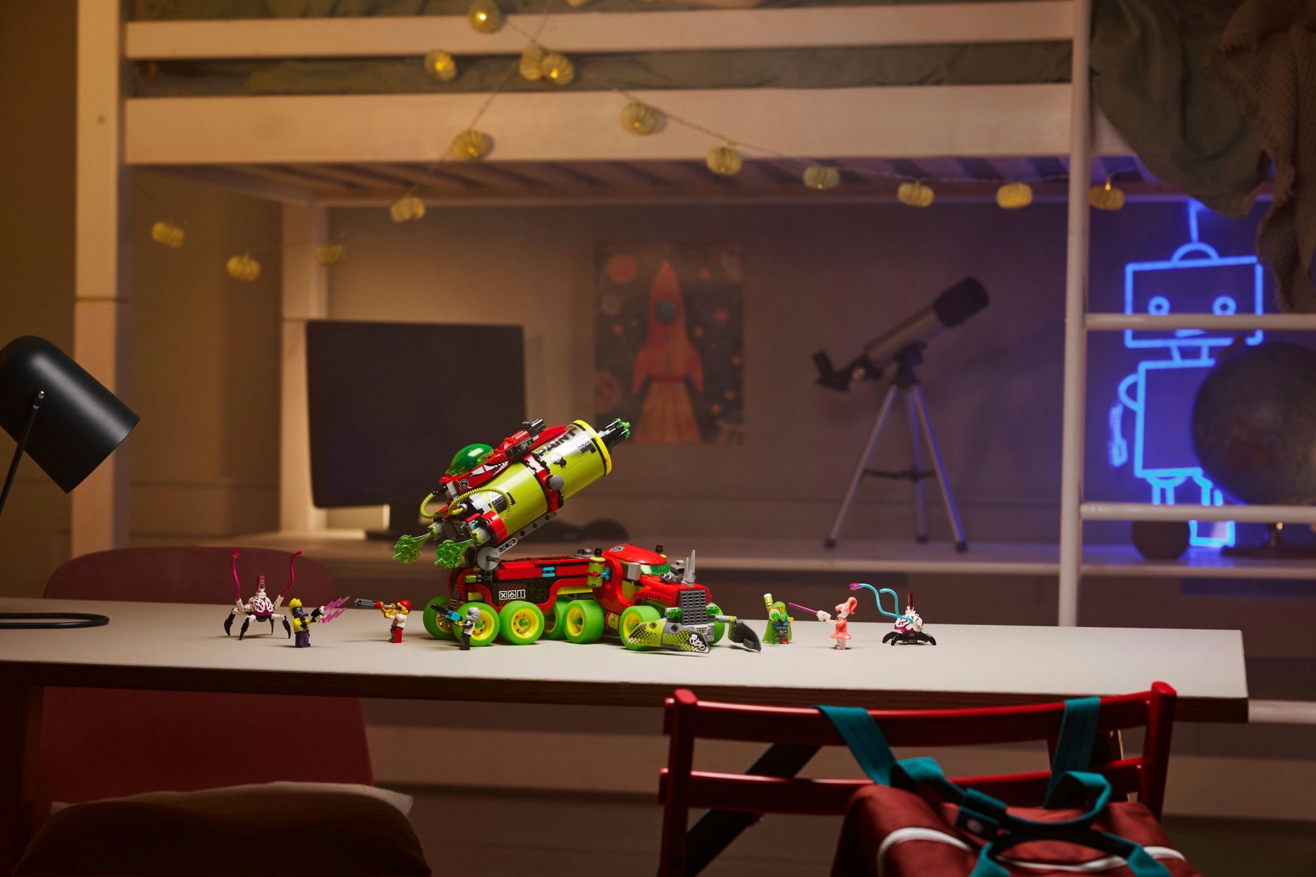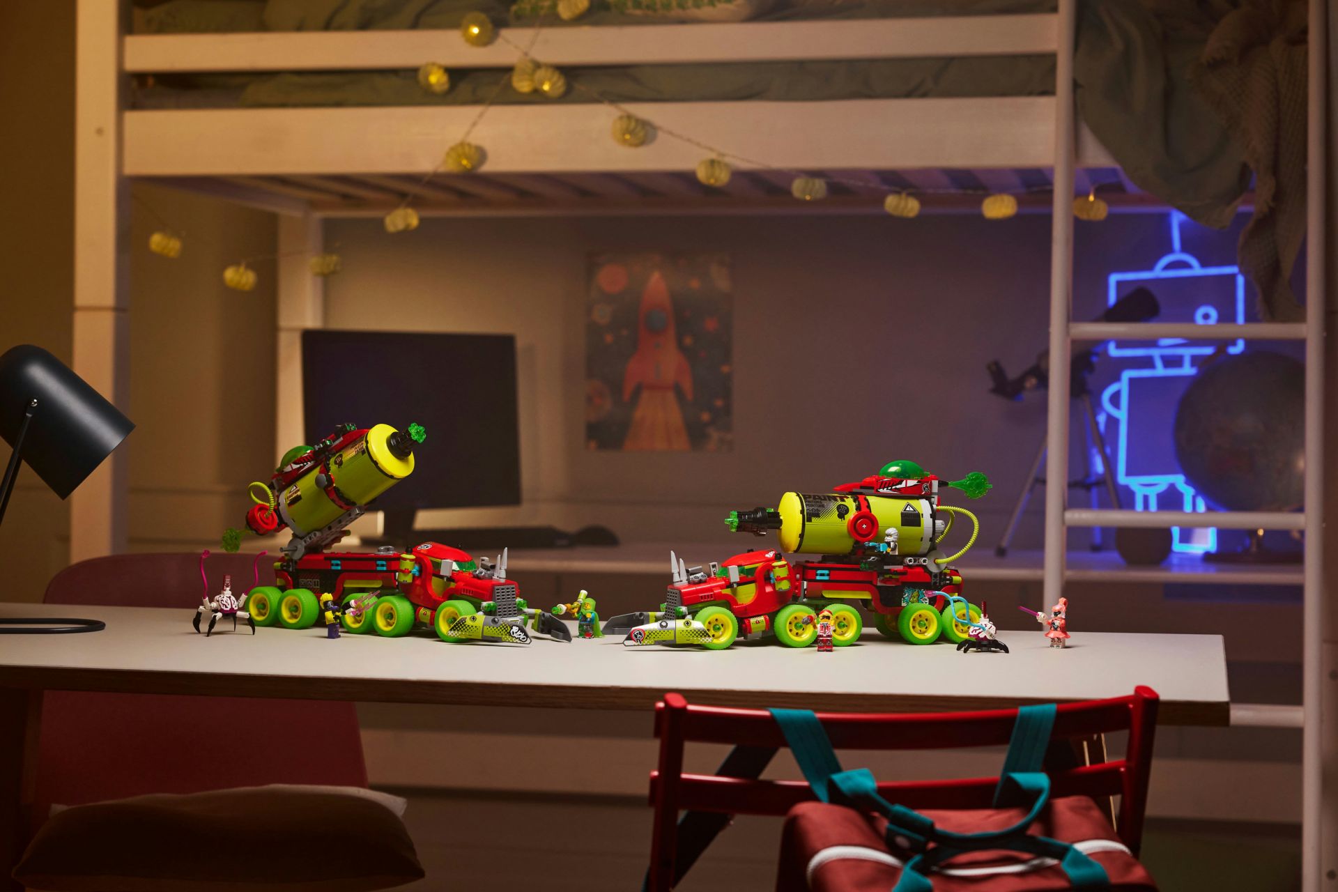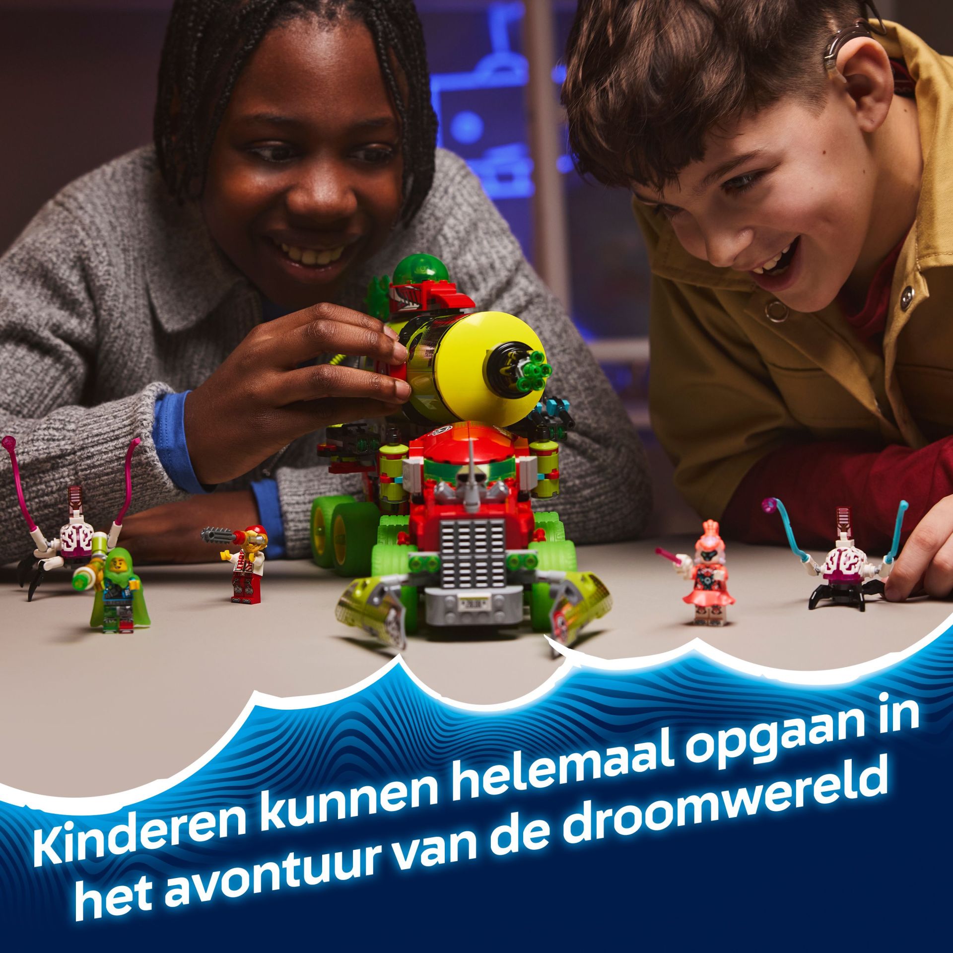LEGO DREAMZzz fans maken een speelgoedtruck voordat ze hem ombouwen tot een gigantische spuitbus of een spuitbusraketwerper. Coole details zijn onder andere noppenschieters, een cockpit die open kan en modulaire schieters en spuitbussen die compatibel zijn met andere sets uit de LEGO DREAMZzz collectie van 2025 (apart verkrijgbaar). De set bevat ook Mateo, Cooper, Meneer Oz, Albert, One, D-Shock en 2 cyberbreinspinnen, die fantasierijke rollenspellen stimuleren.