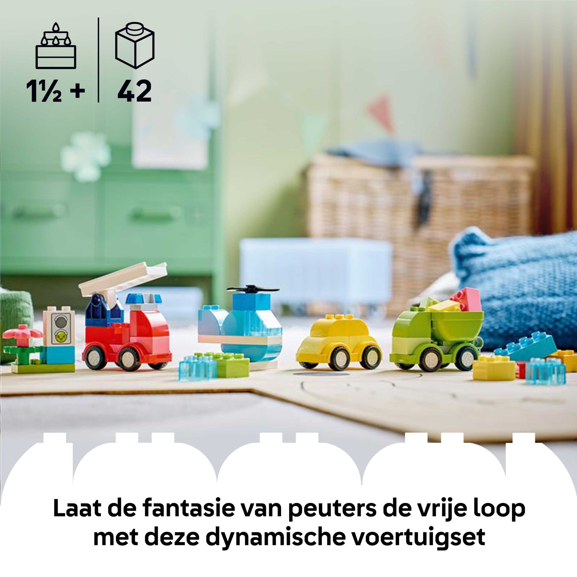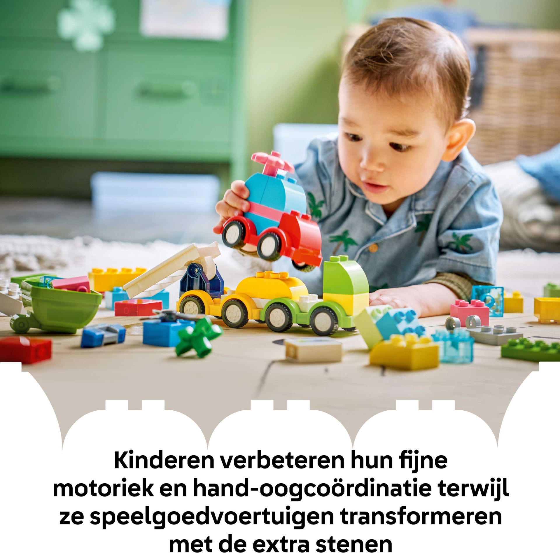 Eerst bouwen peuters de modellen van een LEGO DUPLO helikopter met een draaibare rotor, een kiepwagen met een kantelbare laadbak, een brandweerwagen met een scharnierende ladder en een kleine gezinsauto. Vervolgens gebruiken ze hun fijne motoriek en hand-oogcoördinatie om de voertuigen los te halen en voegen ze extra stenen toe om geheel nieuwe creaties te maken. Van politieauto's tot een superlange vrachtwagen of een dubbeldekkerbus: peuters kunnen hun creativiteit gebruiken om de LEGO DUPLO stenen op nieuwe en verrassende manieren te combineren.
