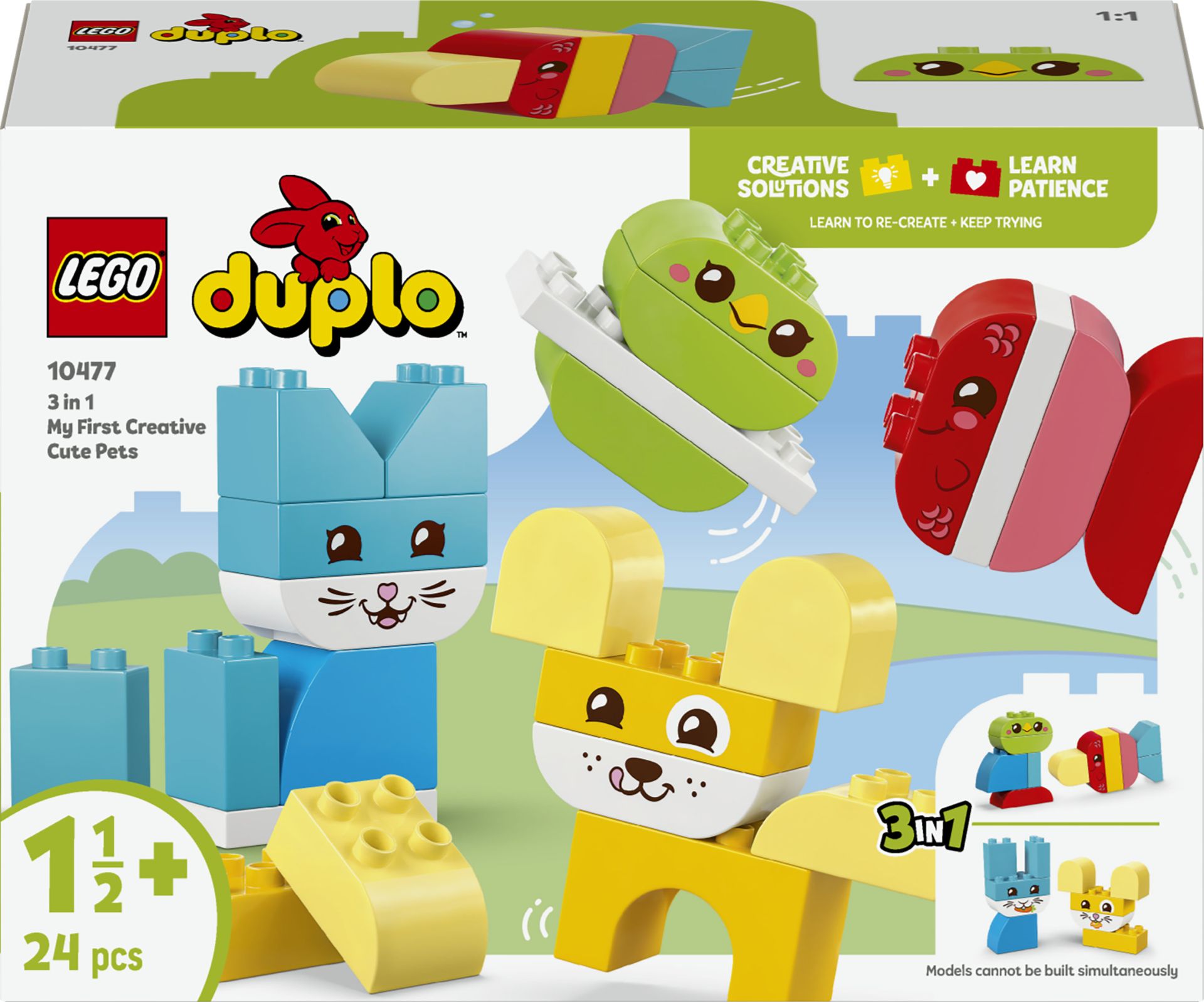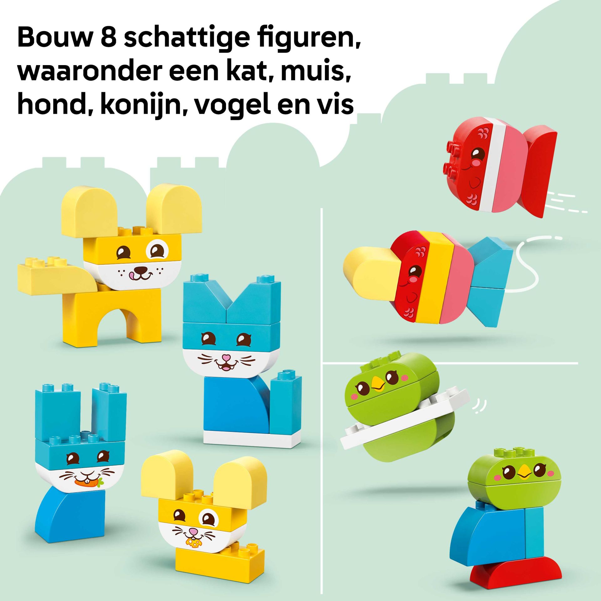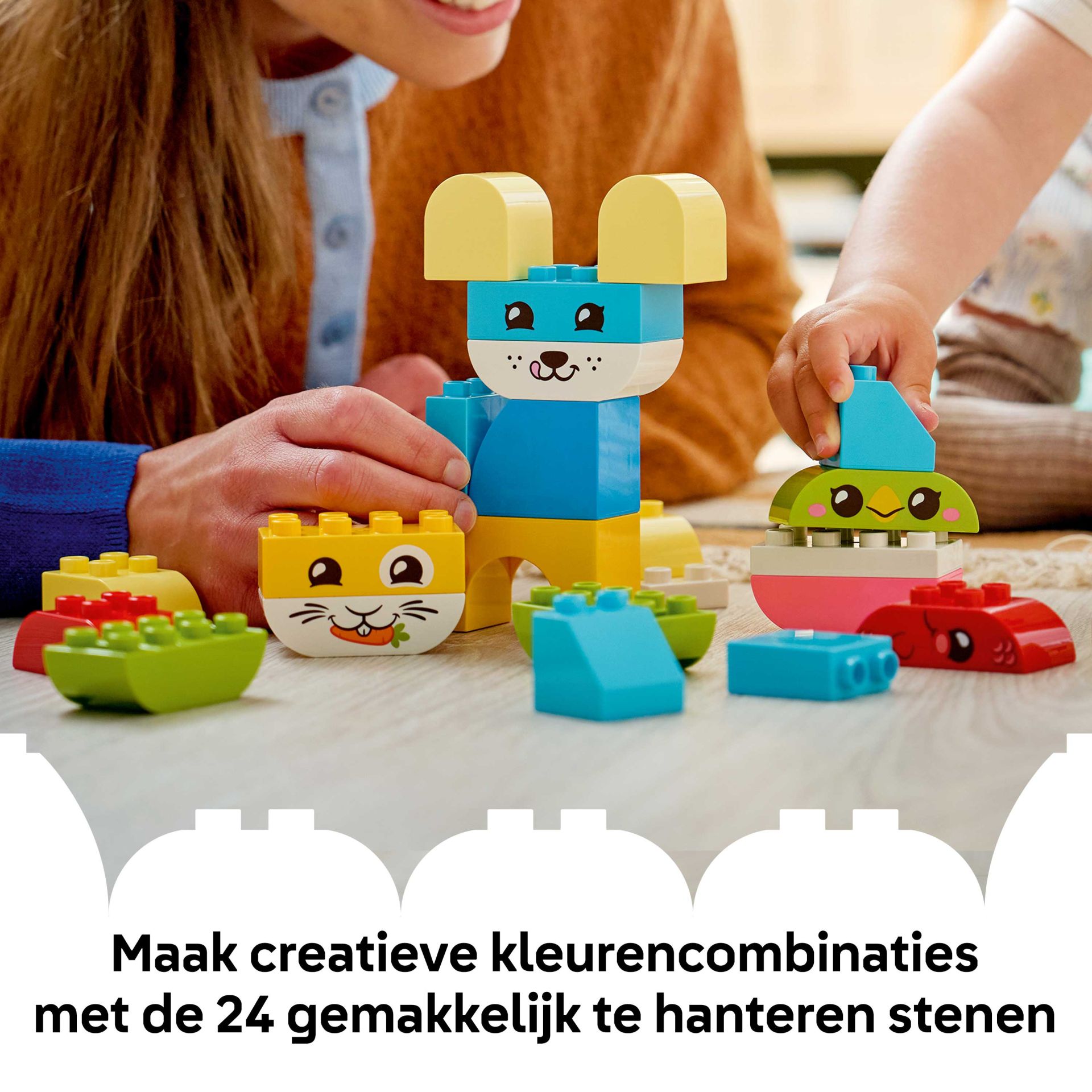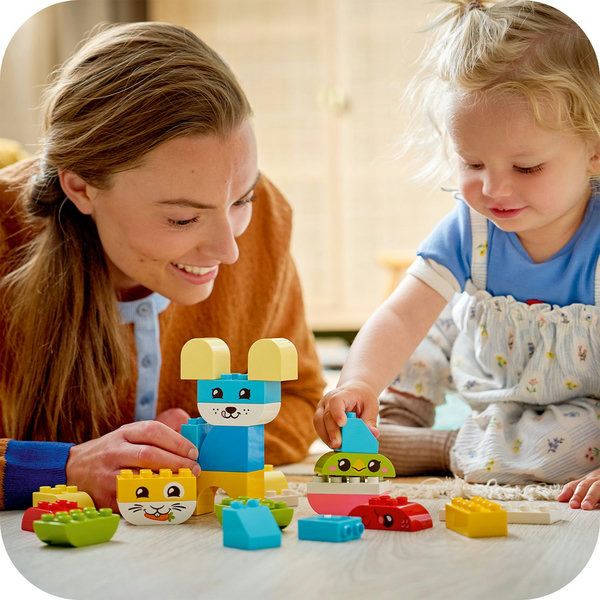 Met de 24 gemakkelijk vast te pakken stenen die speciaal voor de allerkleinsten zijn ontworpen, kunnen kleine bouwers figuren maken waaronder een hond, kat, vogel, konijn, muis en vis. Sommige van deze speelgoeddieren voor jonge kinderen zijn gemaakt van LEGO DUPLO stenen in één kleur. Kleine bouwers leren op kleur te sorteren om hun huisdier te creëren en hun figuur af te maken door het een lief dierengezicht te geven.