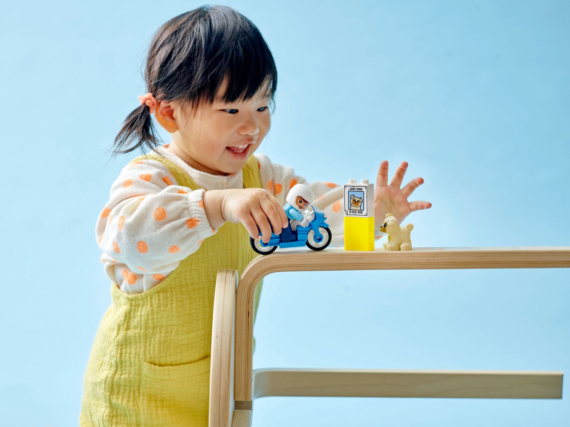 Stimuleert fantasierijk speelplezier – de set bevat 2 LEGO® DUPLO® figuren (een politieagent en een schattig hondje), een poster van de vermiste hond en een coole, blauwe politiemotor waar de agent samen met het hondje op kan rijden