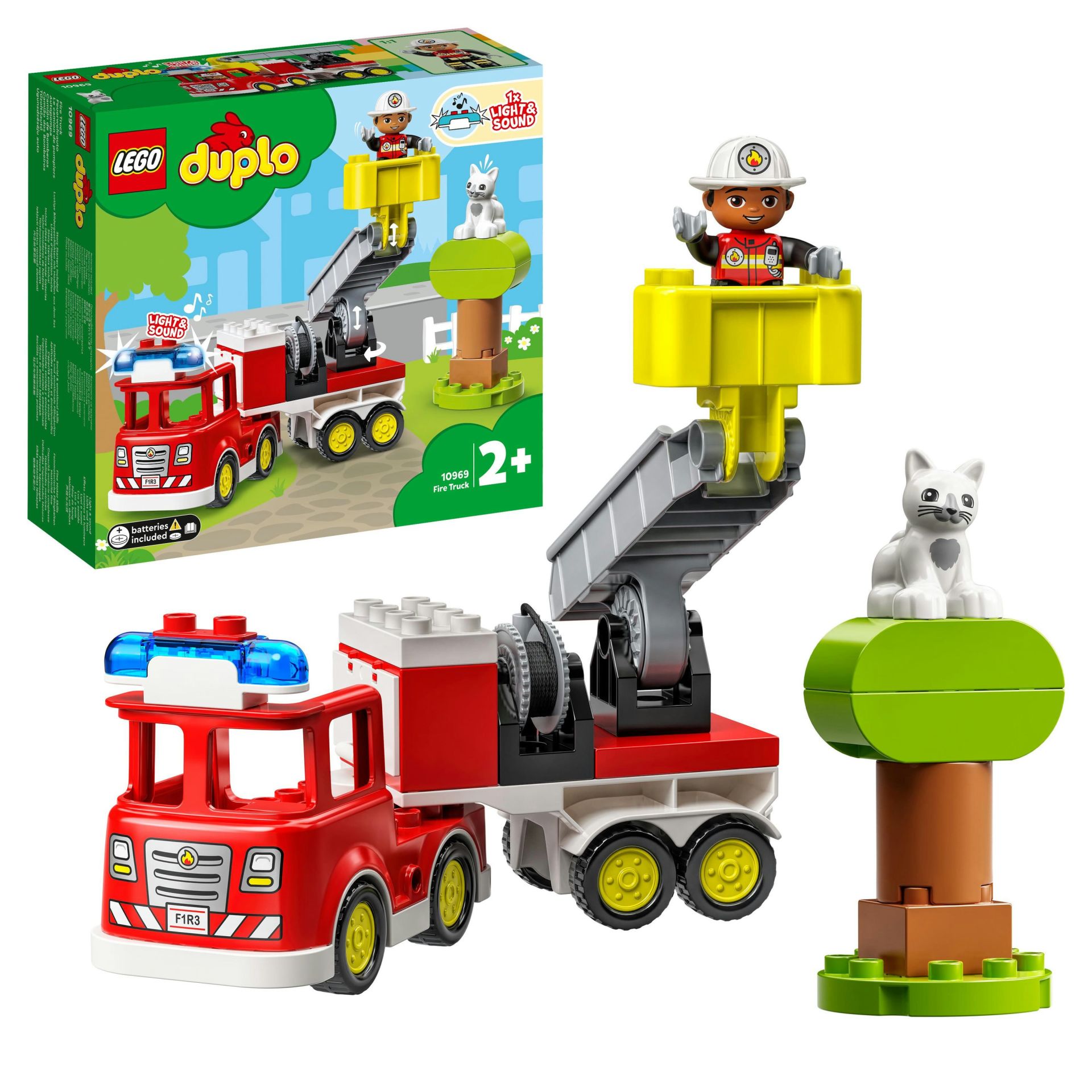 Bij dit educatieve speelgoed zijn LEGO DUPLO figuren van een brandweerman en een kat inbegrepen, plus een boom om zelf te bouwen en multifunctioneel brandweerauto speelgoed met zwaailichten en sirene (batterijen inbegrepen). Peuters van 2+ jaar kunnen op de hendel duwen en eraan draaien om het bakje omhoog te brengen en te draaien, zodat ze een poging kunnen doen om de kat te redden. Wanneer kinderen de speelgoed kat dieren figuur gered hebben, kunnen ze het beestje wat lekkers te eten geven met de snack-accessoires bij deze set, en ze kunnen de brandslang gebruiken om de kat wat 'water' te geven. Terwijl ze hun verbeelding gebruiken en zelf reddingsverhalen bedenken, ontwikkelen kleine helden hun fijne motoriek en sociale en emotionele intelligentie. Via een leuk stripverhaal dat is gebaseerd op de speelset maken kinderen op een eenvoudige manier kennis met creatief bouwen en fantasierijk spelen. Dit educatieve vrachtwagen en brandweerauto speelgoed is een geweldig cadeau-idee voor peuters van 2 jaar en ouder die dol zijn op voertuigen en schattige speelgoed dieren figuren - verras ze met deze leuke bouwset voor hun verjaardag of een andere gelegenheid