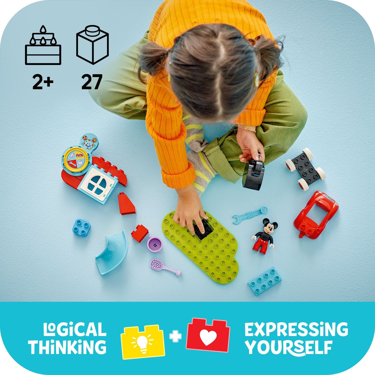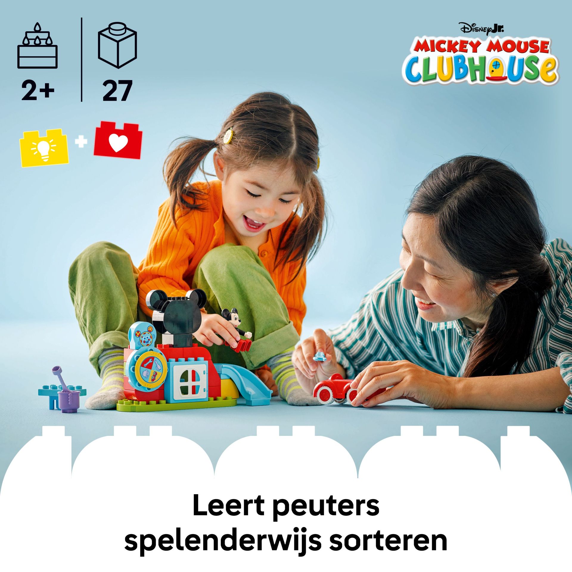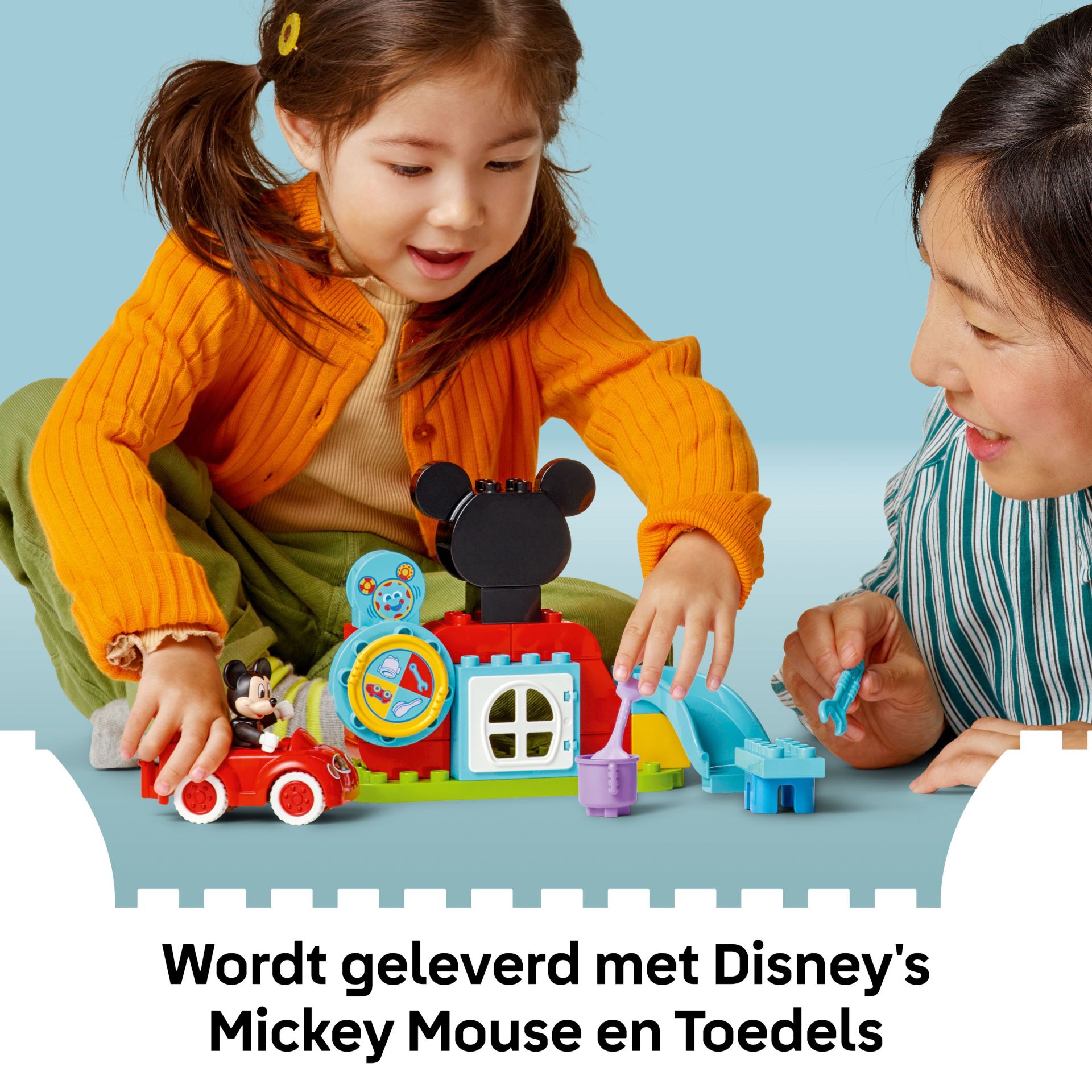 Geef peuters het plezier van hun favoriete Disney Junior serie in eigen handen met het Mickey Mouse clubhuis en auto (10454) bouwspeelgoed. Kinderen van 2 jaar en ouder doen mee met Toedels om Mickey Mouse opdrachten te geven door aan het Muisdenkdinges-wiel te draaien en een taak kiezen die hij moet voltooien. Dit bouwbare sorteerspeelgoed laat peuters spelenderwijs leren. Ze kunnen om de beurt met een volwassene aan het rad draaien en vervolgens hun vaardigheden gebruiken om de afbeeldingen te koppelen aan de gekleurde accessoires. Deze bouwbare voertuigspeelset bevat taken zoals het afstellen van de bouwbare auto met de moersleutel of schoonmaken met de emmer en borstel. Kleine vingertjes oefenen de fijne motoriek terwijl ze leuke functies verkennen, waaronder het scharnierende raam, de glijbaan en de autowielen. Dit LEGO® DUPLO® bouwspeelgoed voor kinderen inspireert peuters om hun fantasie en zelfexpressie te gebruiken en hun eigen Mickey Mouse Clubhuis avonturen te bedenken.