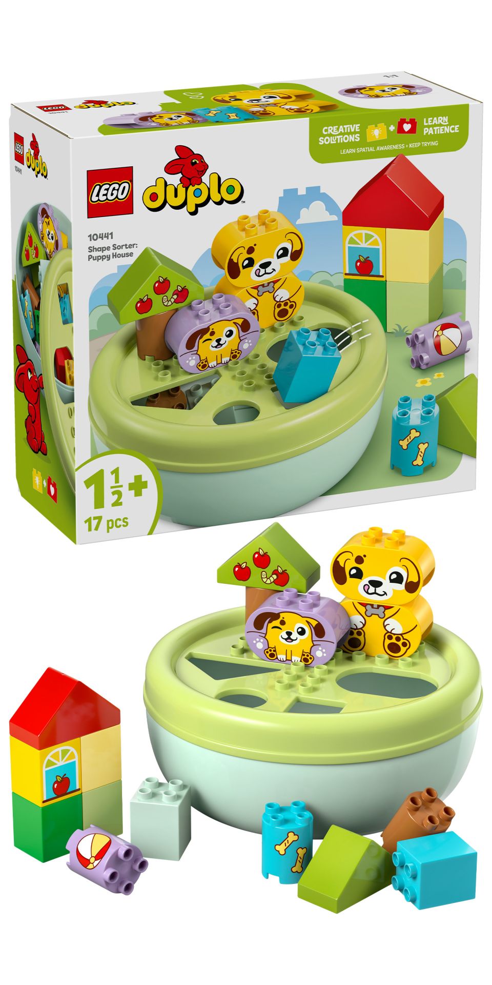 Dit cadeau voor peuters ontwikkelt het ruimtelijk inzicht met leuke activiteiten. Ouders kunnen de verschillende vormen aanwijzen terwijl peuters ze gebruiken om bomen, honden en zelfs een huis te bouwen. Ze kunnen vervolgens genieten van creatieve rollenspellen met hun schattige LEGO® DUPLO® hondjes, een bal naar ze toe rollen en ze een bot voeren.