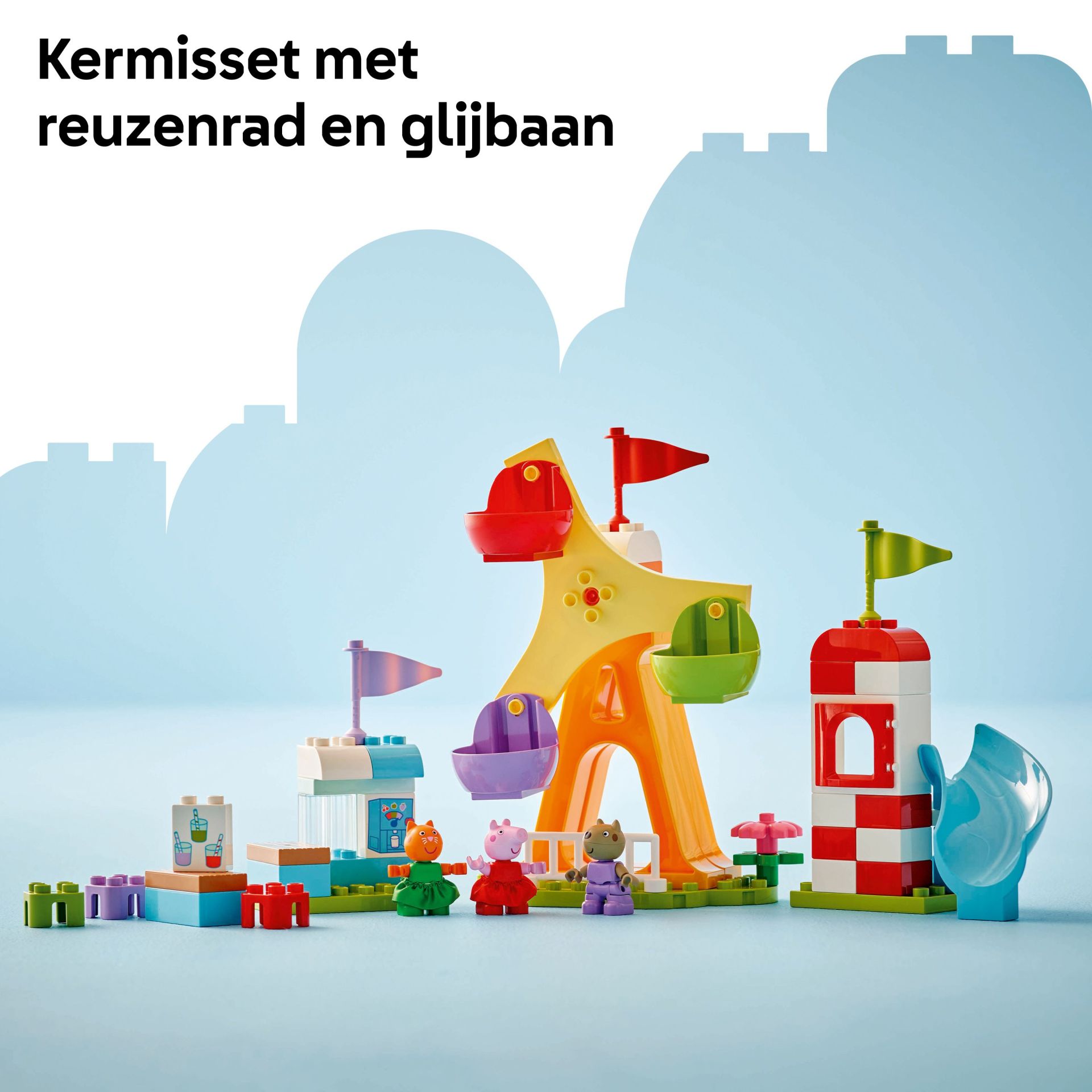 - Bouwset boordevol functies – deze speelset voor peuters bevat 3 LEGO® DUPLO® figuren: Peppa Big, Henkie Hond en Kaatje Kat, plus een reuzenrad, een glijbaan en een minimodel met een sapbar