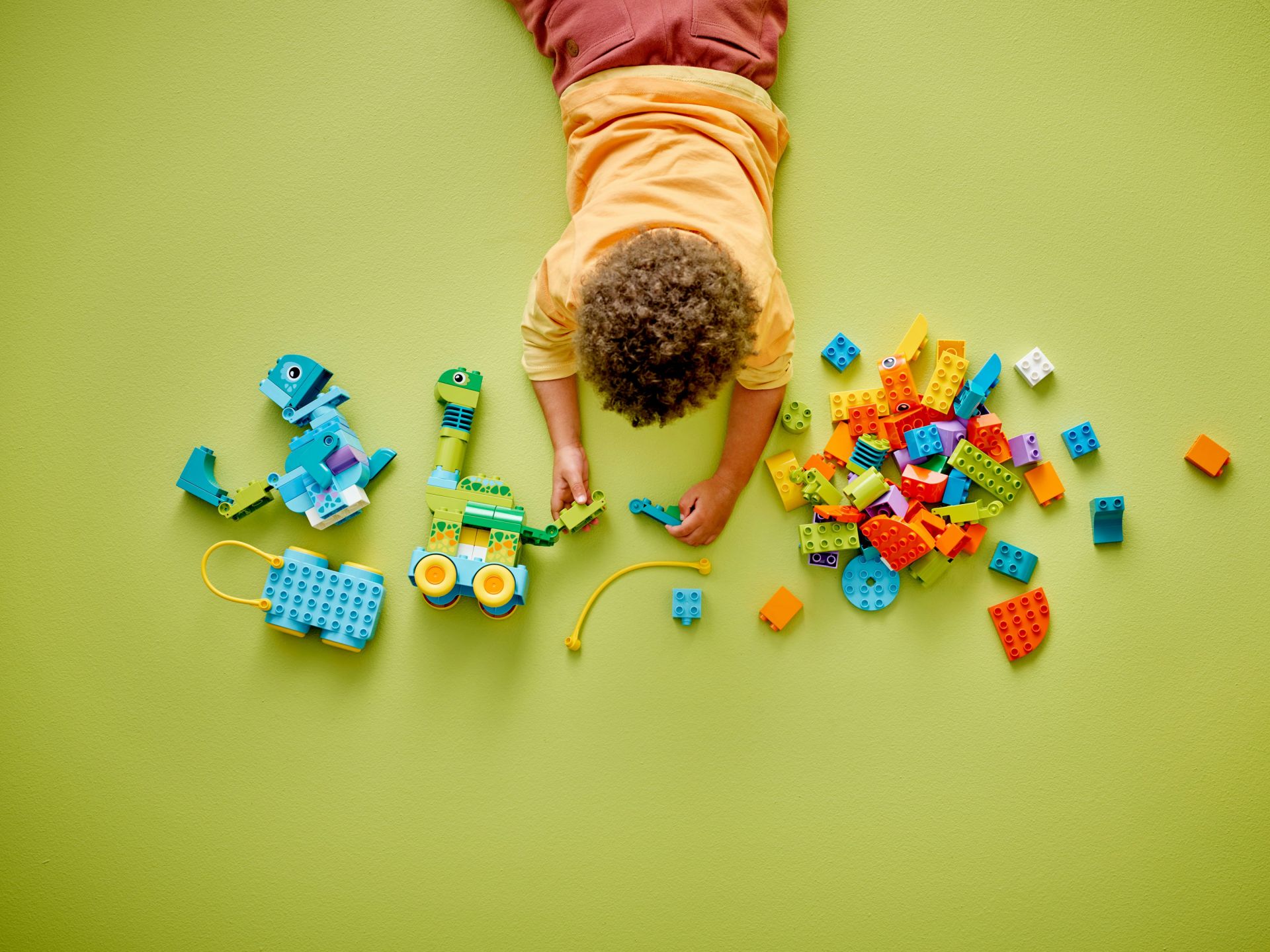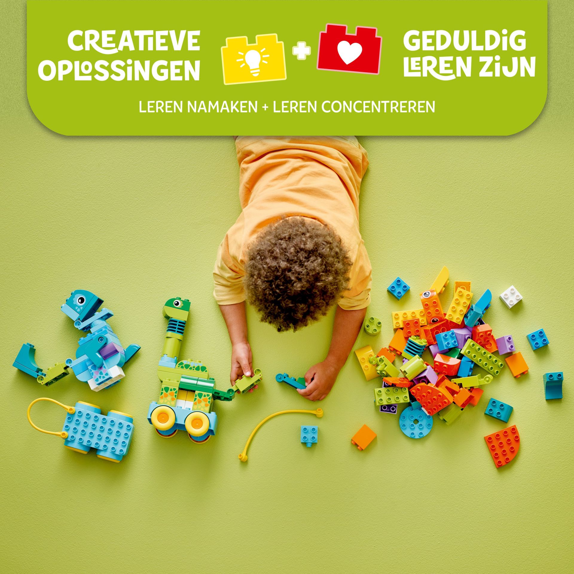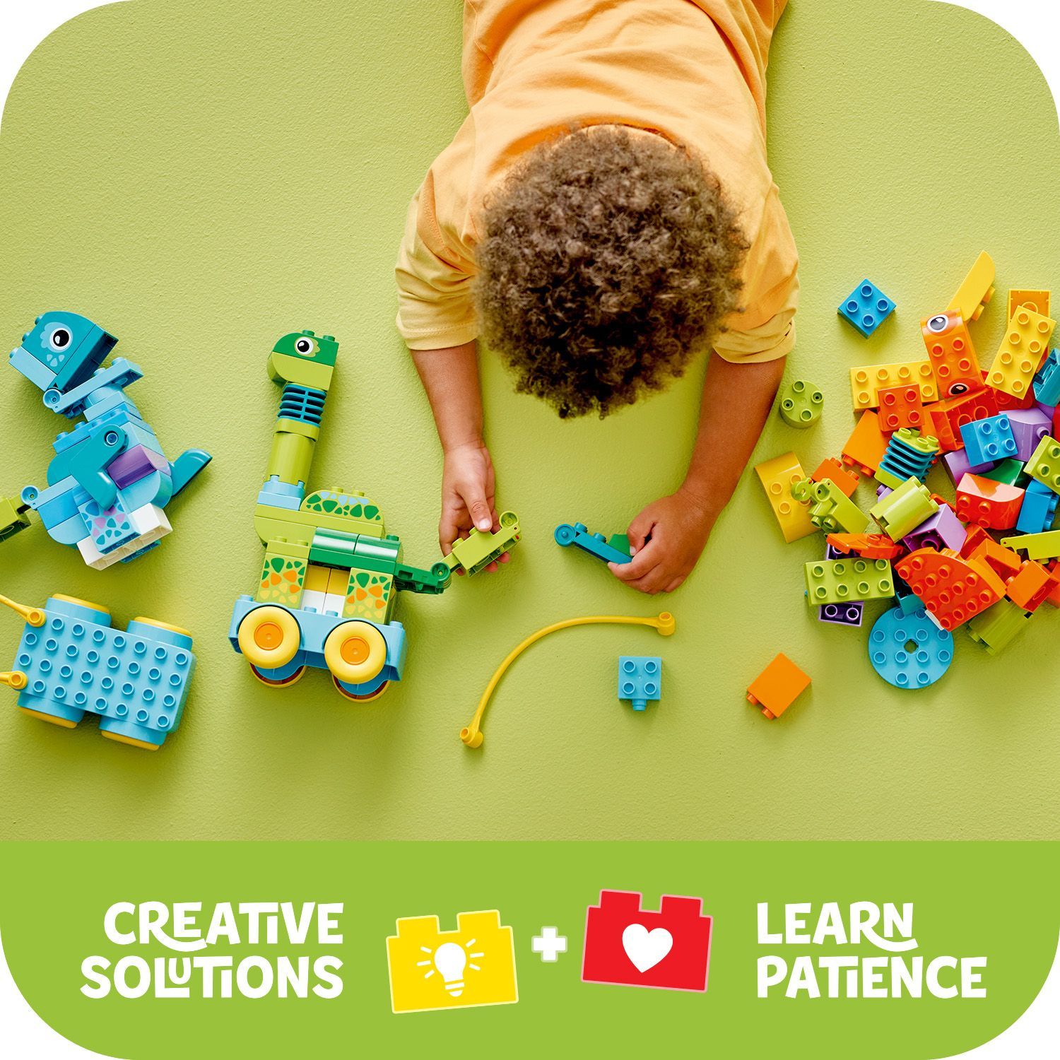 Peuterspeelgoed voor urenlang creatief speelplezier – geef peuters vrolijke kleuren en eindeloze creativiteit in handen met de educatieve LEGO® DUPLO® Stad 3-in-1 dinosaurussen op wielen speelset