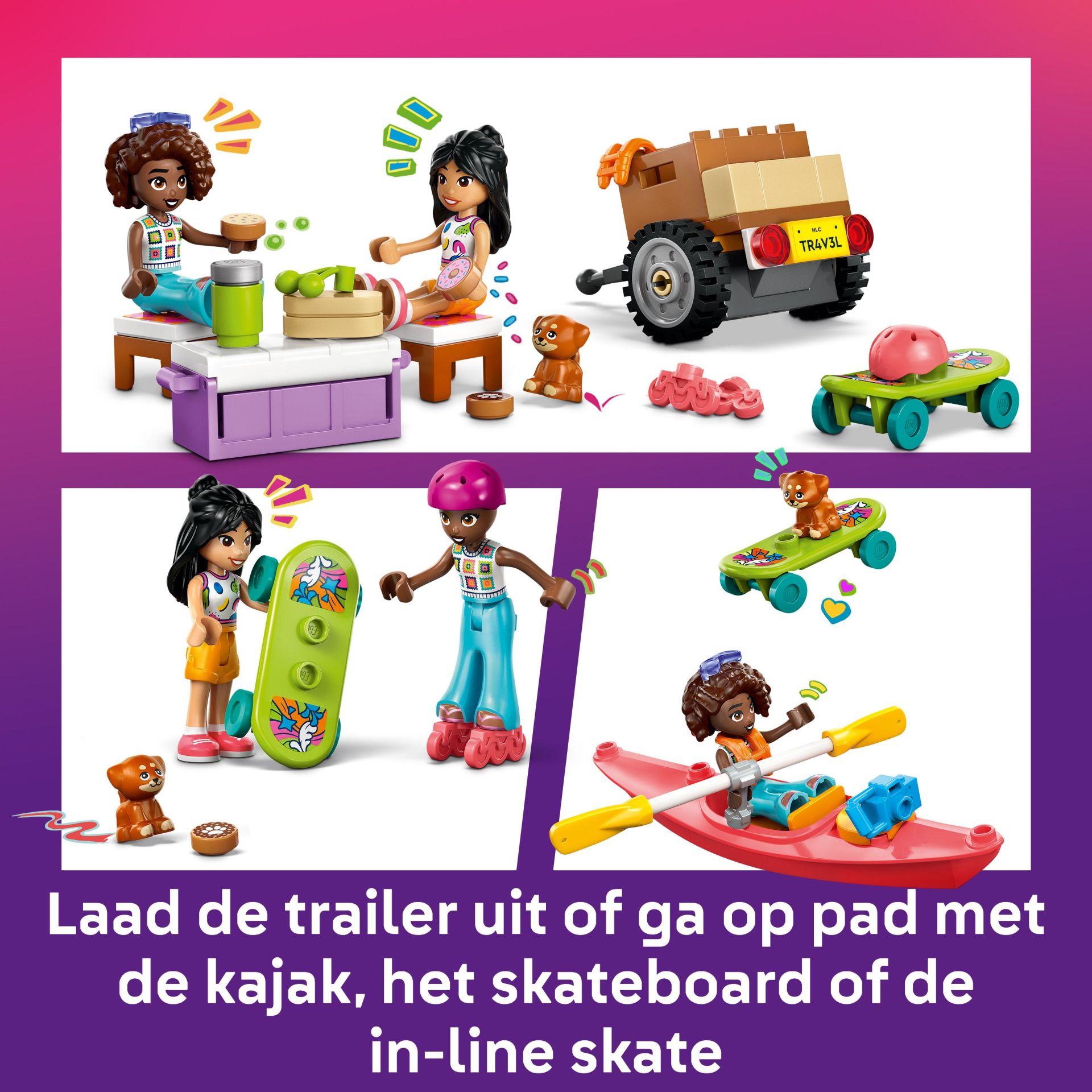 Neem kinderen mee op een creatieve reis waarin ze Liann en Aliya helpen de auto en aanhanger in te pakken met alles wat ze nodig hebben. De vrienden zitten voorin en er is een zitplaats voor Aira de hond achter in de auto. Inclusief accessoires waaronder een kajak, 2 helmen, een skateboard, skeelers, 2 stoelen en een koelbox met een broodje, donut, koekje, kersen en een traktatie voor de hond. De koelbox doet ook dienst als picknicktafel.
