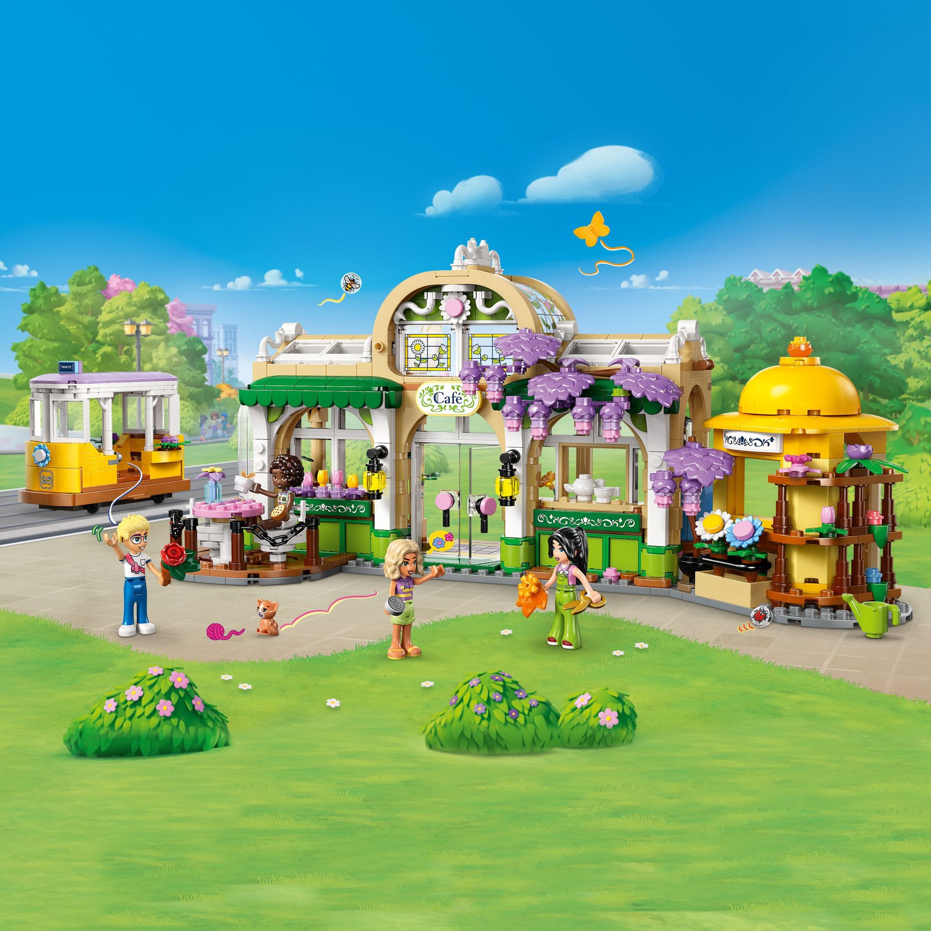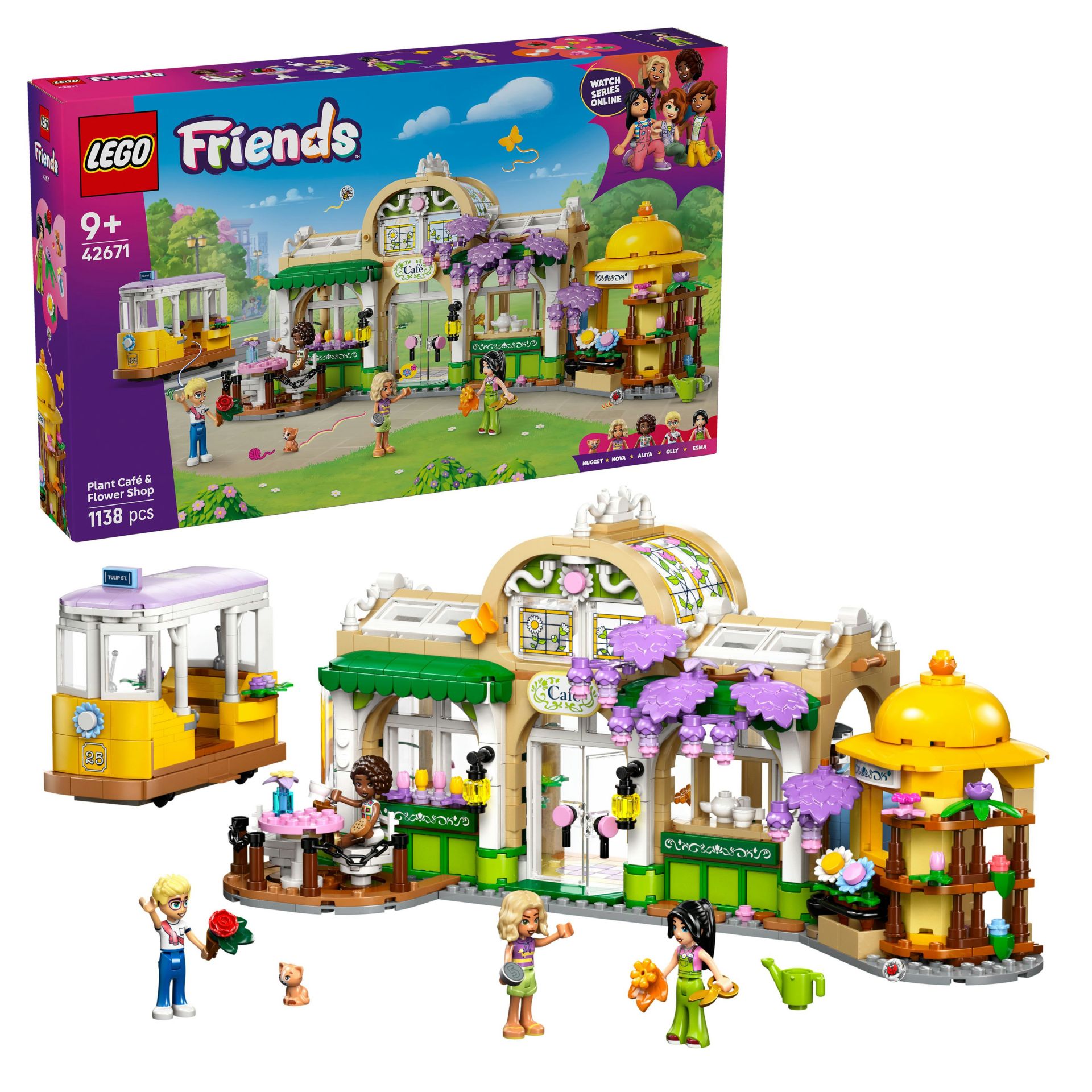 Ontdek allerlei bloemen en planten in deze set, die het verhaal vertelt van Aliya, Olly, Nova, Esma en Nugget de kat die graag afspreken bij de bloemenwinkel en het café. De set zit vol kenmerken voor creatieve verhalen. Er is een leuke tram voor de personages en een café met een zithoek buiten en een keuken met een koffiezetapparaat. Daarnaast vind je een bloemenkraam met boeketten en potplanten. Nadat kinderen met de set hebben gespeeld, kunnen ze het model op een plank of tafel neerzetten om er elke dag van te genieten.