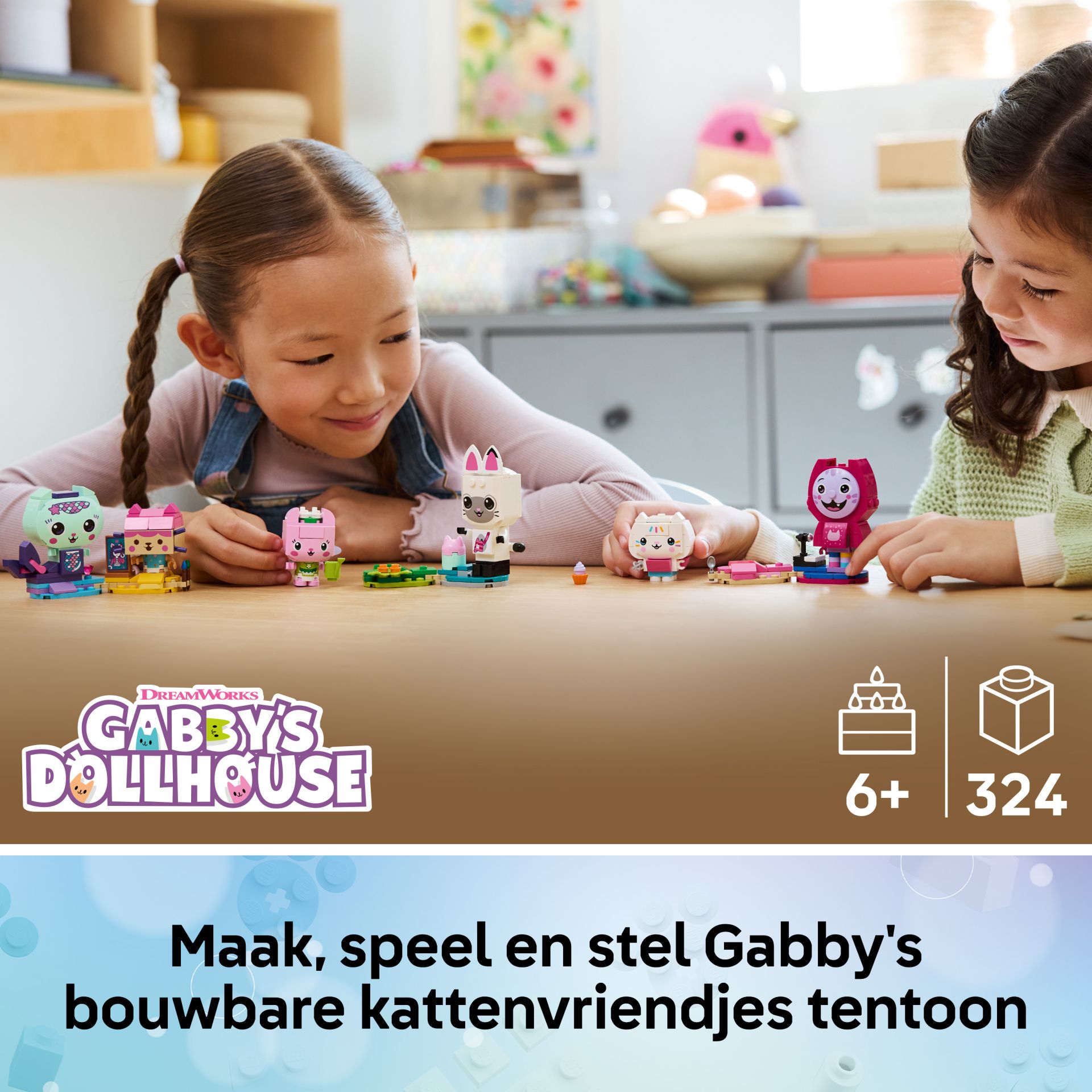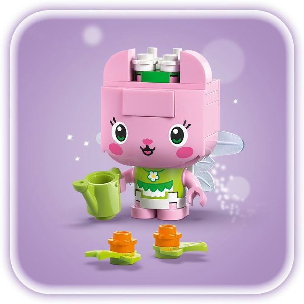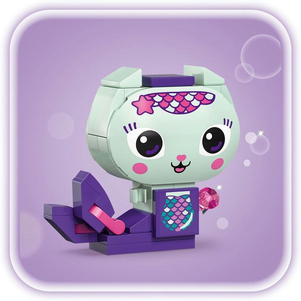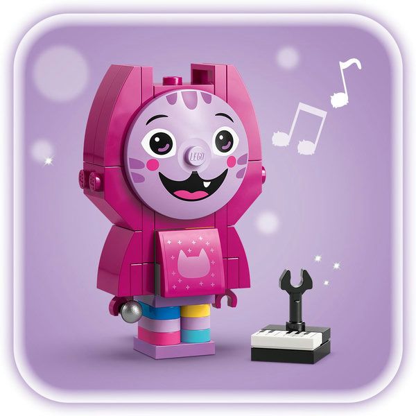 De set bevat 6 figuren om te bouwen, elk met accessoires uit de tv-serie. Meerminkat heeft een diamant, Babykitty heeft een schilderij van Gabby, Kitty Fee heeft een gieter, Pandy Poek heeft een poppenhuis, Cakey heeft een taart en Daniel James 'DJ' Kattenkruid heeft een piano. Er staan 2 afneembare figuren op elke bouwplaat. Deze set voor meisjes en jongens is een geweldige cadeautip voor fans van Gabby's poppenhuis. En met de LEGO® Builder app kunnen kinderen vol zelfvertrouwen bouwen. Hiermee kunnen ze inzoomen, de modellen in 3D draaien en hun voortgang bijhouden met eenvoudige digitale instructies. De set bevat 324 onderdelen.