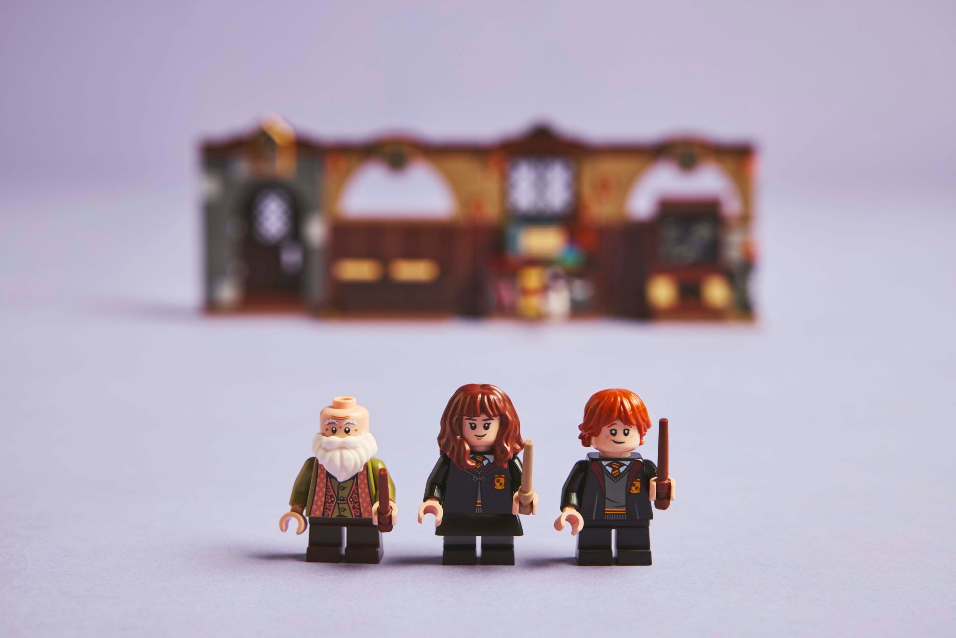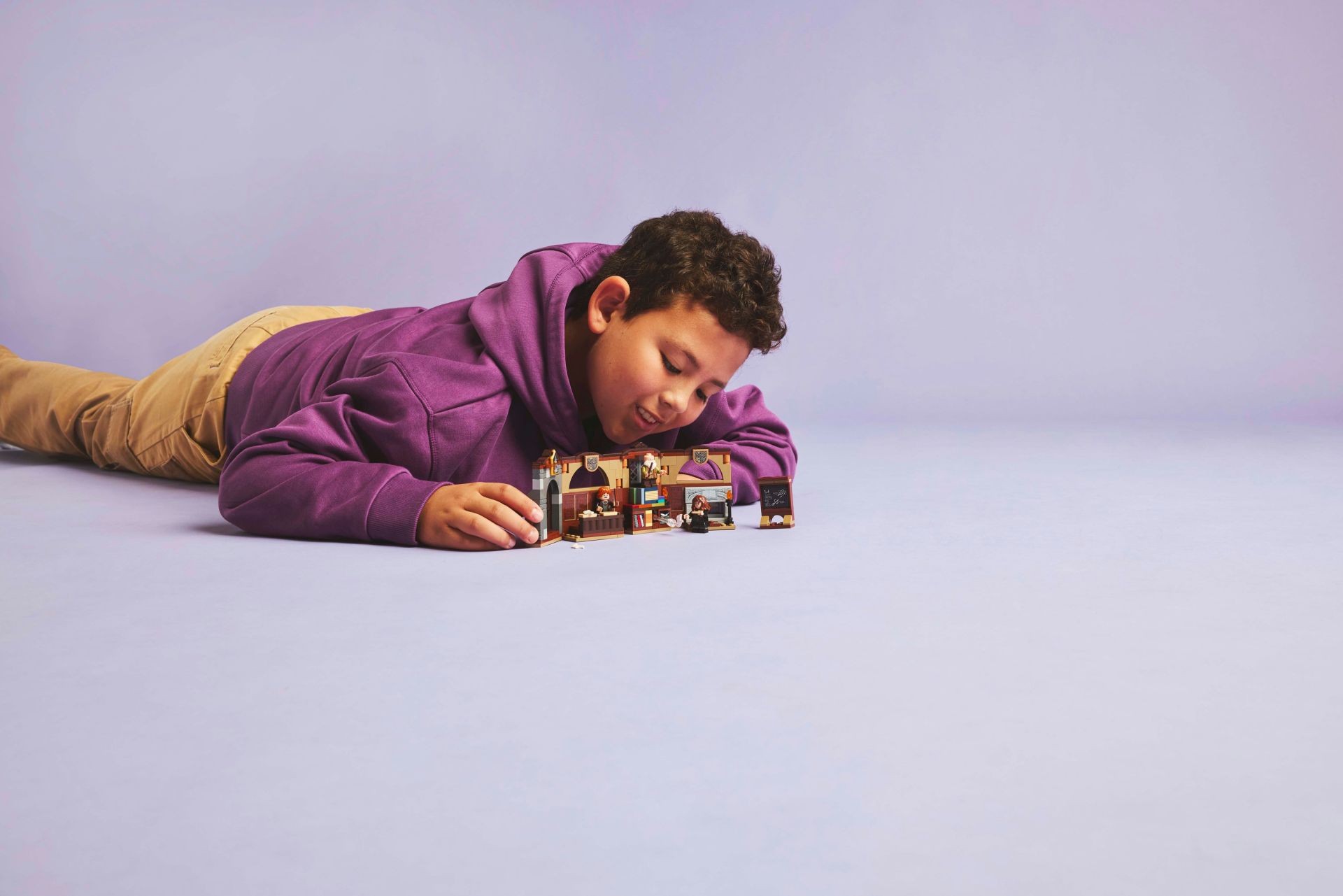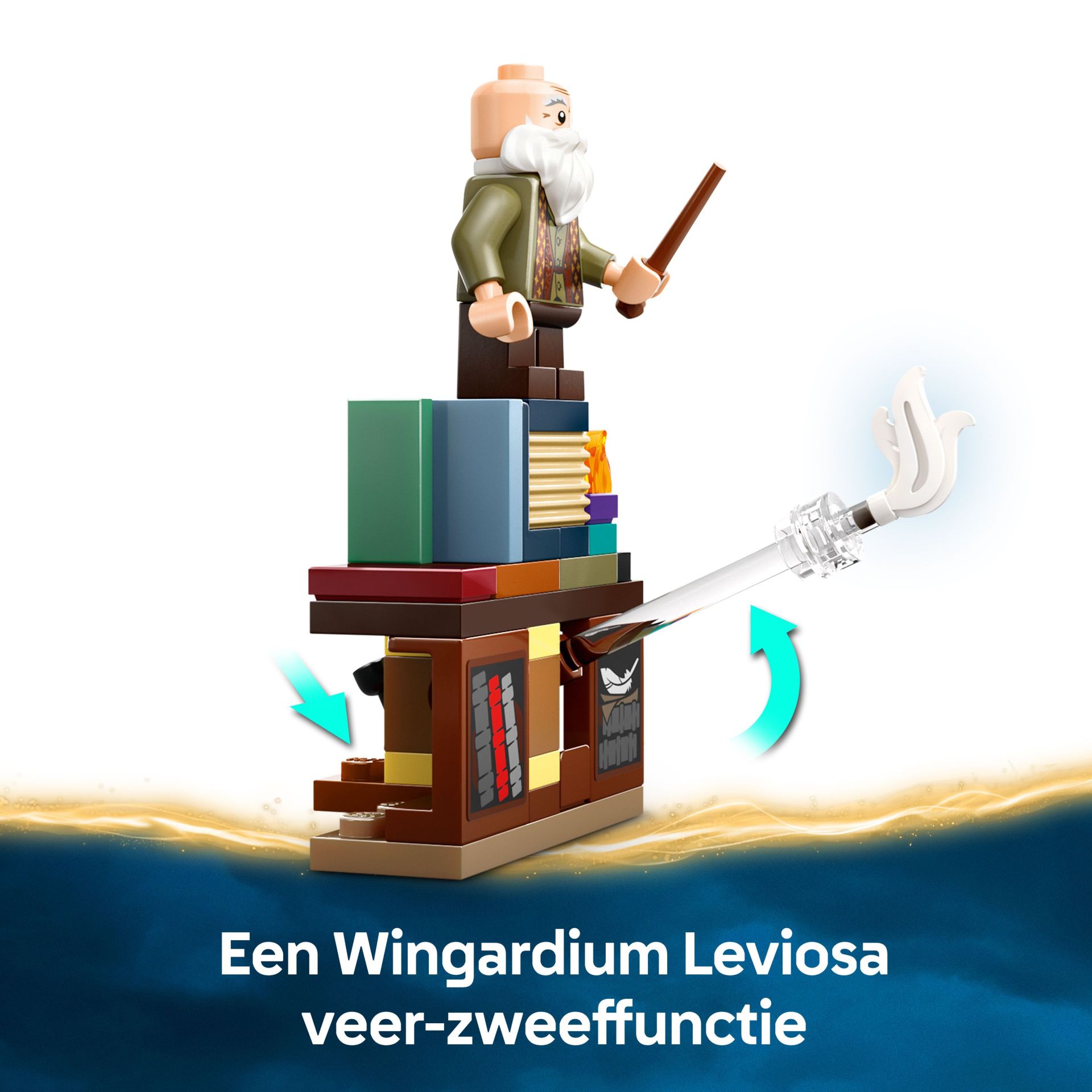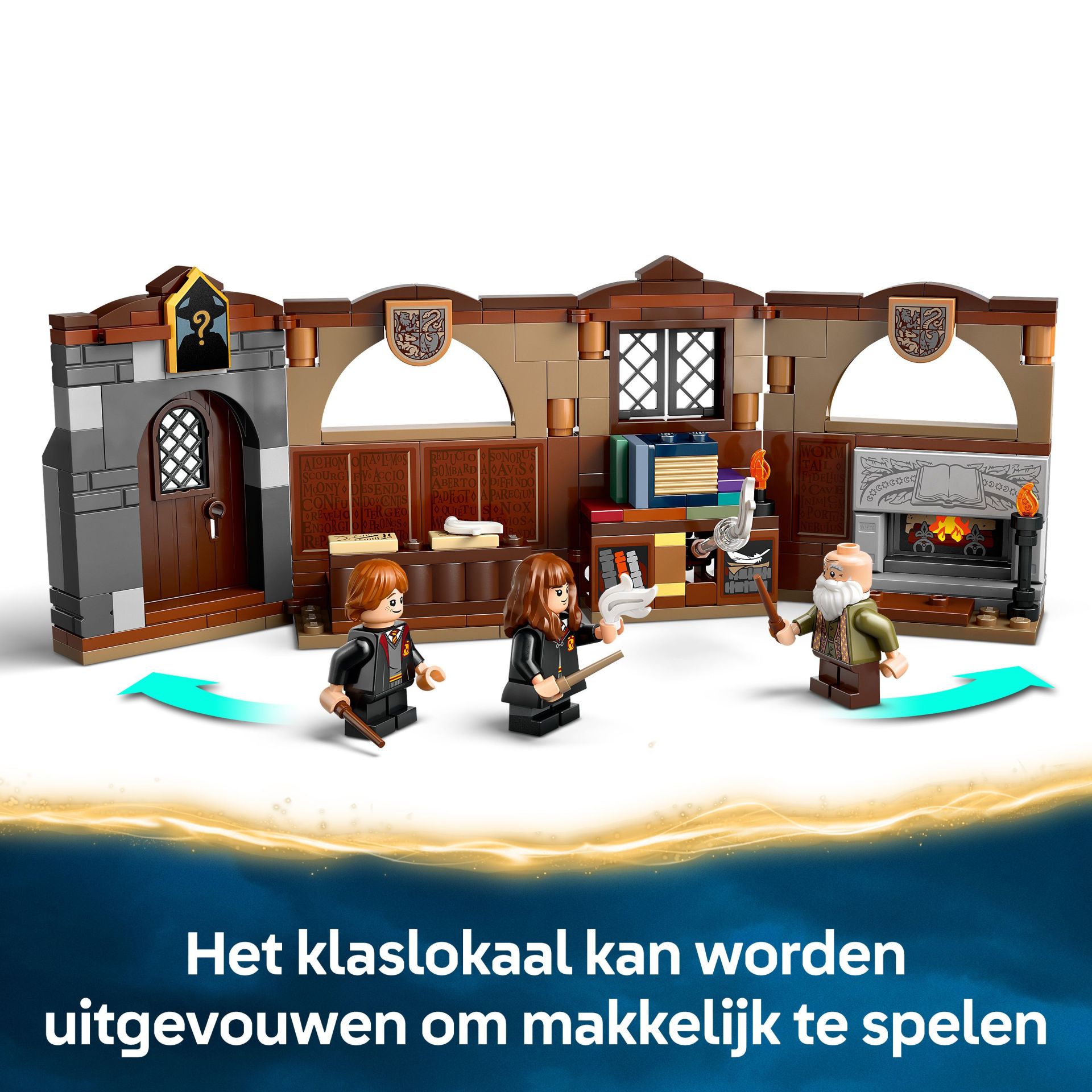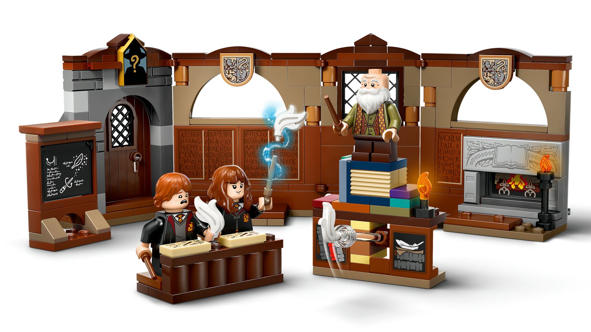 Het bouwbare Zweinstein klaslokaal kan worden opengevouwen om gemakkelijk te kunnen spelen en heeft een Wingardium Leviosa zweeffunctie voor de veer, uitneembare bureaus voor de leerlingen, een uitneembaar krijtbord met instructies voor spreuken en meer. Dit magische speelgoed bevat ook LEGO Harry Potter personages van Ron Wemel™, Hermelien Griffel™ en professor Banning om allerlei fantasierijke verhalen na te spelen.
