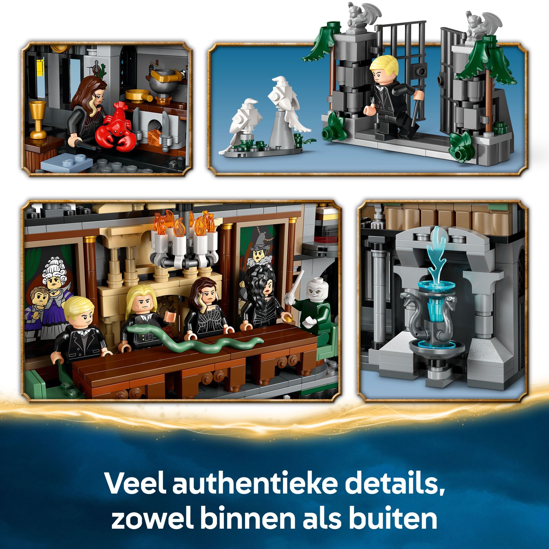 Magisch Harry Potter speelgoed voor fantasierijke rollenspelen – speelse details zijn onder andere een vallende kroonluchter, de bekende lange tafel in de salon, een cel om Harry Potter in op te sluiten en 2 trappen