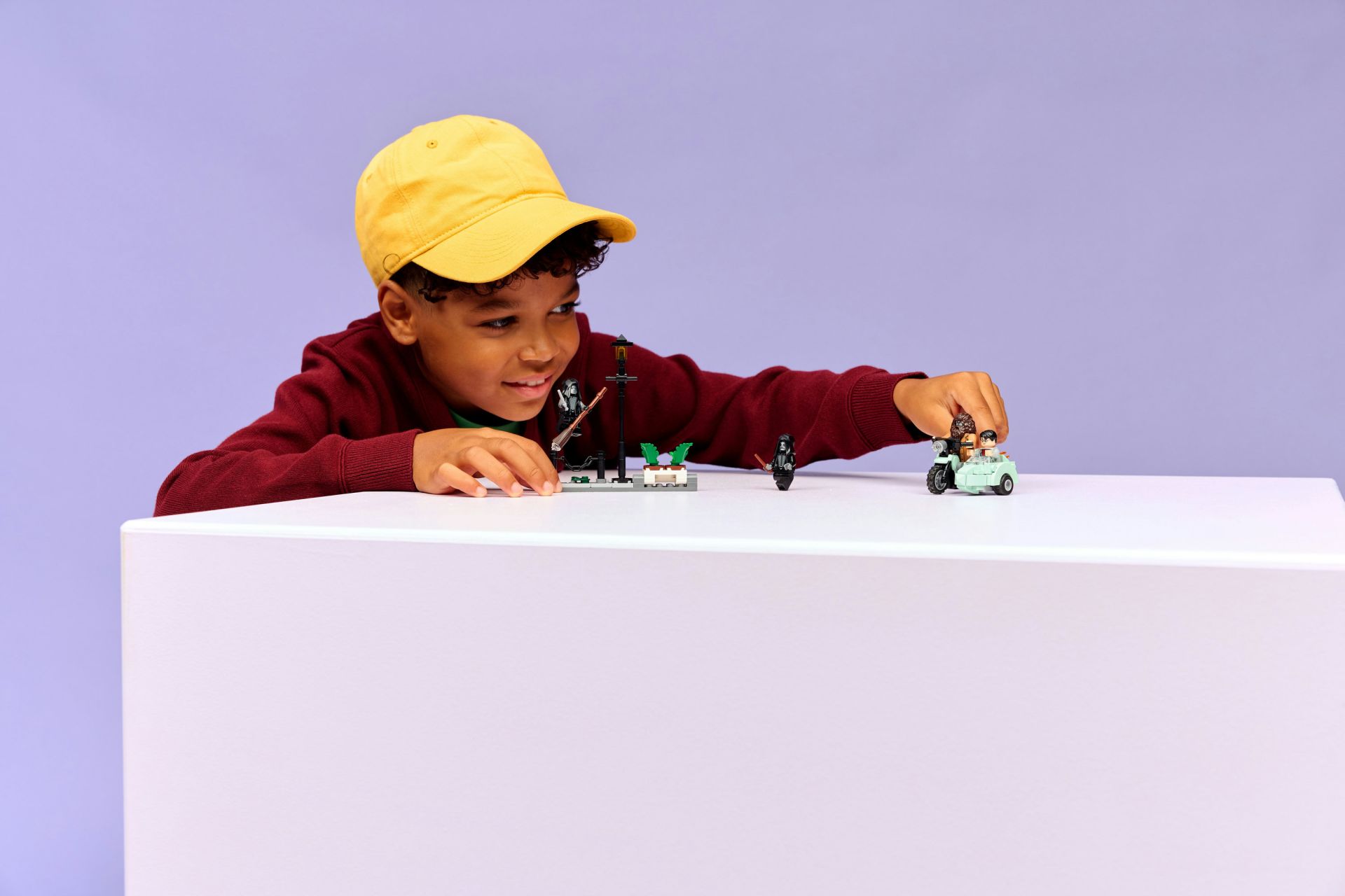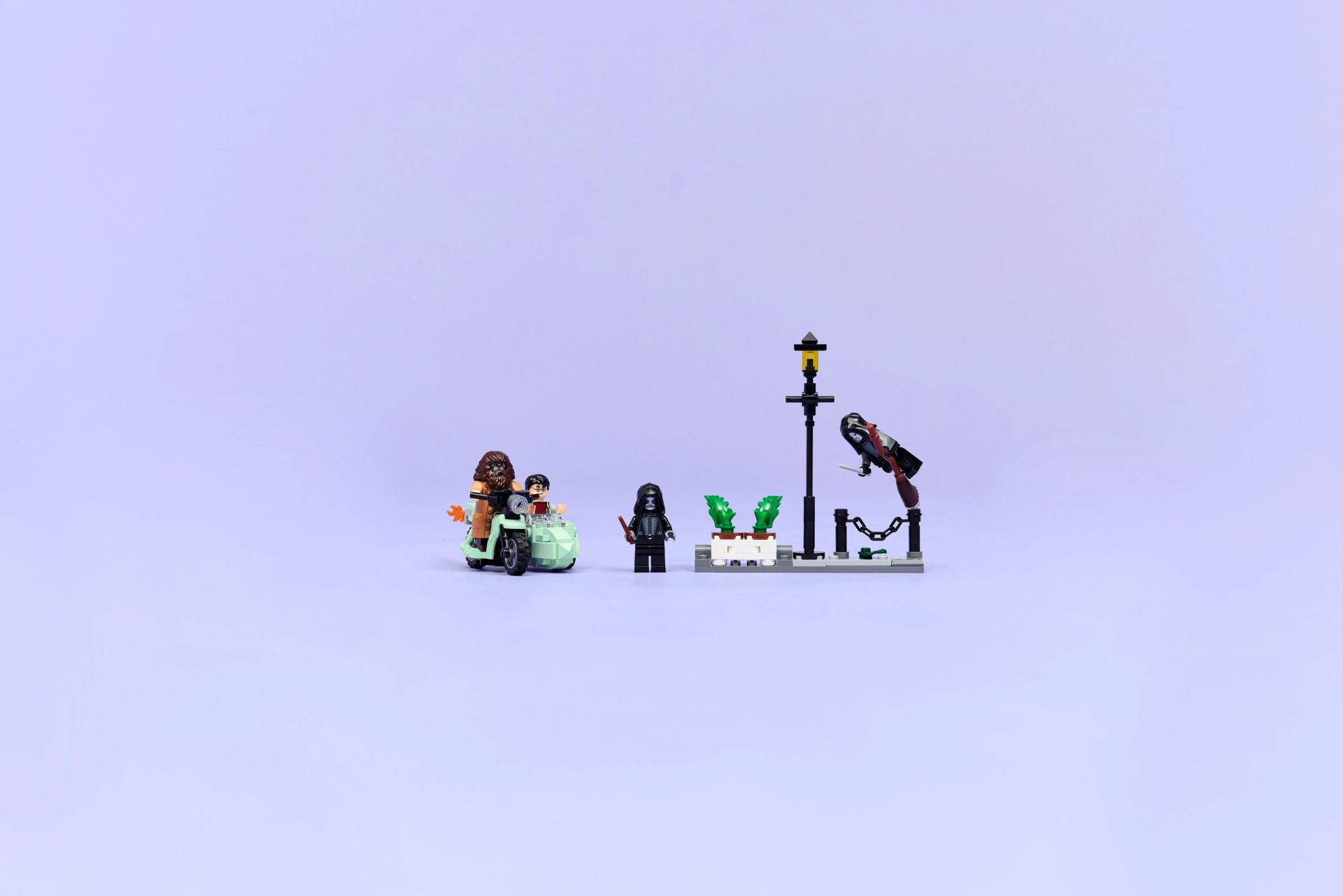 Zet de Rubeus Hagrid minifiguur op de motor en Harry Potter in het zijspan. Plaats de 2 minifiguren van Dooddoeners op de Ligusterlaan met een lantaarnpaal en een plantenbak met bloempotten, die is ontworpen om omgegooid te worden tijdens de spannende ontsnapping van de helden.