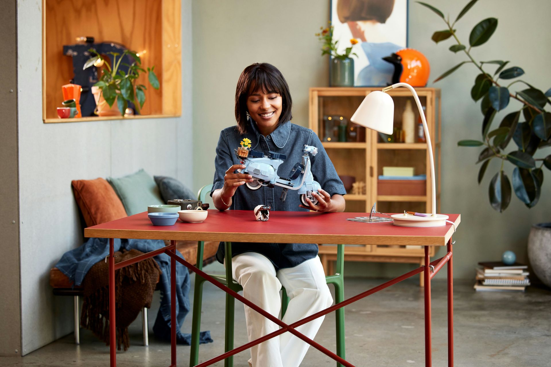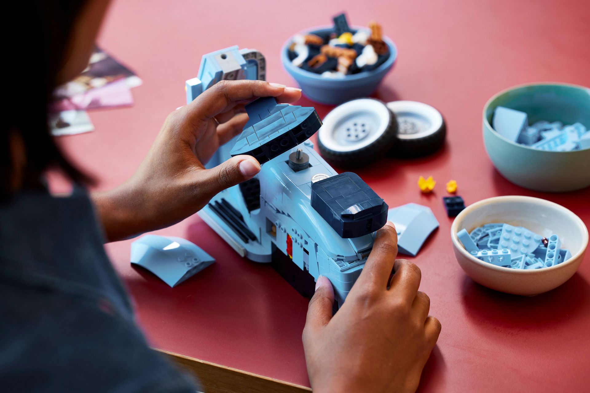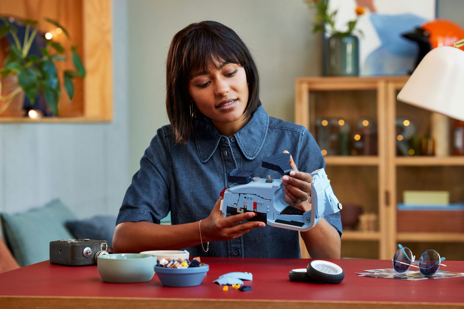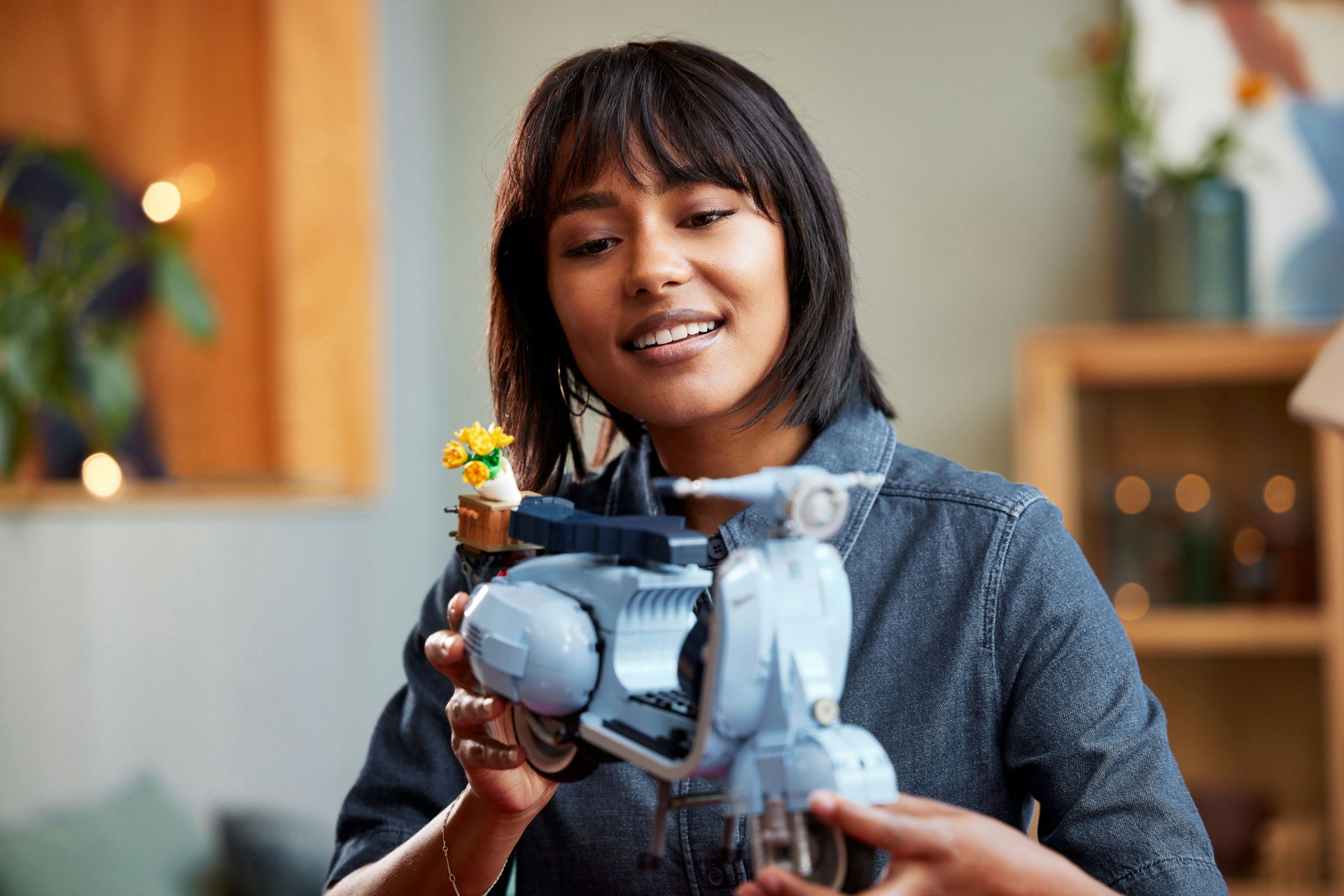Dit LEGO bouwpakket voor volwassenen bevat ook een helm en een accessoires mand met een boeket bloemen om te voltooien