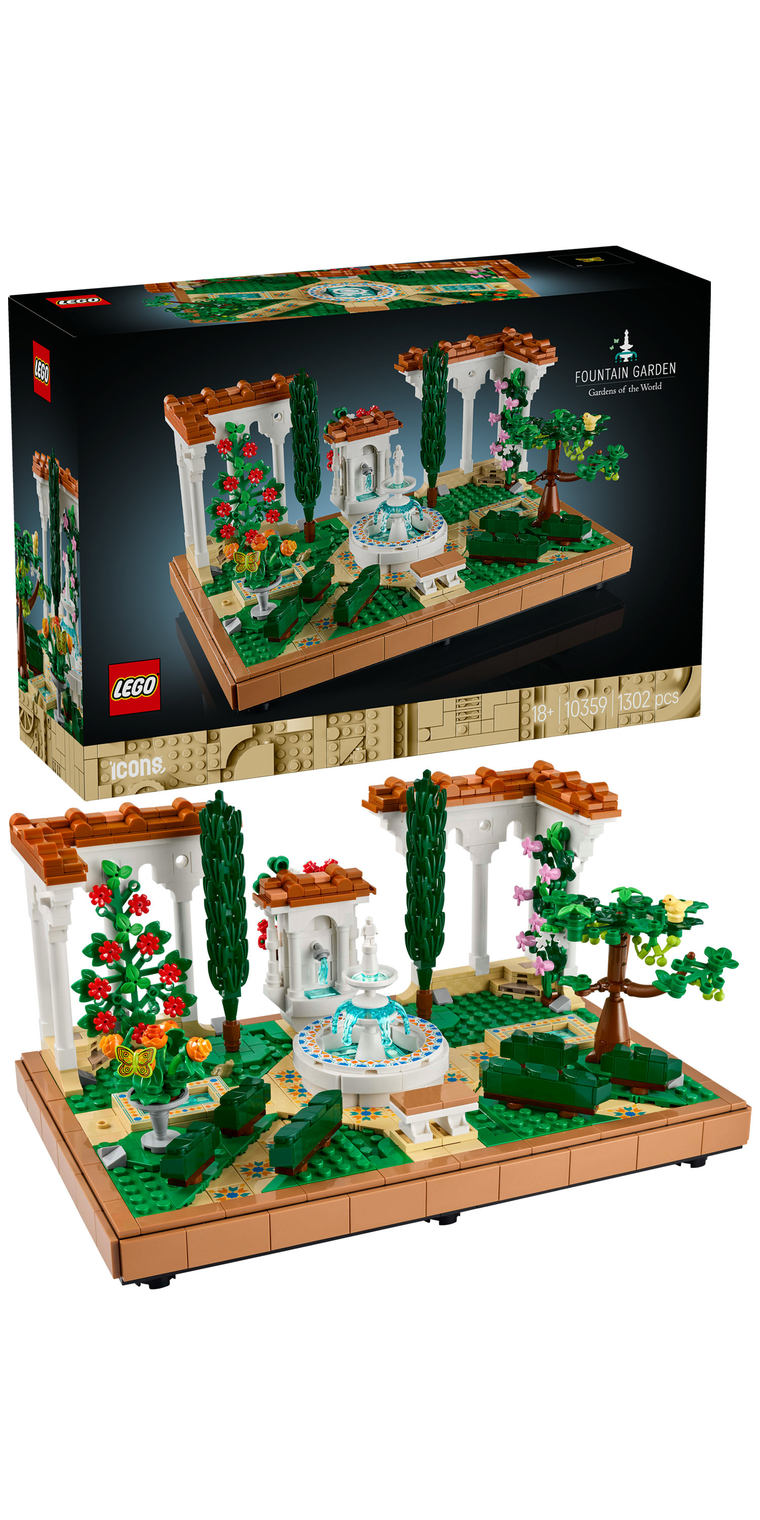Deze nieuwe set in de collectie Tuinen van de wereld is geïnspireerd op de schoonheid en diversiteit van landschapsarchitectuur en heeft een fraaie fontein, sierlijke lavabo, decoratief betegelde paden en klimplanten met bloemen rondom pergola's met witte zuilen en rode dakpannen. De tuin bevat een bloeiende wijnstok, 2 cipressen, een rode geranium, witte petunia's, rode hibiscus, roze bougainvillea en goudsbloemen, plus dierenfiguren van een vogel, kikker en maanvlinder.
