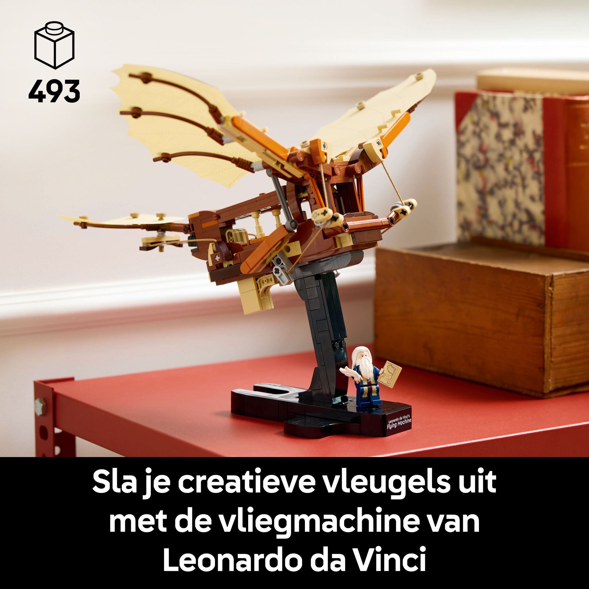 Wat zit er in de doos – alles wat je nodig hebt om een gedetailleerde LEGO versie van Da Vinci's visionaire ornithopter te maken, plus een displaystandaard en een minifiguur van Leonardo da Vinci met een ganzenveer en schets