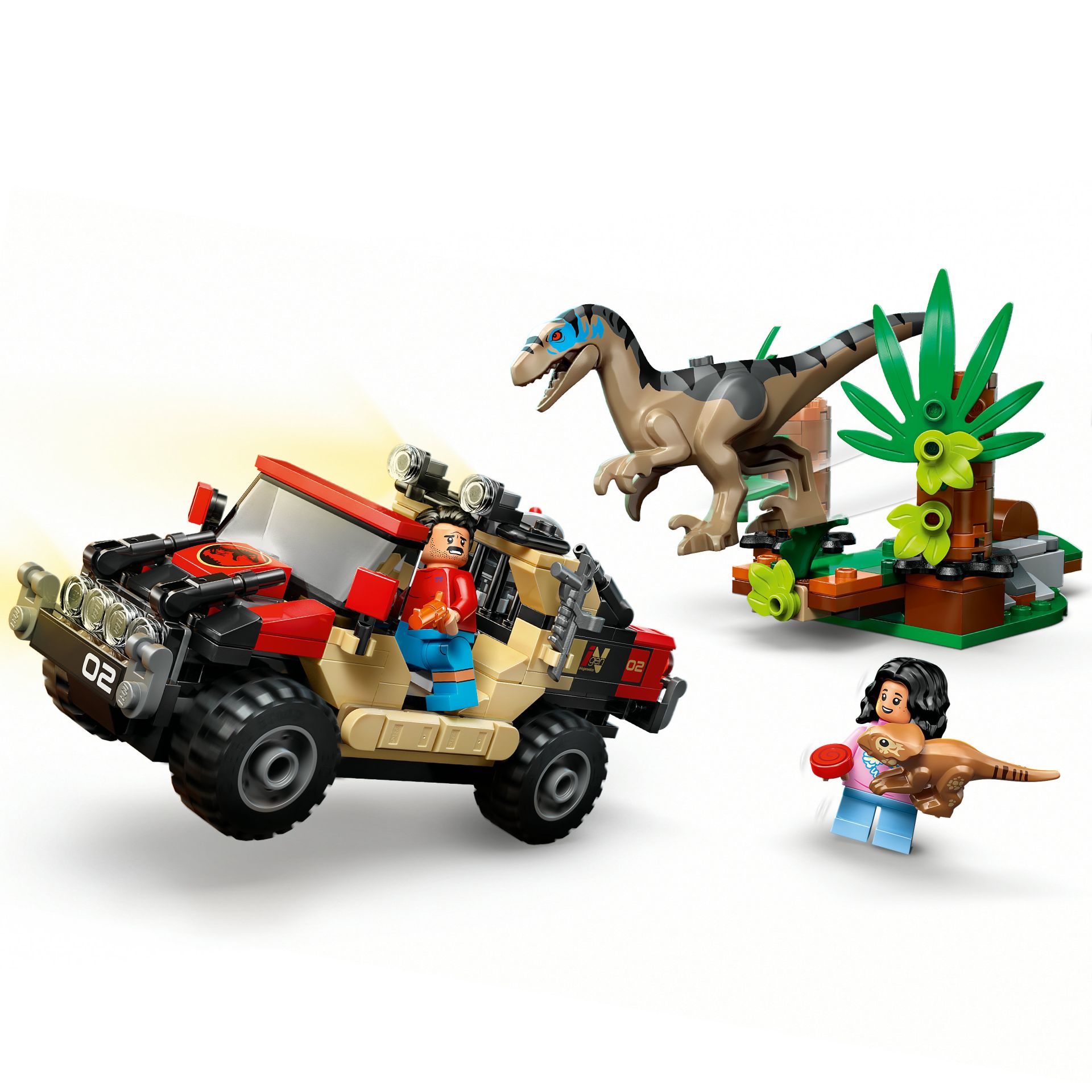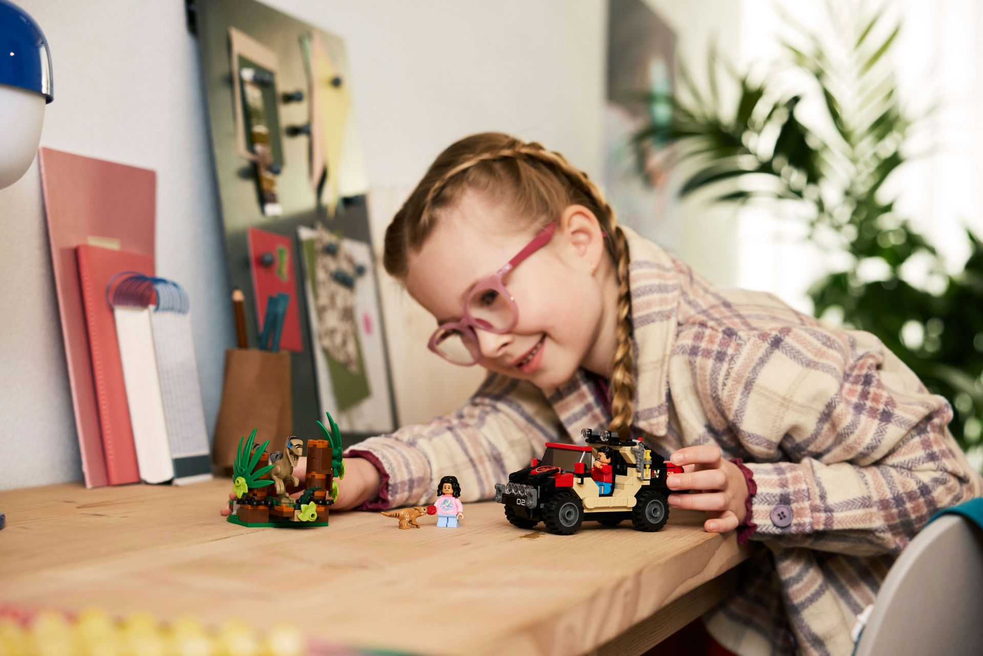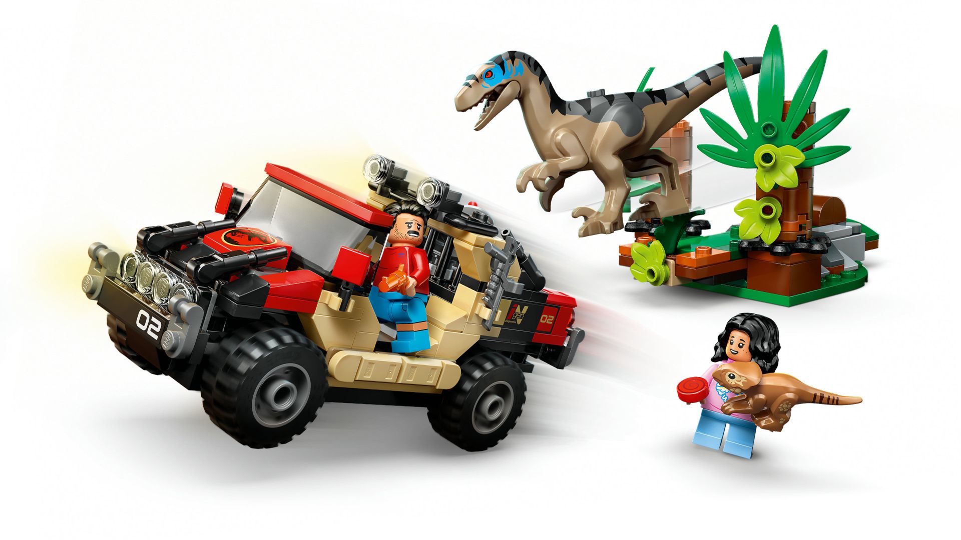 LEGO dinosaurus set – inclusief voorgevormde LEGO dino figuren van een baby Aquilops en een Velociraptor, plus een offroad auto en minifiguren van Reuben en Isabella voor leuke achtervolgingsavonturen