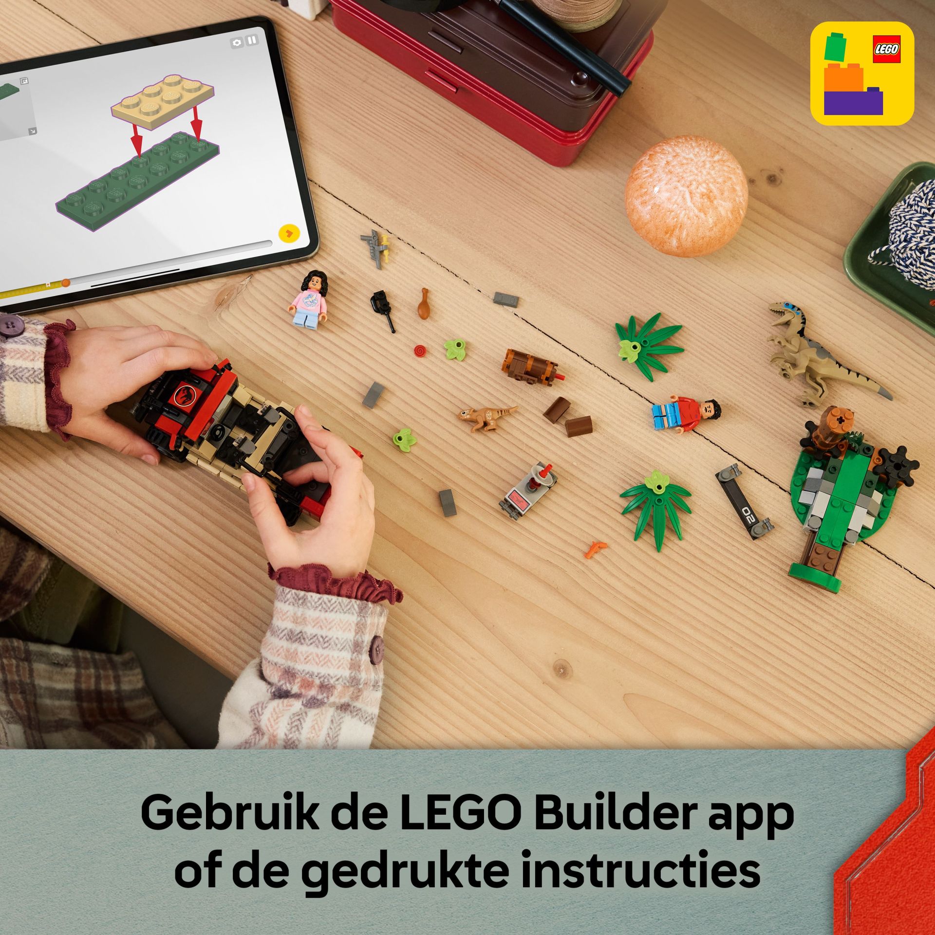 De LEGO Builder app begeleidt jonge fans op een intuïtief bouwavontuur, waarbij ze kunnen inzoomen en modellen in 3D kunnen draaien, sets kunnen opslaan en hun voortgang kunnen bijhouden. De set kan worden gecombineerd met andere LEGO sets of LEGO Jurassic World bouwsets (elk apart verkrijgbaar). Zowel kinderen als volwassenen zullen dol zijn op de 'verrassingsfunctie' die een extra dimensie toevoegt aan de speelervaring. De set bevat 285 onderdelen.