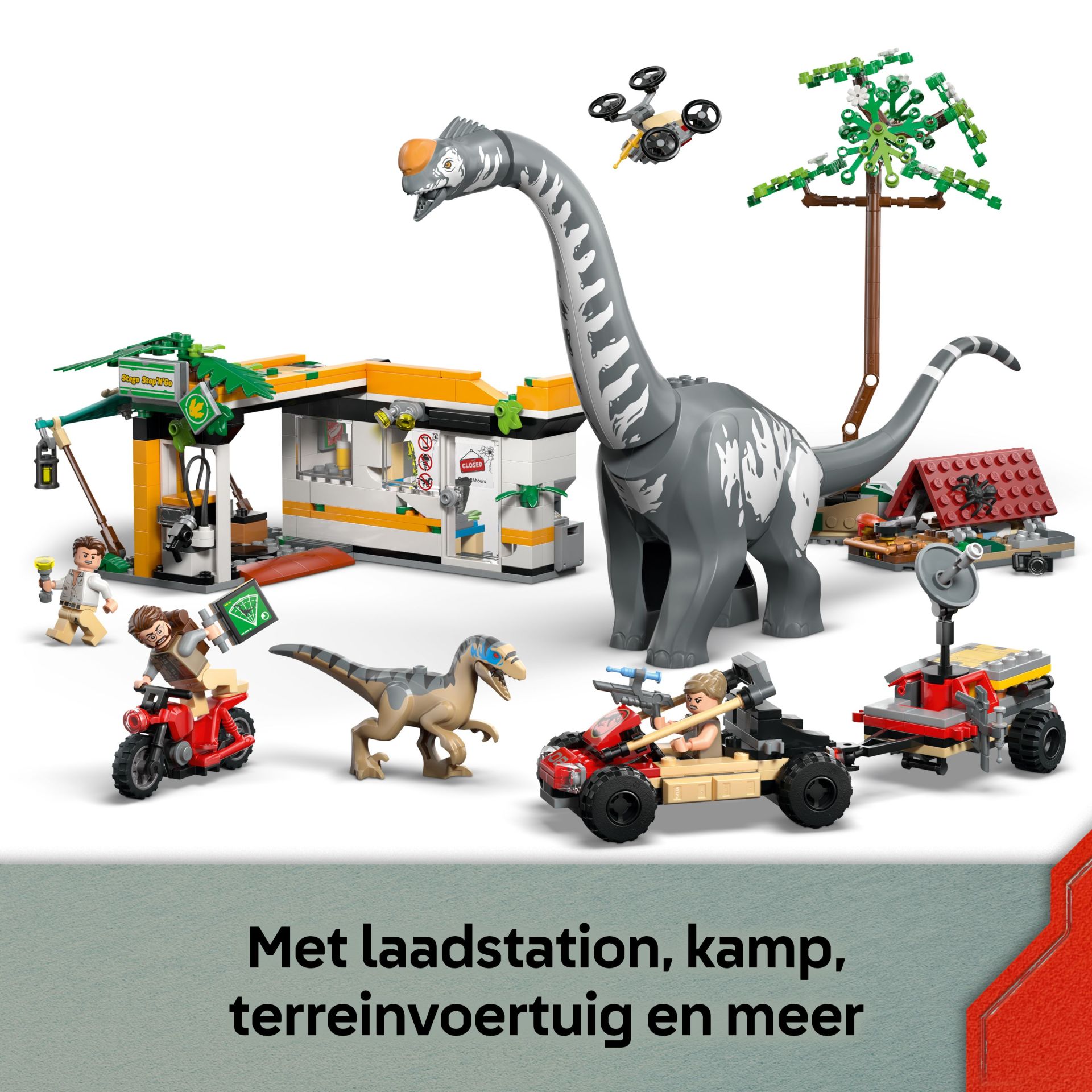Gedetailleerde LEGO dino en offroad auto speelset – deze LEGO Jurassic World set bevat een 'oplaadstation', accessoires voor verhalen, een kampeerterrein met boom, een kleine speelgoedmotor, een drone en een terreinwagen met aanhanger