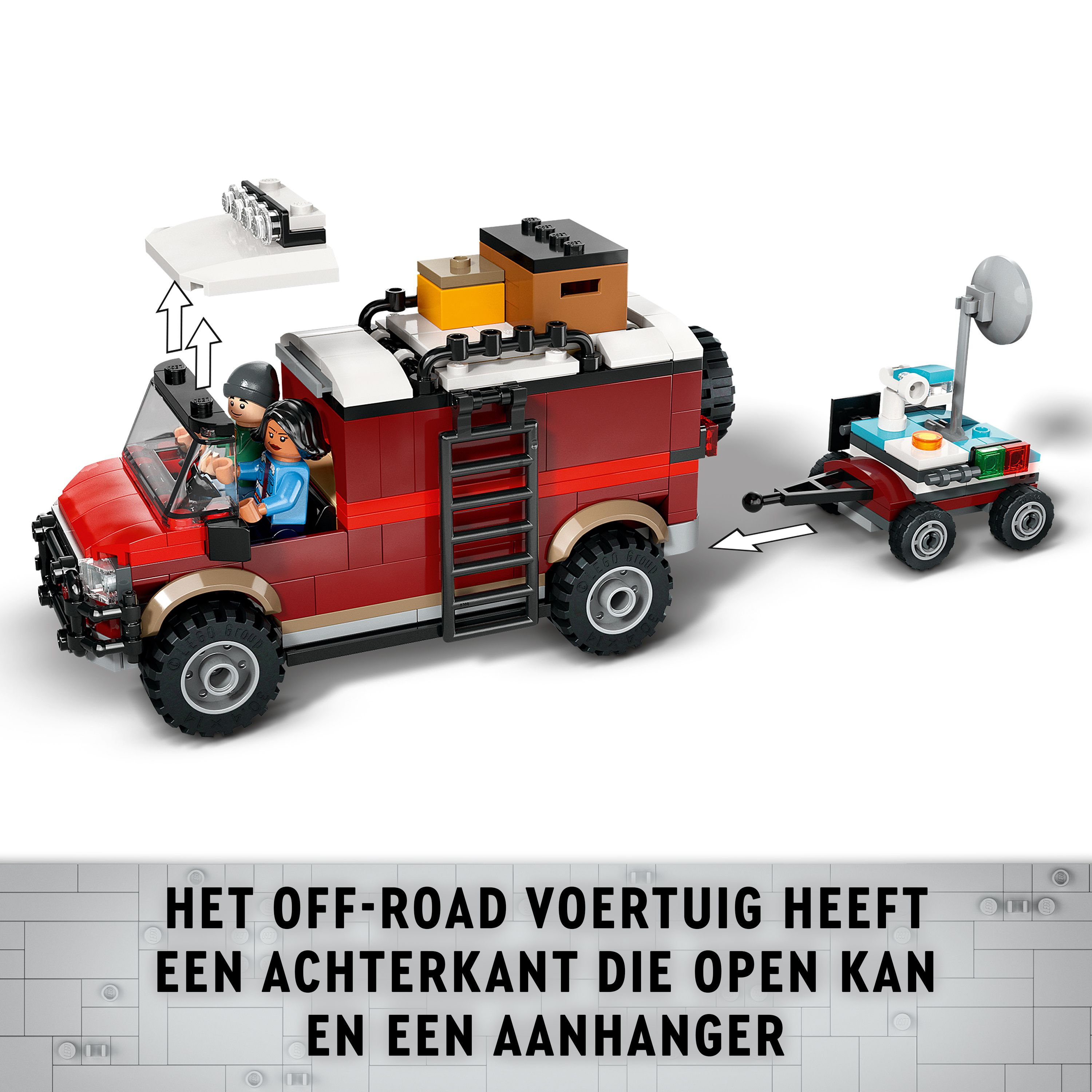 Afneembaar dak van de cabine, bed en aanhangwagen.