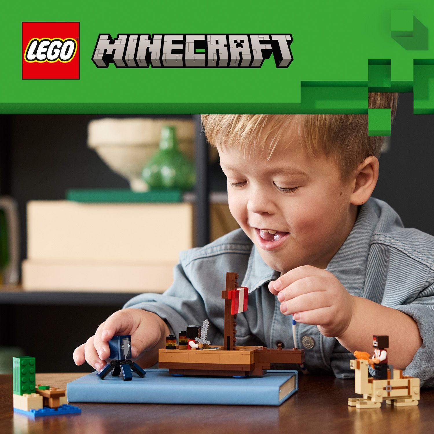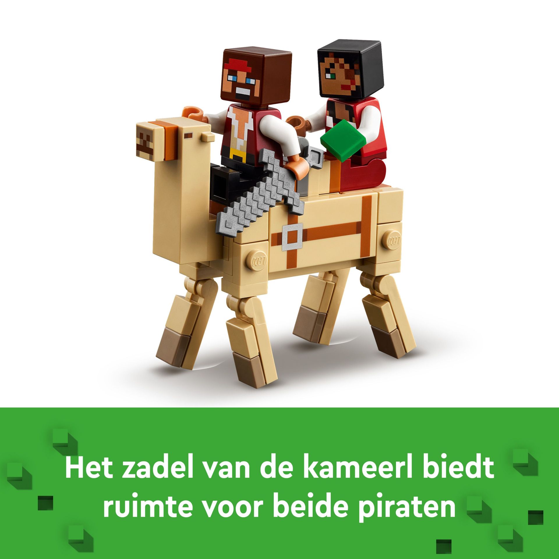 Het zadel van de kameel biedt ruimte voor beide piraten om naar hun volgende avontuur te rijden. De accessoires, waaronder een vis, een kaart, een ijzeren zwaard en een cactus, stimuleren fantasierijk spel. De set is eenvoudig te combineren met andere LEGO Minecraft sets (apart verkrijgbaar) voor nog meer speelmogelijkheden.