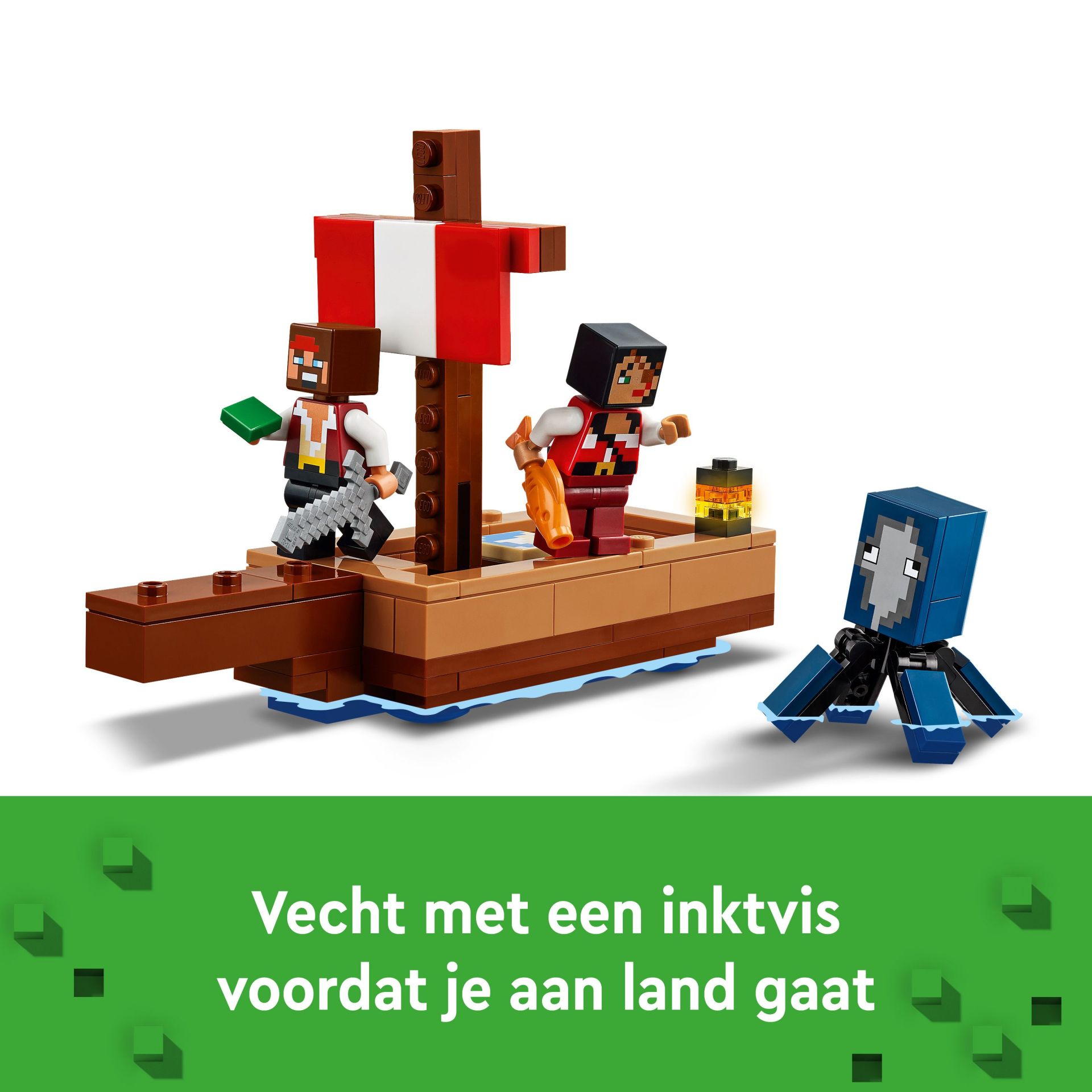 De piratenschipreis (21259) is een LEGO® Minecraft® avonturenset met piratenfiguren om mee te spelen of te combineren met andere sets (apart verkrijgbaar) voor een nog leukere speelervaring. Deze speelset met een piratenschip is een veelzijdig, praktisch videogamecadeau voor Minecraft spelers en kinderen vanaf 8 jaar die van speelgoedboten en bouwplezier houden.Deze avontuurlijke LEGO Minecraft piratenset bevat een bouwbaar speelgoedvoertuig plus een inktvis, kameel, 2 piratenfiguren en accessoires. Met piraten, een boot en de allereerste verschijning van een volwassen LEGO Minecraft kameel zal deze speciale LEGO set Minecraft fans zeker aanspreken.
