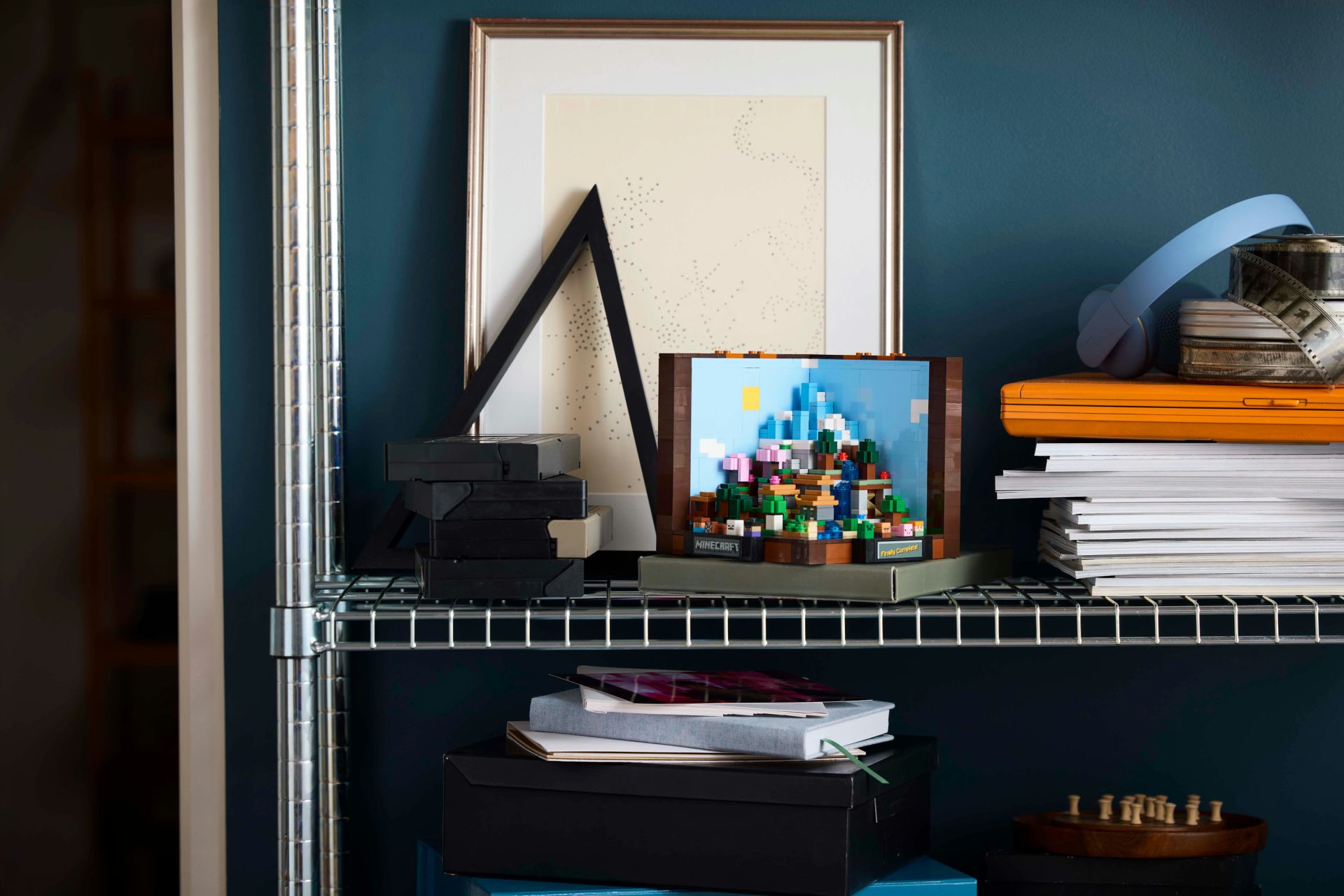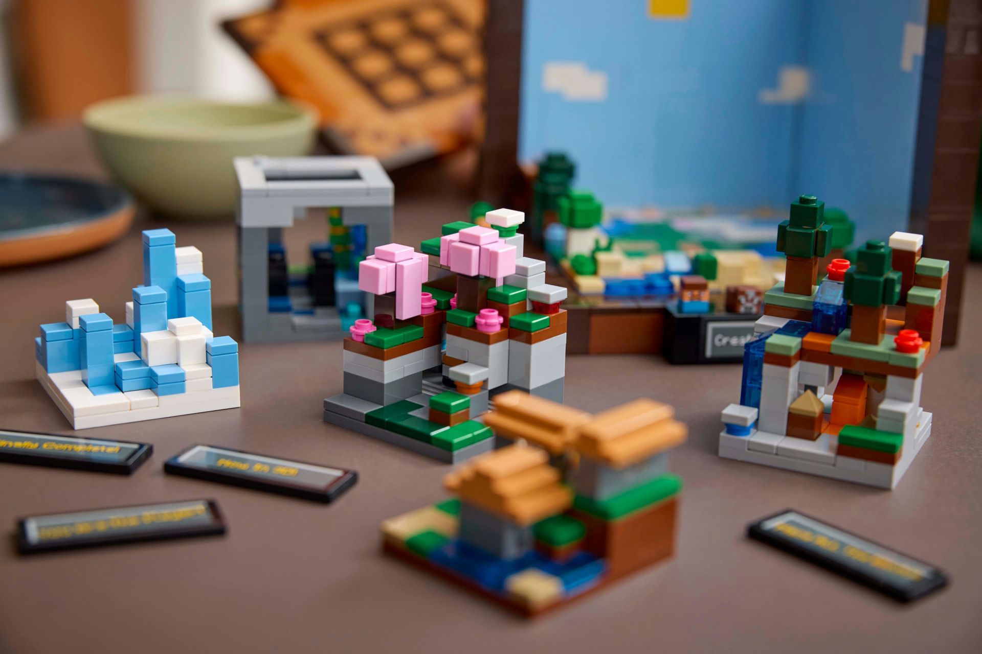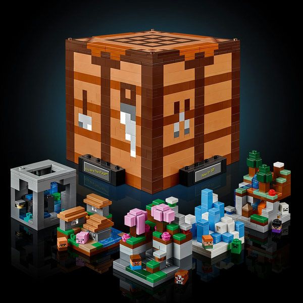 Het model is een weergave van de bekende werkbank uit de game. Hierin vind je 5 minibouwmodules met 12 Minecraft biomen, waaronder de Taiga met een druipsteengrot, vlakte met een dorp, ijspijlers met een iglo, kersenbos met een verlaten mijnschacht en het Duister met een weelderige grot. Er zijn ook 8 microfiguren inbegrepen: Steve, Alex, een skelet, heks, Creeper™, dorpeling, koe en varken. De minimodellen en microfiguren kunnen uit het hoofdmodel worden gehaald voor diverse displaymogelijkheden. Versier de voorkant van het Minecraft model met stickers met bekende teksten uit het spel. Voor het gemak kun je ook een digitale versie van de bouwinstructies van de set vinden in de LEGO Builder app.