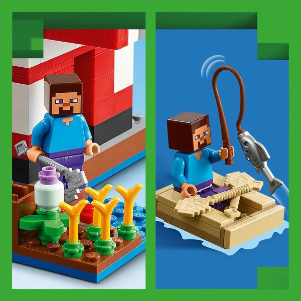 Dit LEGO Minecraft speelgoed met een LEGO huis bevat het populaire Minecraft personage Steve, maar ook een rode Mooshroom, een baby Mooshroom, een bruine Mooshroom, een lapjeskat en het vijandige vliegende fantoom. De speelset zit boordevol elementen uit de game, waaronder een klein perceel met tarwe, paddenstoelen en een bekerplant die naast een compostbak groeit. Inclusief accessoires zoals een hengel, een kabeljauw, een schoffel, een Netherieten zwaard, een kom, een boot met roeispanen, een kist, een oven, een werkbank, een boekenplank, brood en een bed.