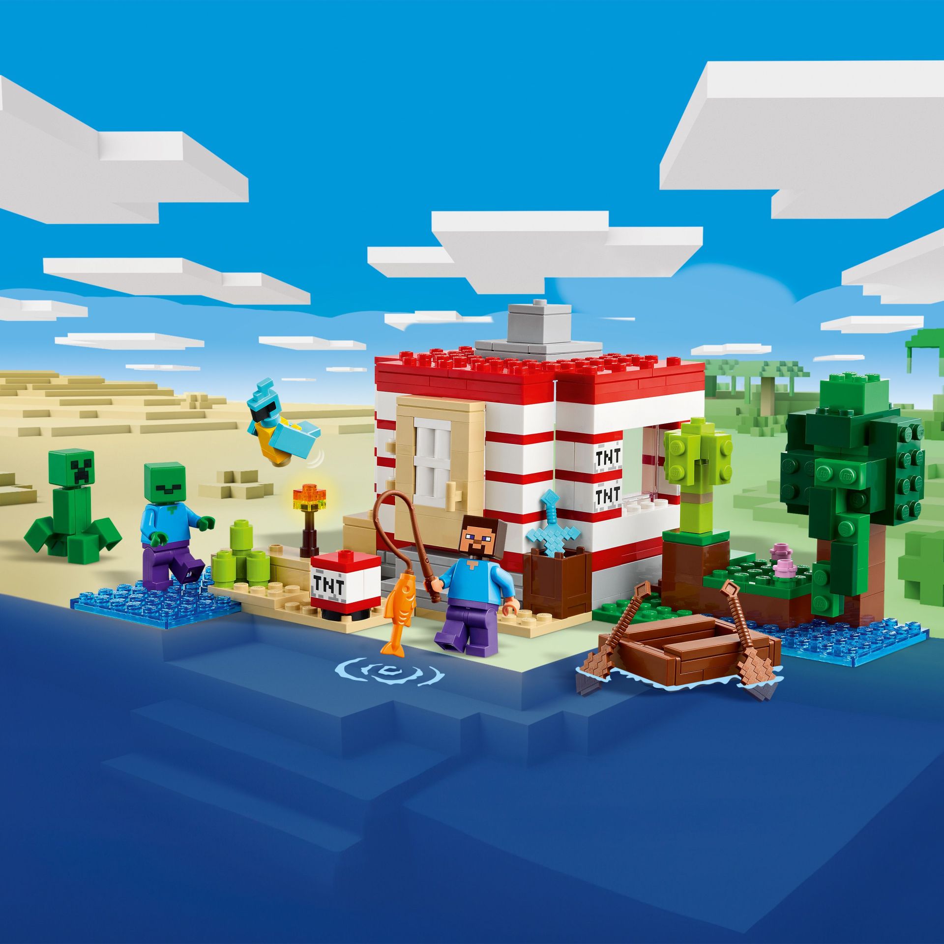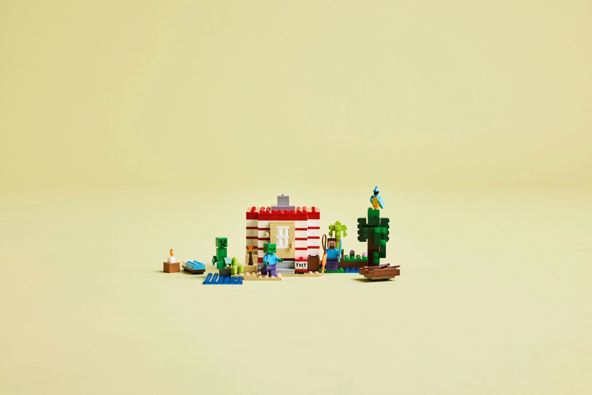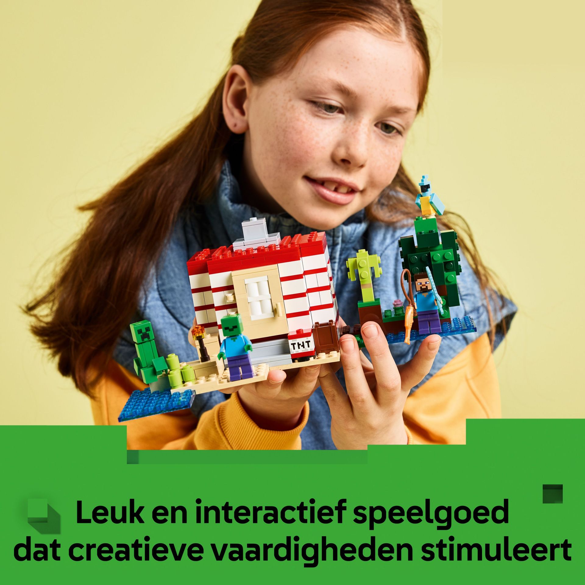 Het bouwbare huis bevindt zich in het Minecraft junglebioom en ziet eruit als een grote versie van het bekende TNT-element uit de game. Met een schakelaar aan de zijkant kunnen kinderen een exploderende TNT-functie activeren, die het hele huis laat instorten. Als het stof is neergedaald, kunnen ze het huis herbouwen zodat het klaar is voor hun volgende avontuur. Minifiguren van Steve, een Creeper™ en een zombie stimuleren fantasierijk spel. Inclusief authentieke LEGO Minecraft accessoires waaronder een boot, een hengel, een vis, een papegaai en junglegebladerte. Met de LEGO® Builder app kunnen kinderen met hun apparaat inzoomen op hun model en dit in 3D draaien. Bevat 287 onderdelen.